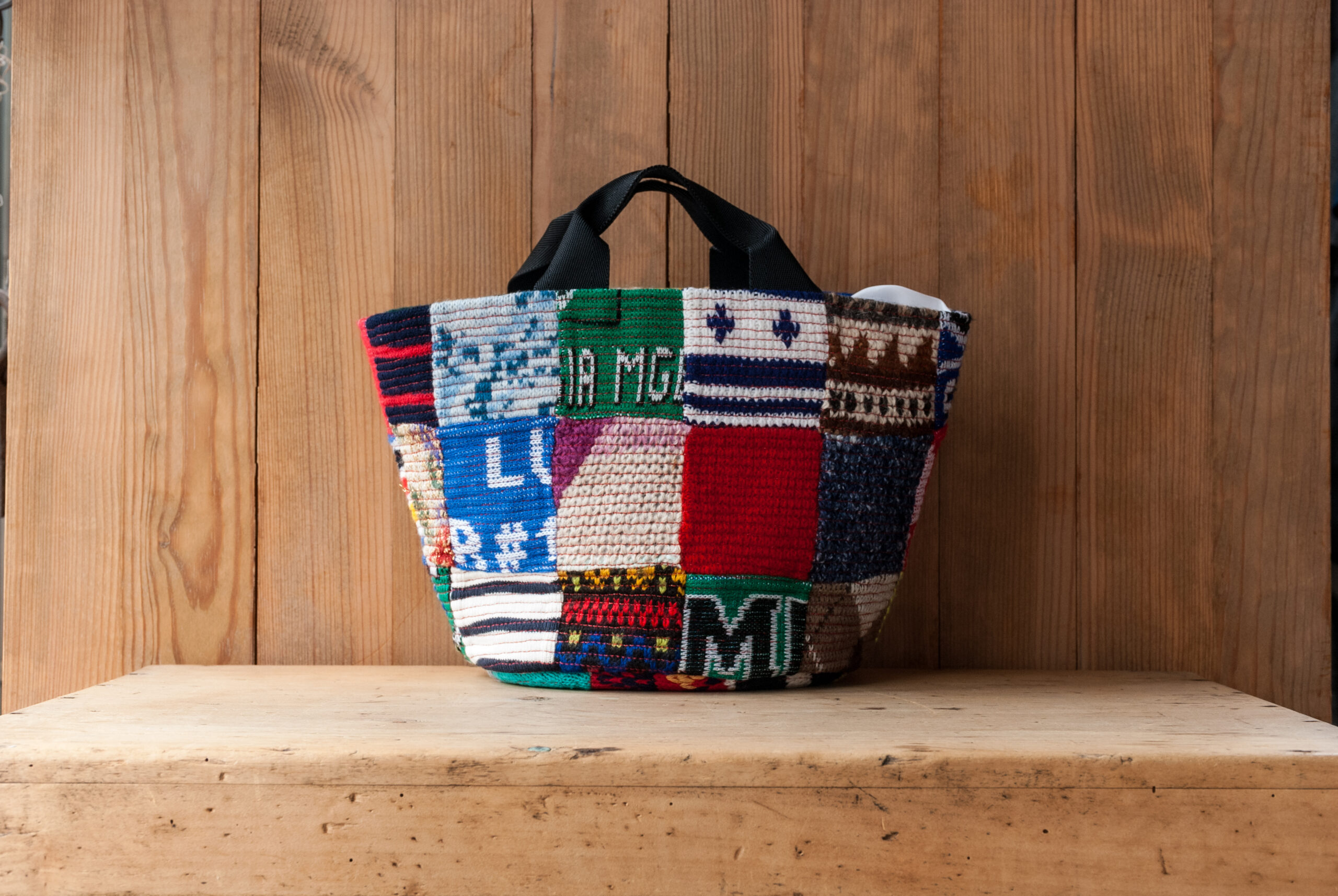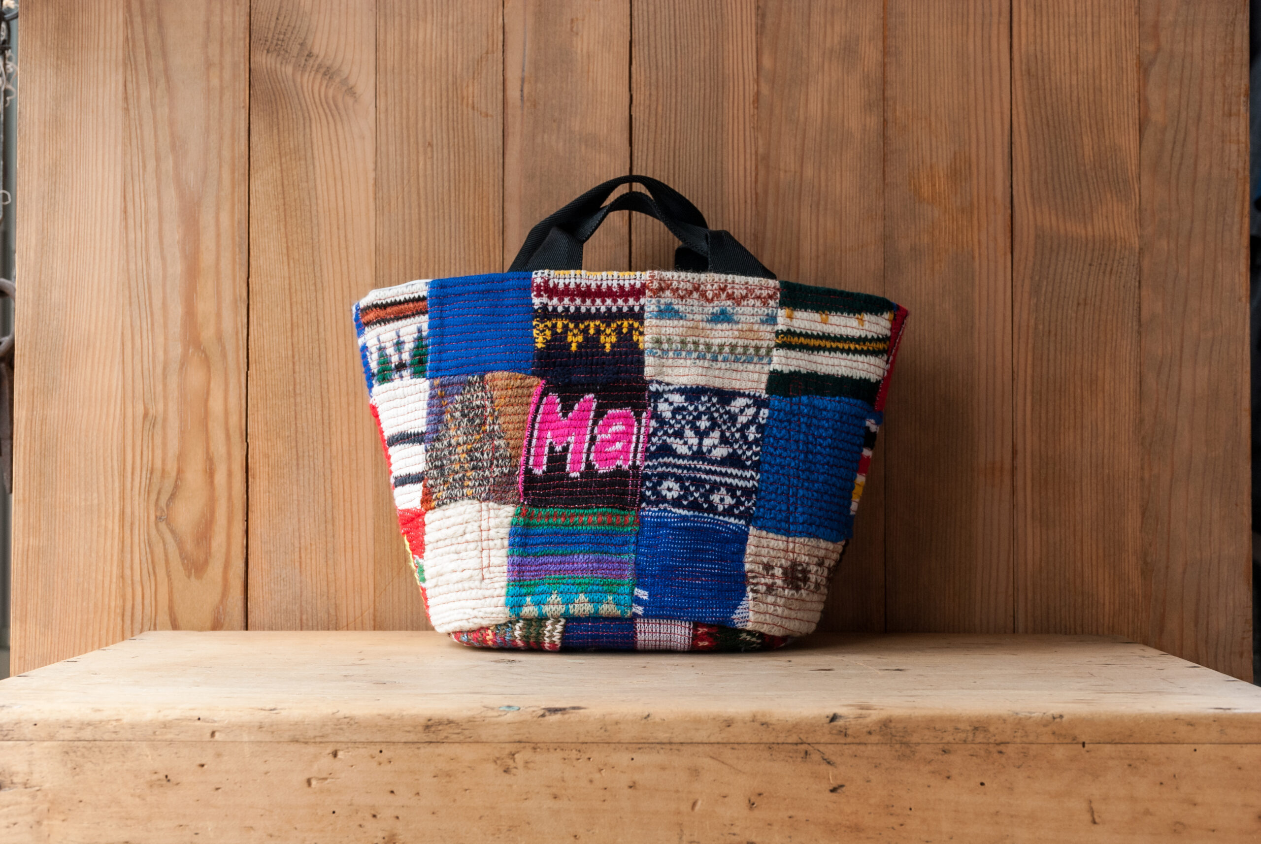 マルチカラーに使われているセーターは、世界中から集められたいろんなジャンルのビンテージセーターが使われているので、POPで色彩が楽しい。