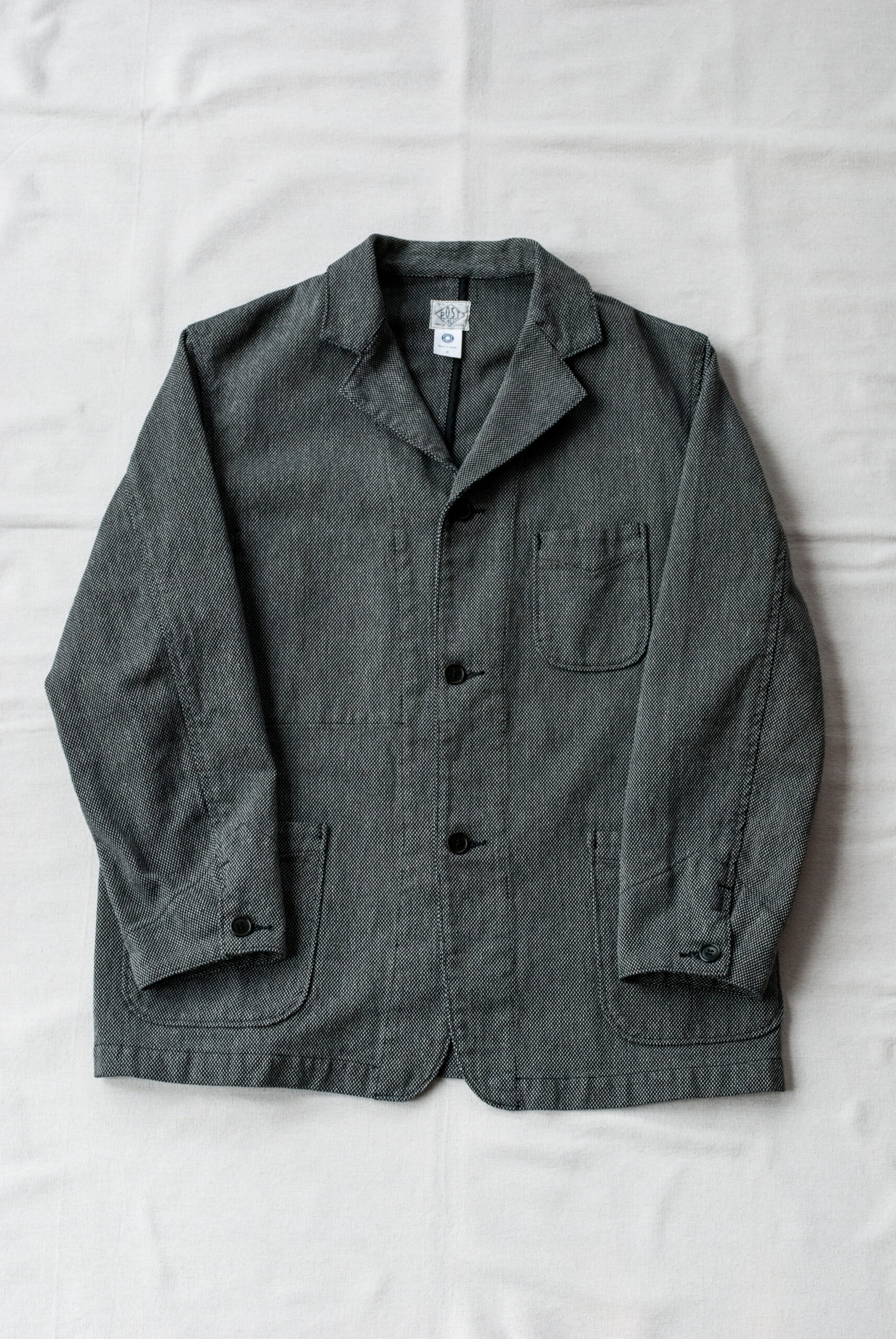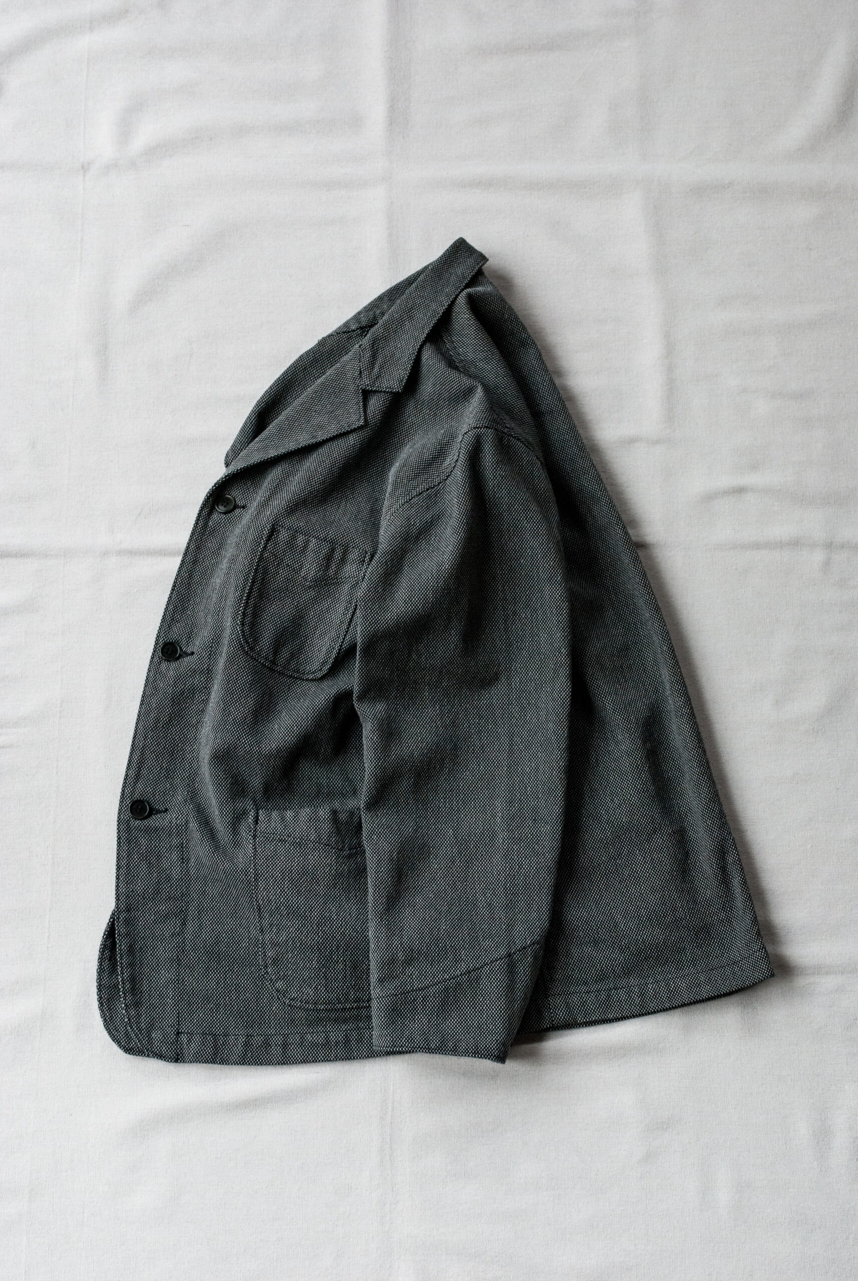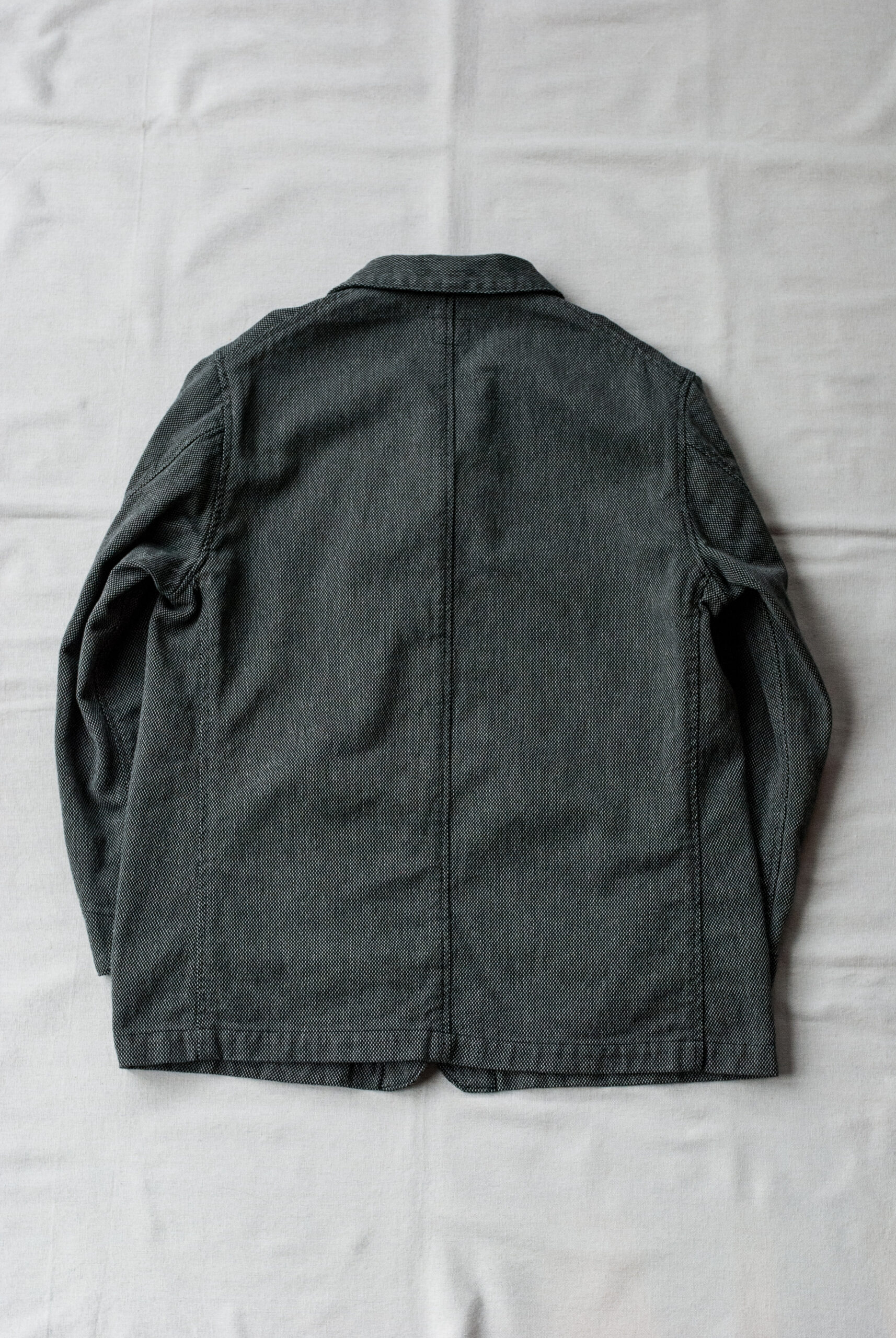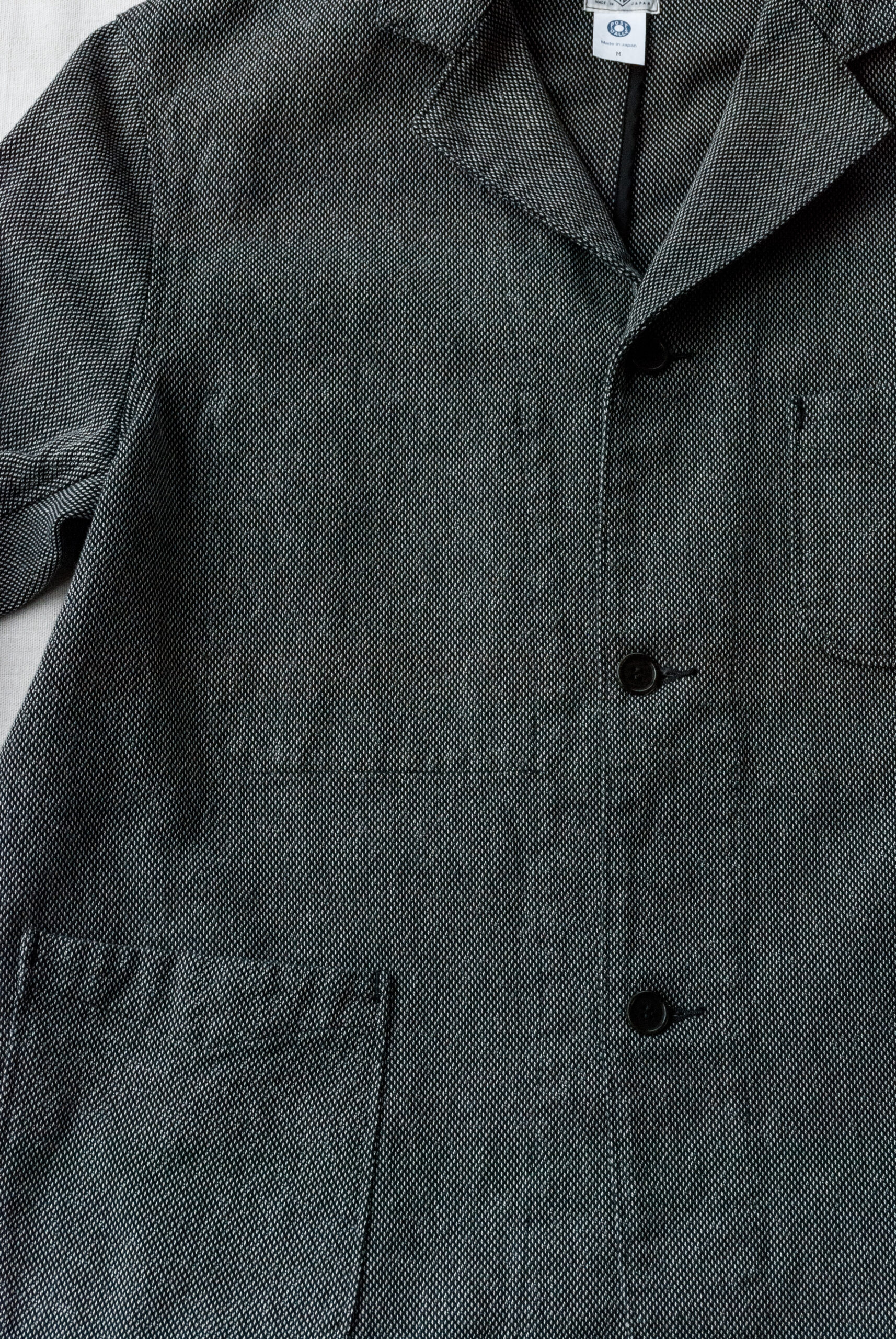 近くで見ると柄、離れて見ると無地のような少し変わった生地感ですが、黒糸と白糸、間にグレーの糸が絡んでいるので、結果的にとても落ち着いたチャコールグレーのジャケットになっています。