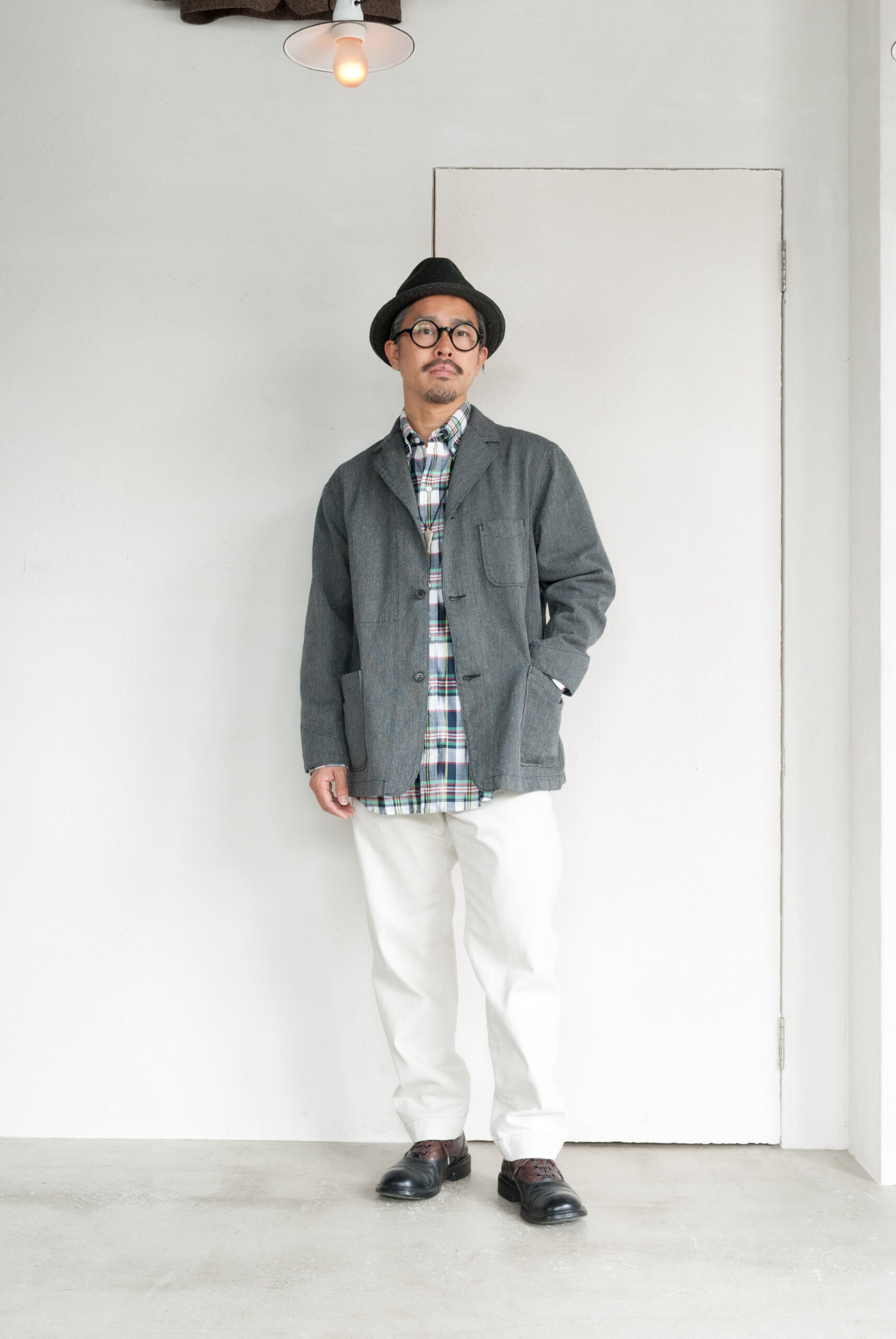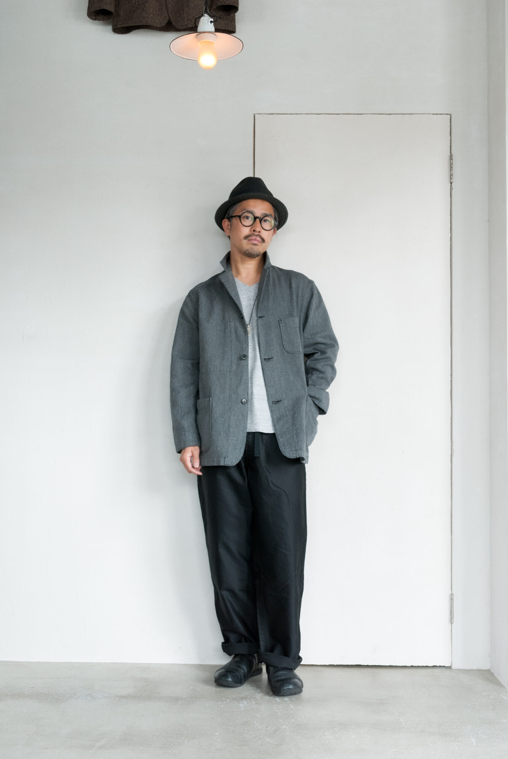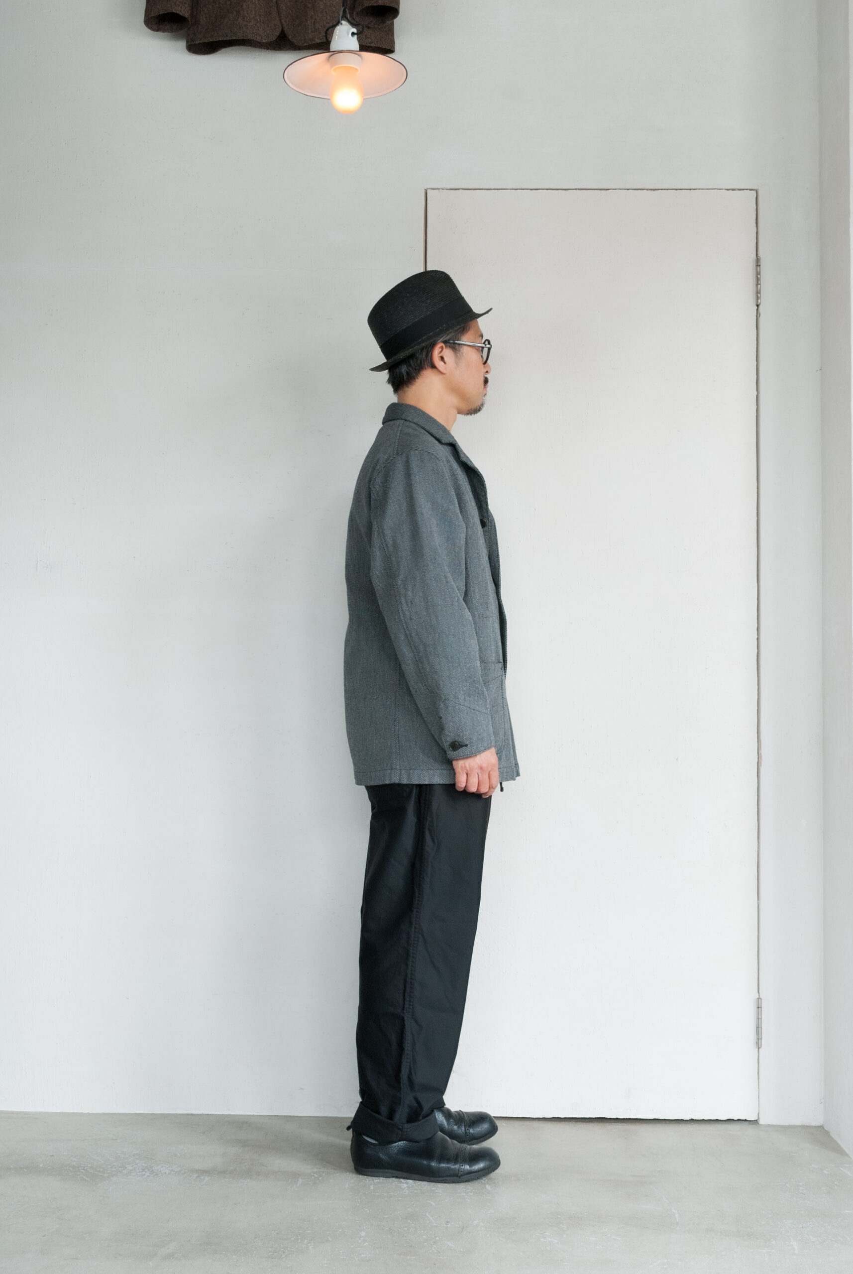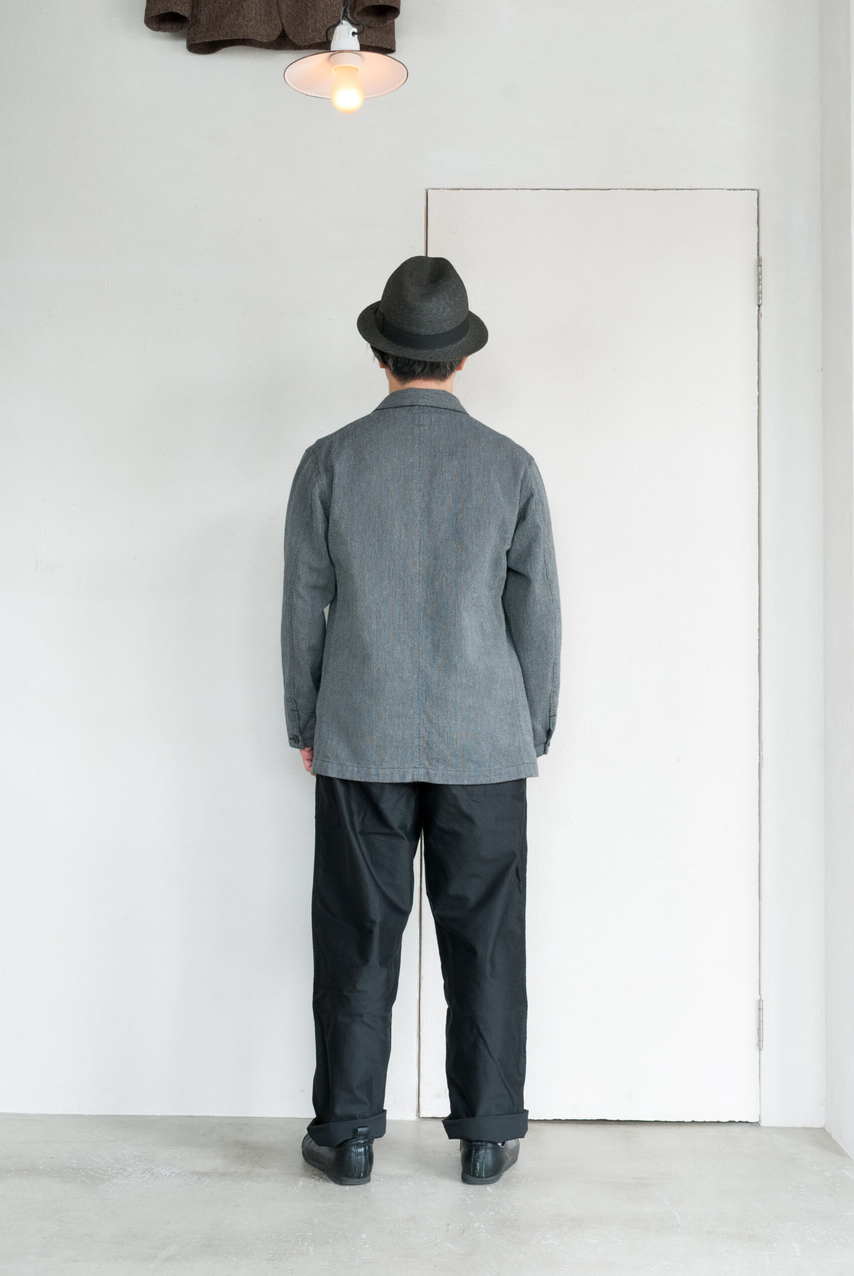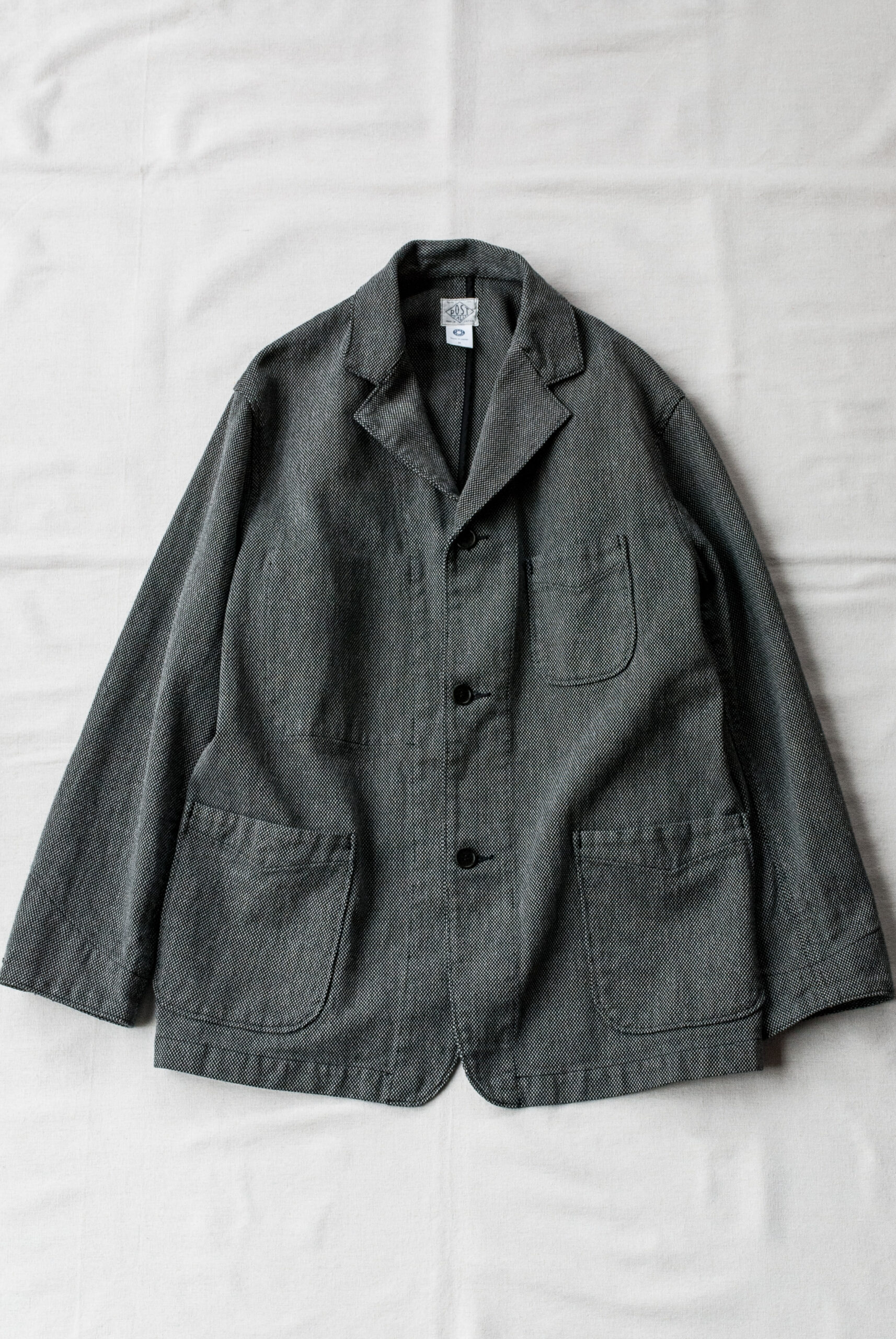 近くで見ると柄、離れて見ると無地のような少し変わった生地感ですが、黒糸と白糸、間にグレーの糸が絡んでいるので、結果的にとても落ち着いたチャコールグレーのジャケットになっています。