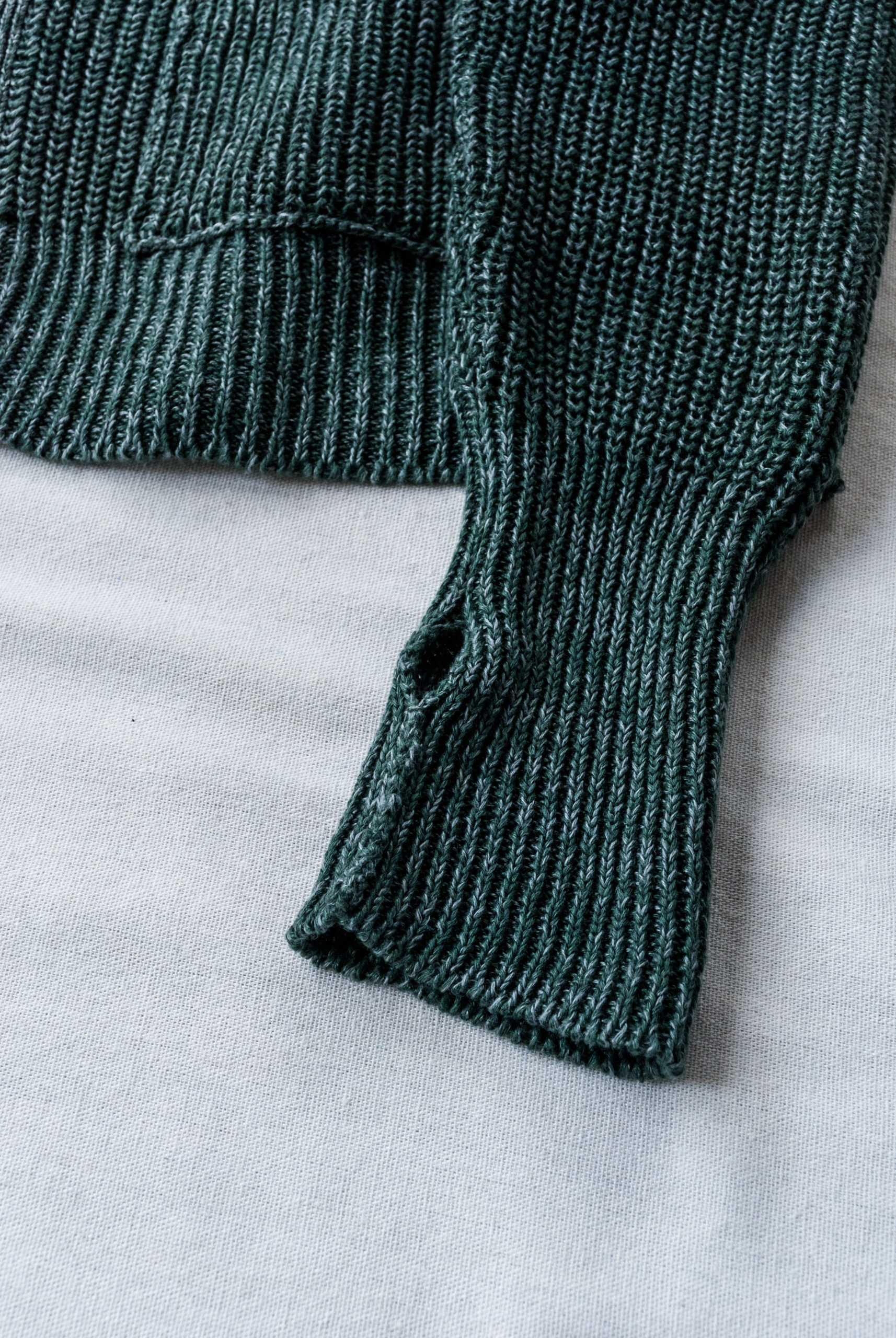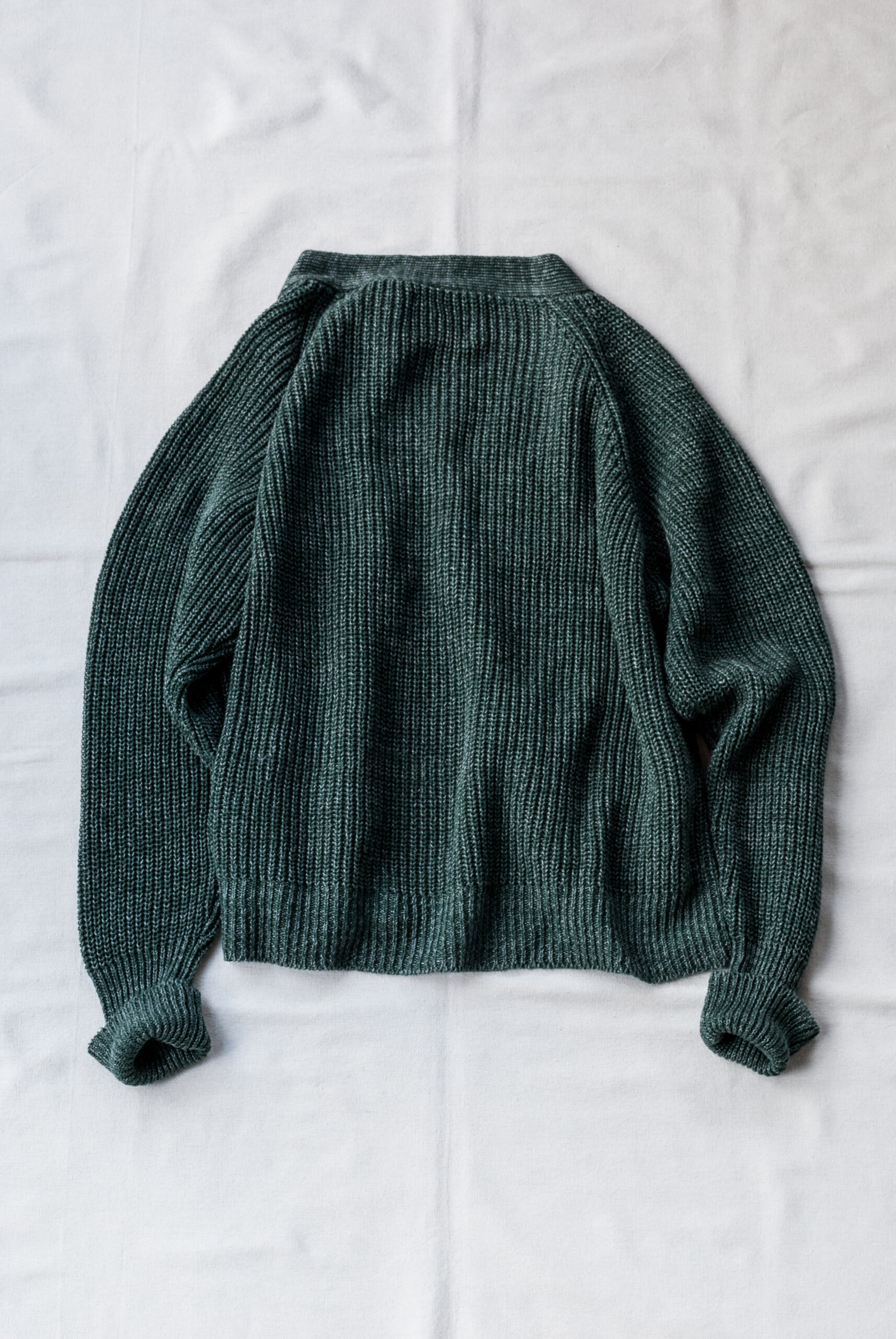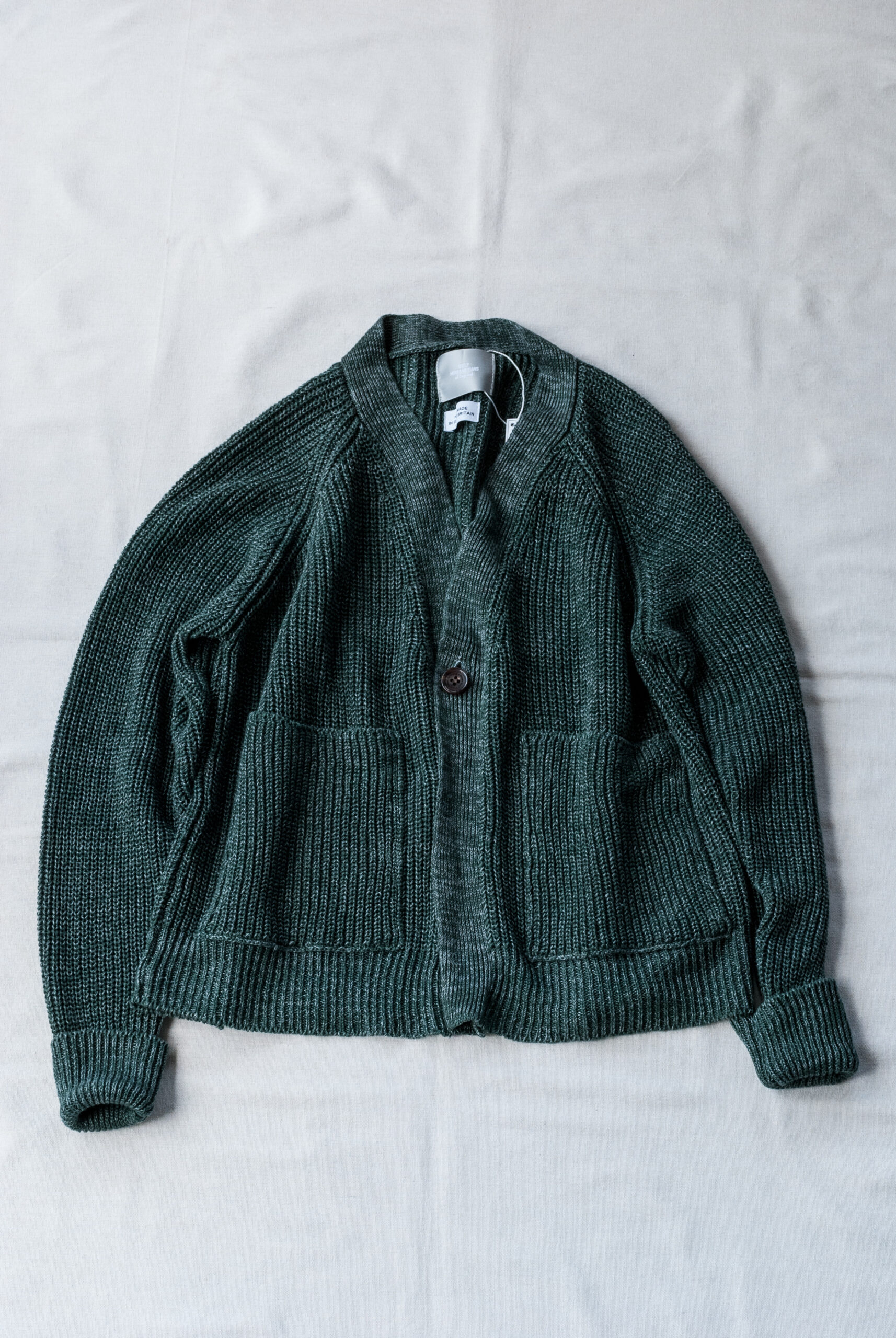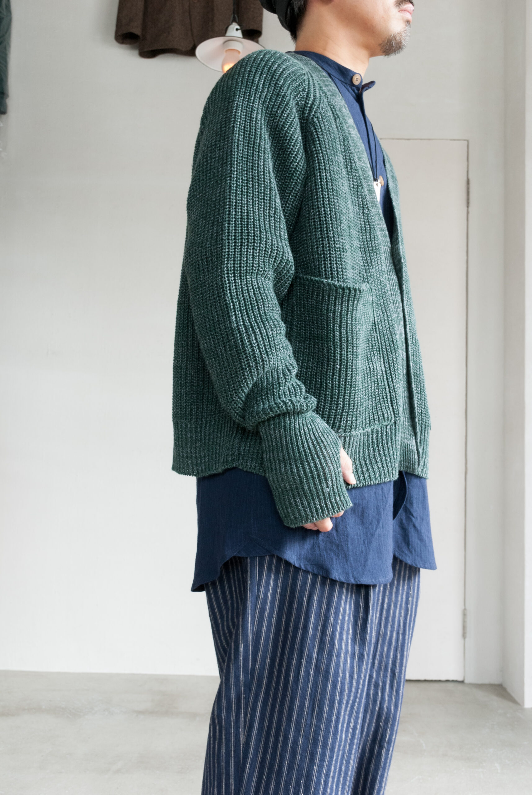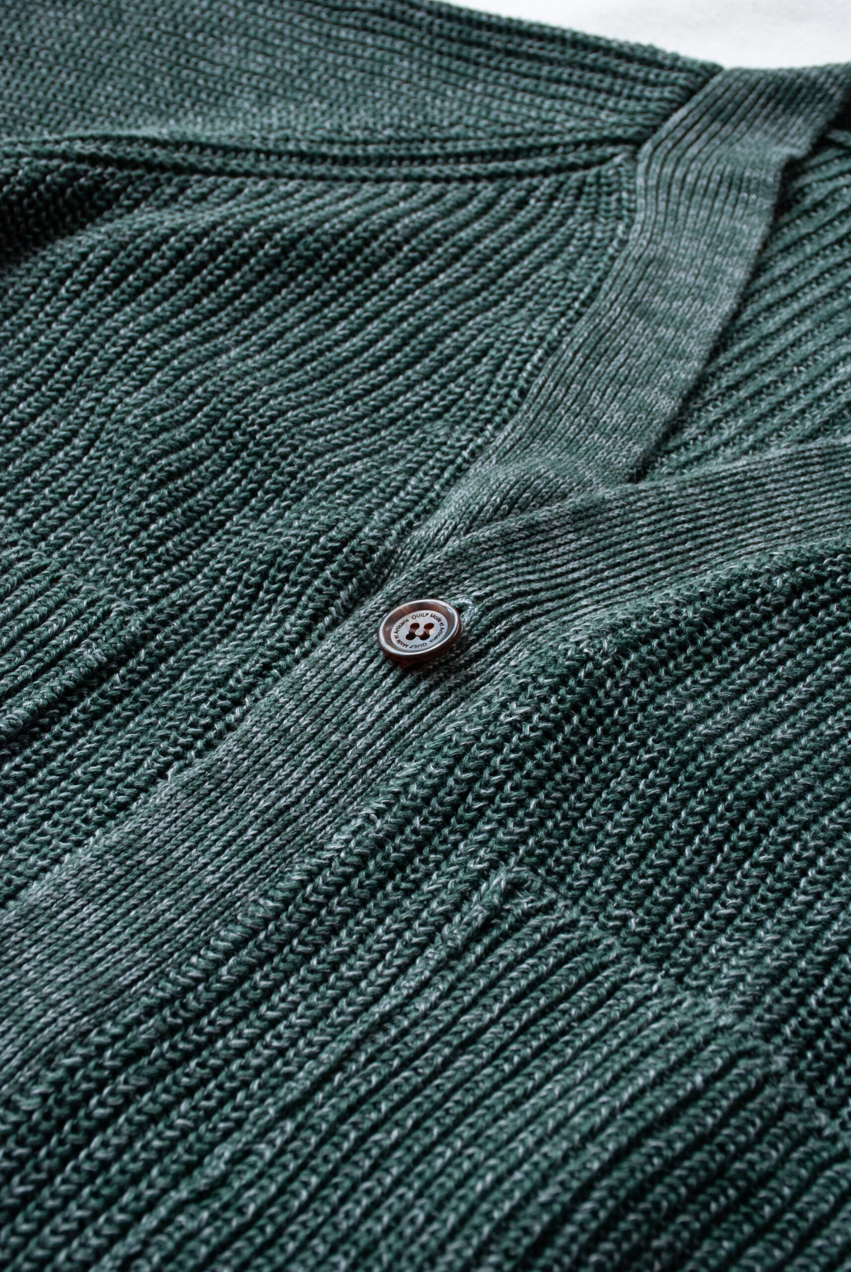 美しいグリーンの糸と曇り空のようなグレーの糸を3対1で撚り合わせた4plyの糸をたっぷりと使用したハンドニットカーディガン。
