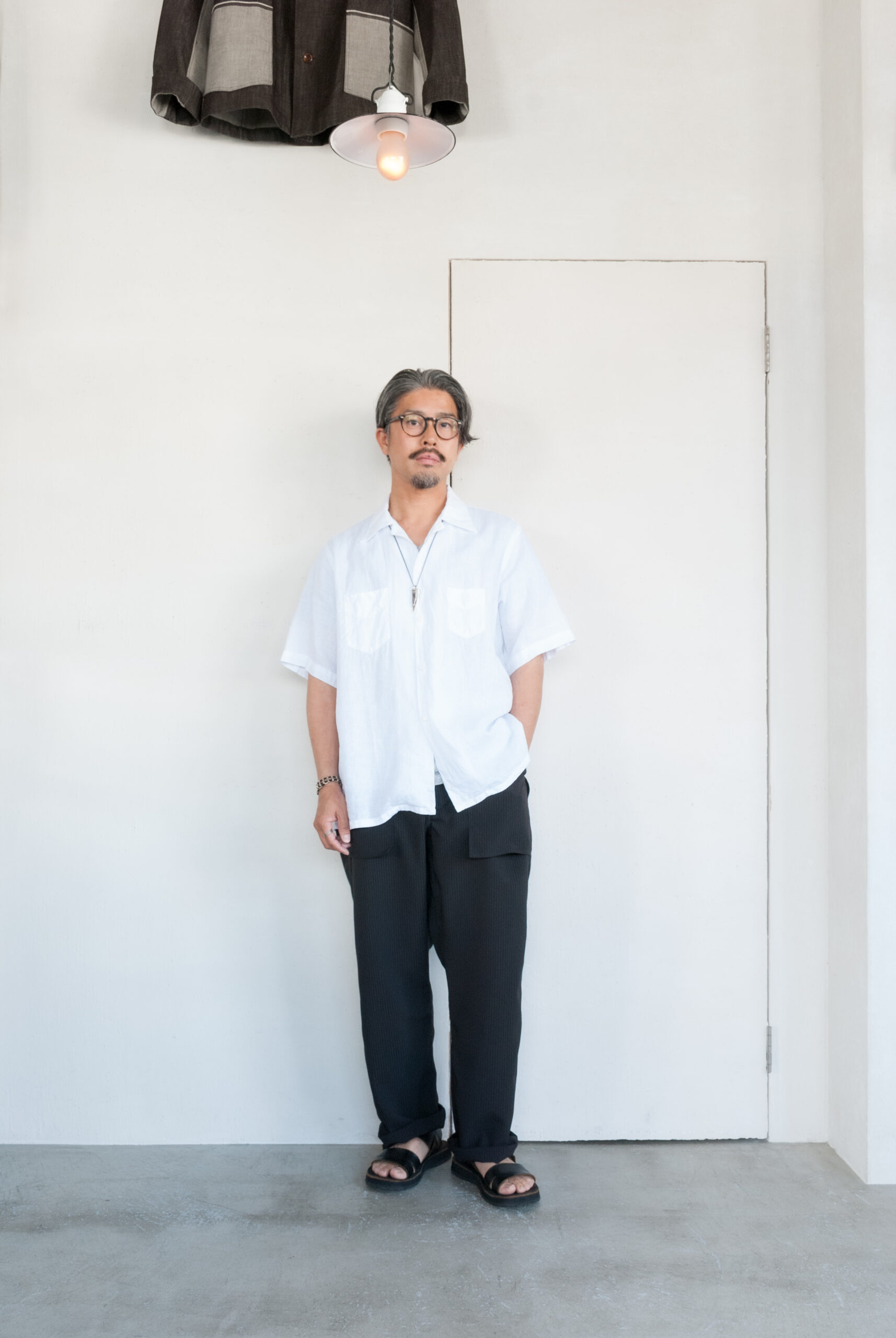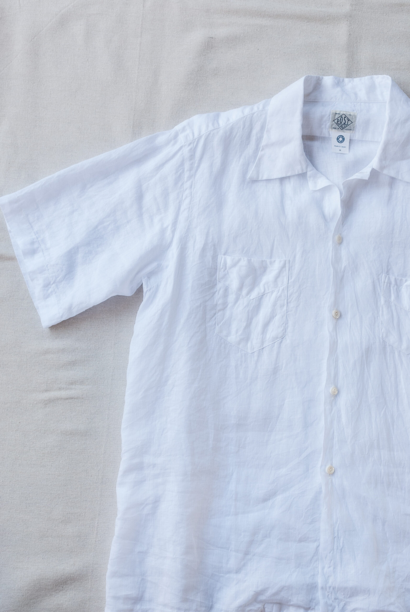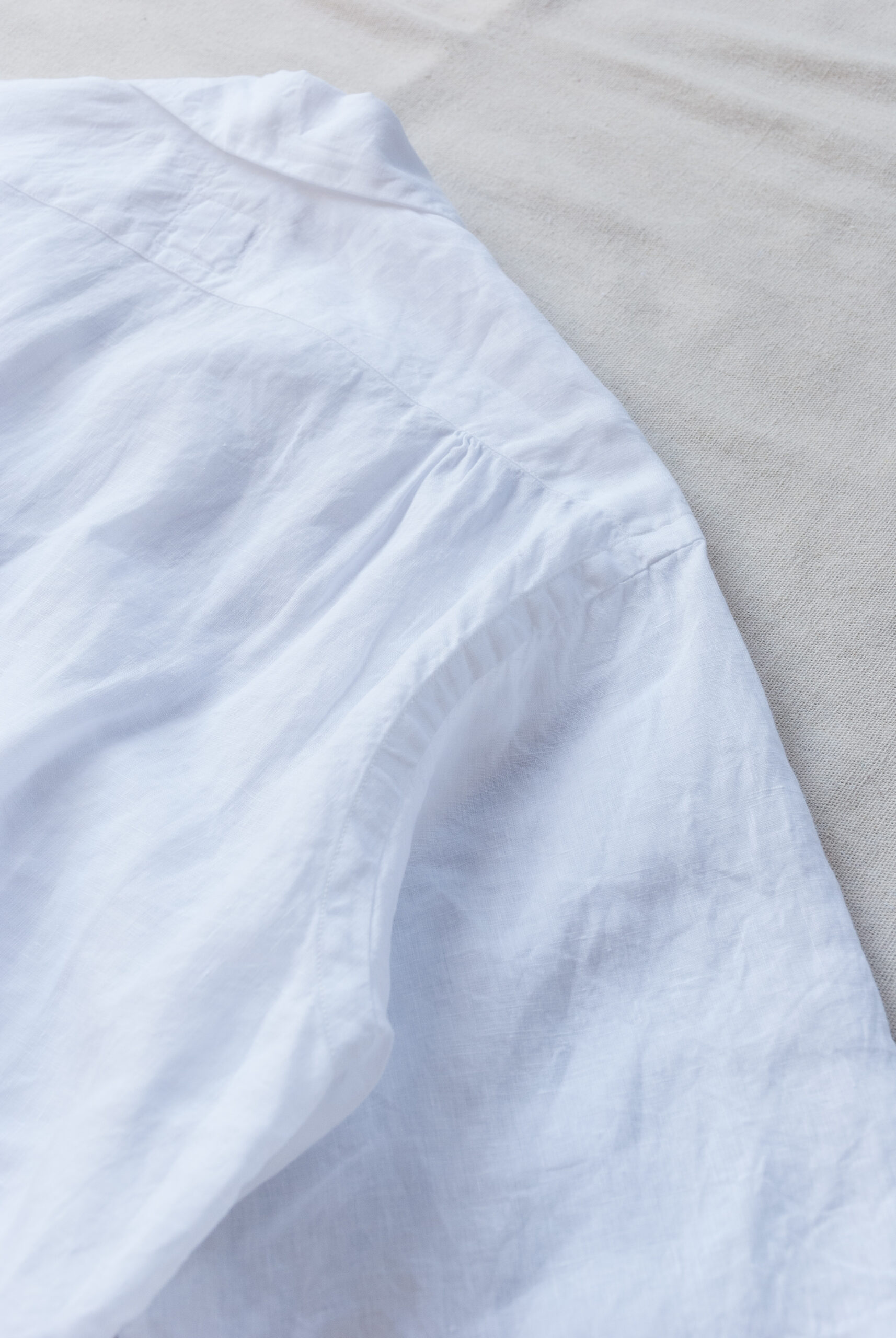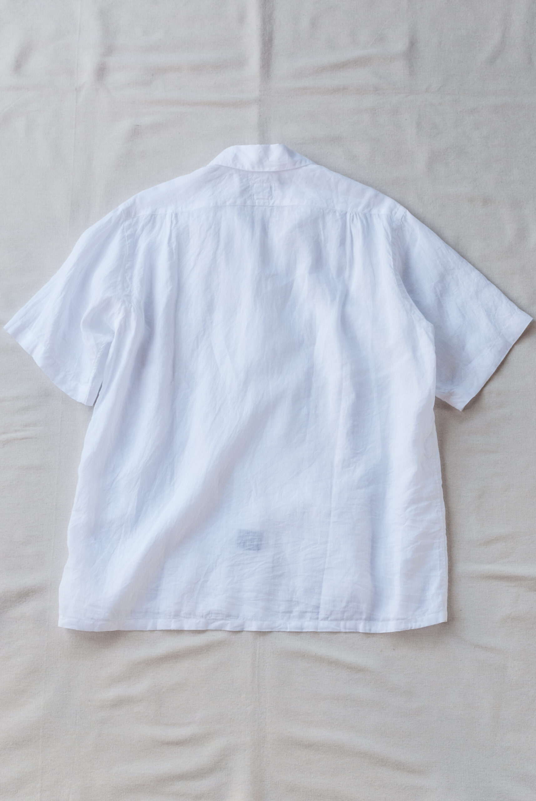 すっきりとした首元が涼やかなオープンカラー、リネンらしい凹凸感を持つ清潔感溢れる真っ白な生地は、印象的でありながらもすごくナチュラルなムード。