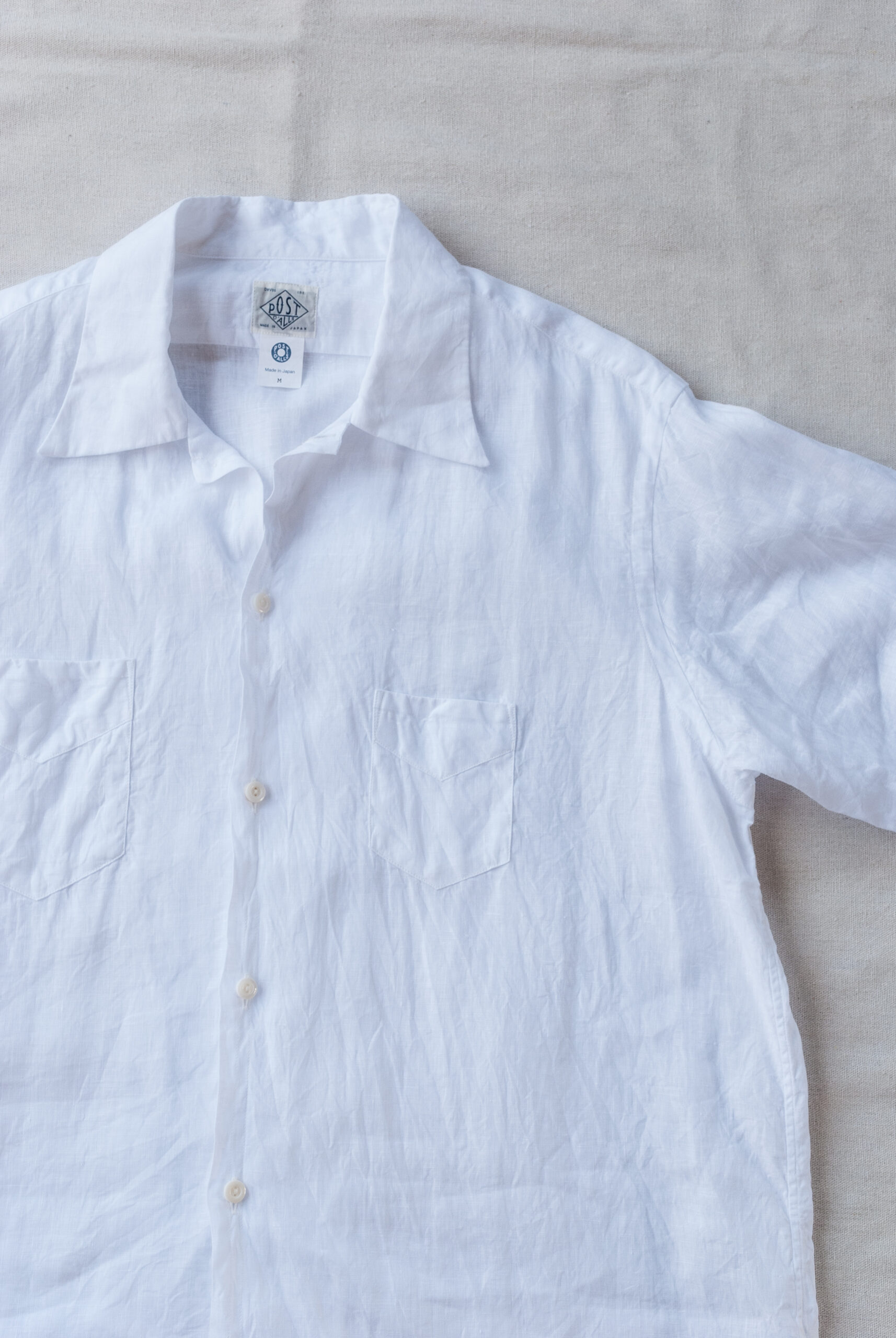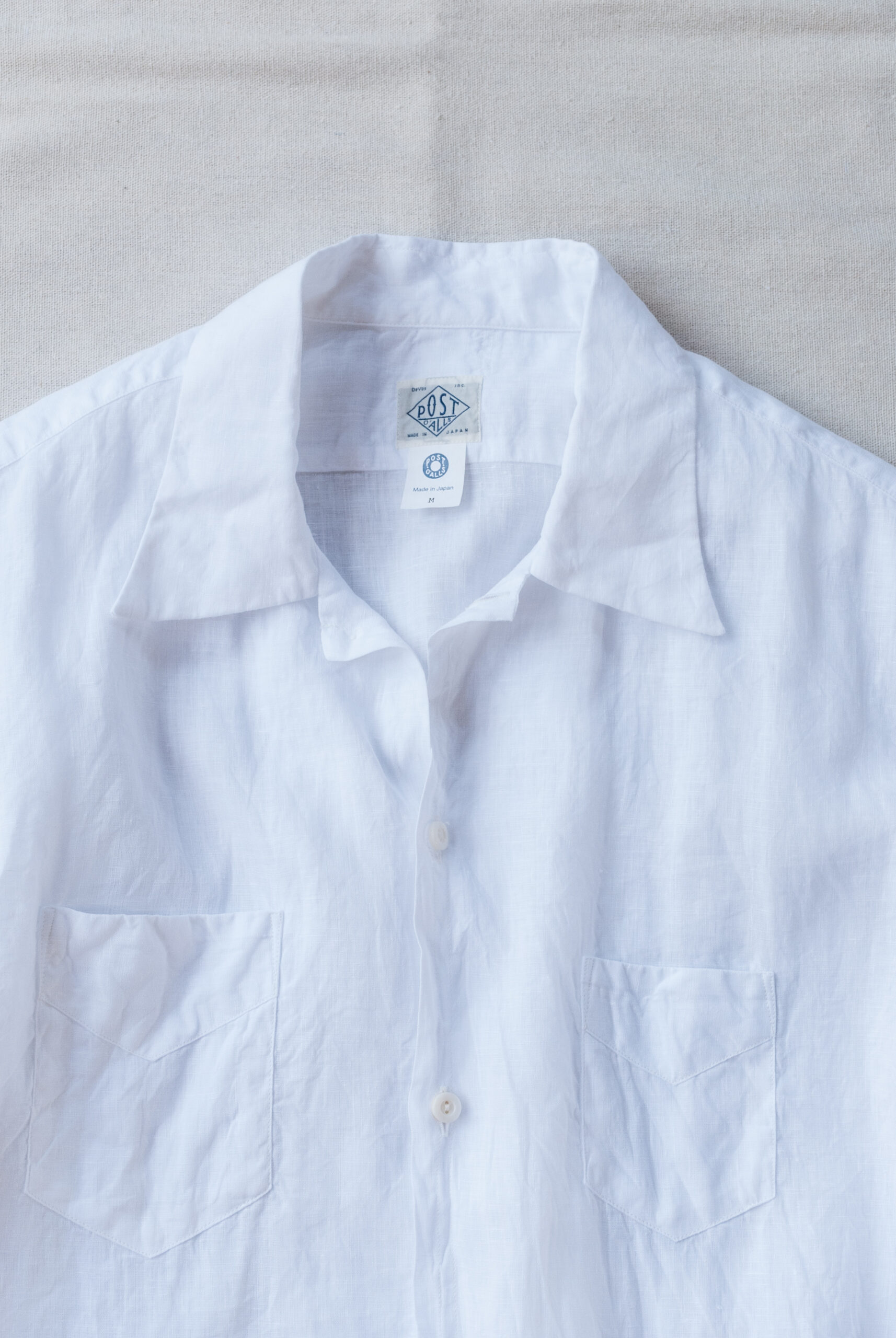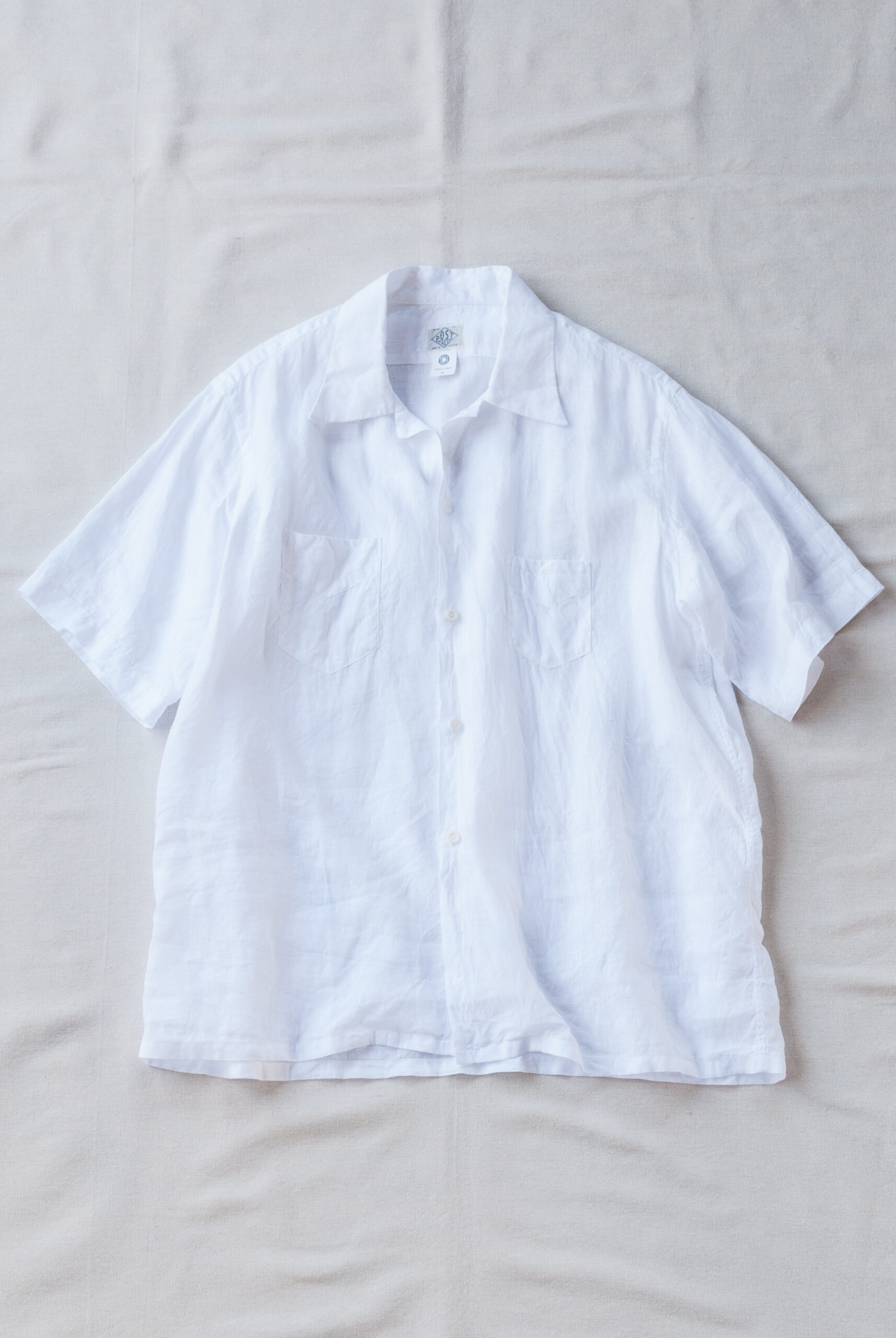 Post O’Alls の他のシャツよりも少し小さめなボタンを使用したり、縫製の運針の細かさや背中のスプリットバックヨーク、味わい深いサイドギャザー、脇下は本縫いですっきりした印象、、、、等。お話しすることはとても多いんですが、見た目は至ってシンプル。