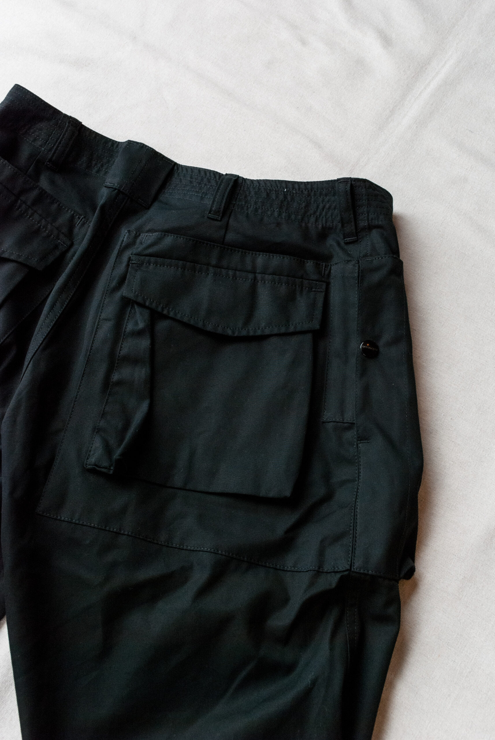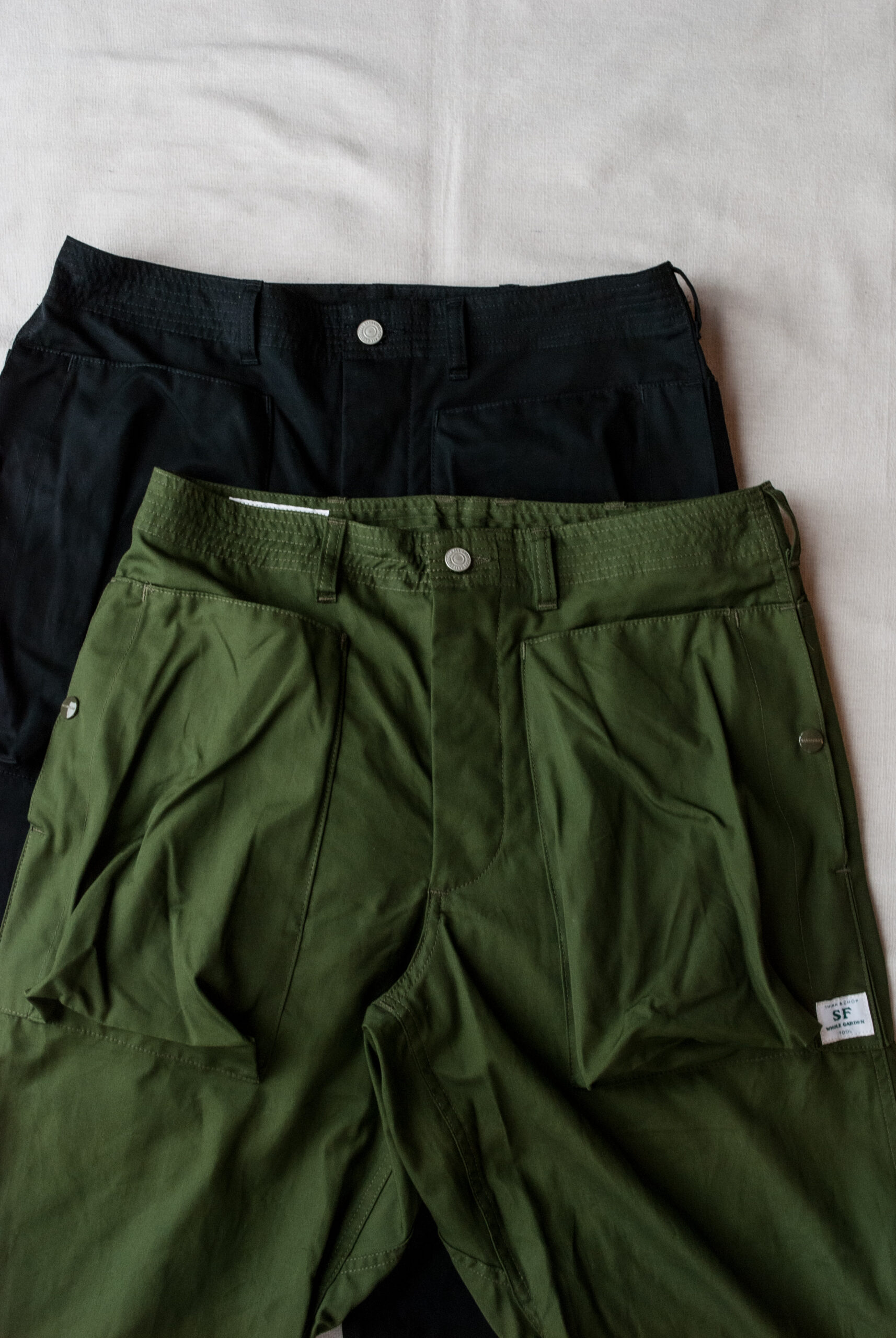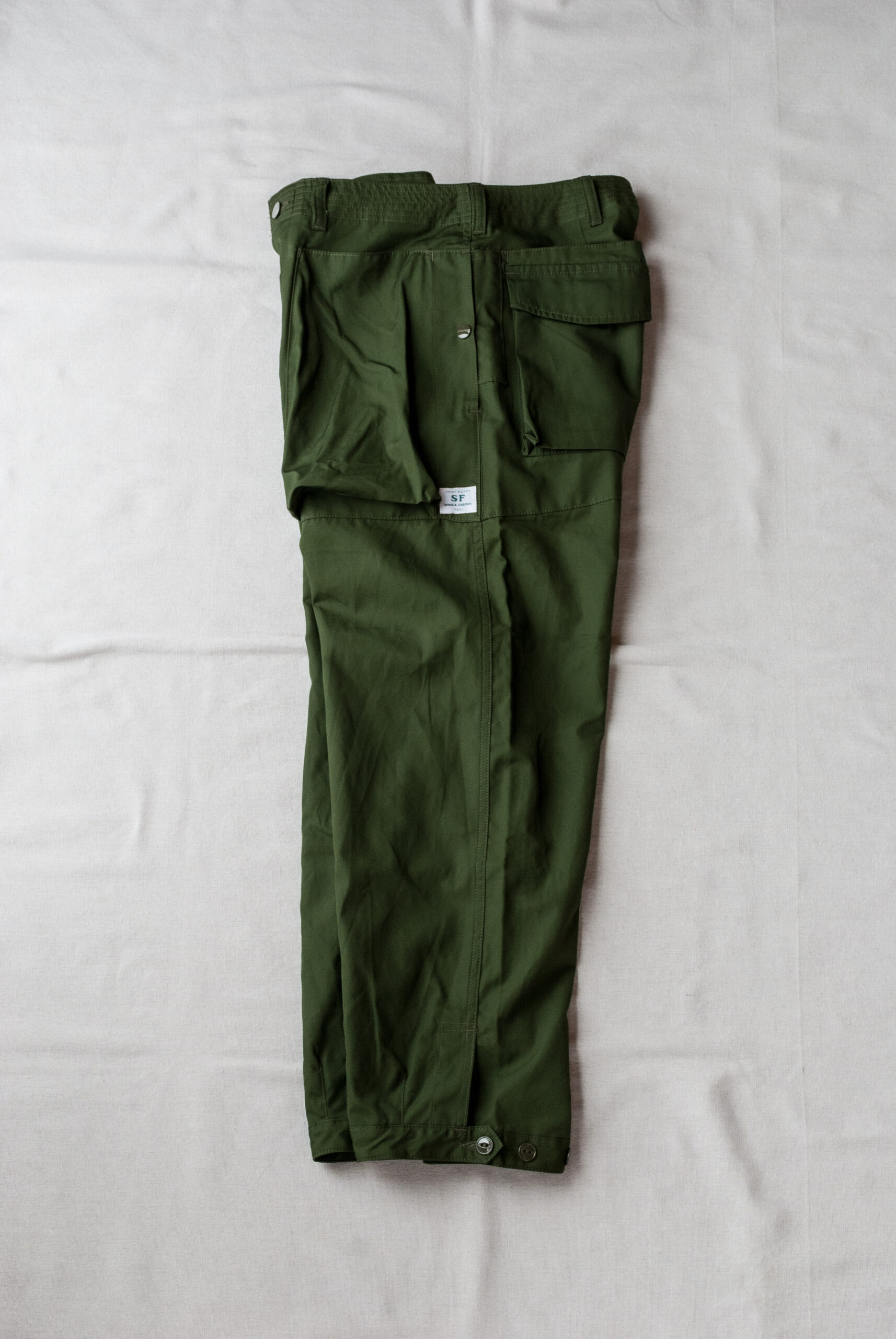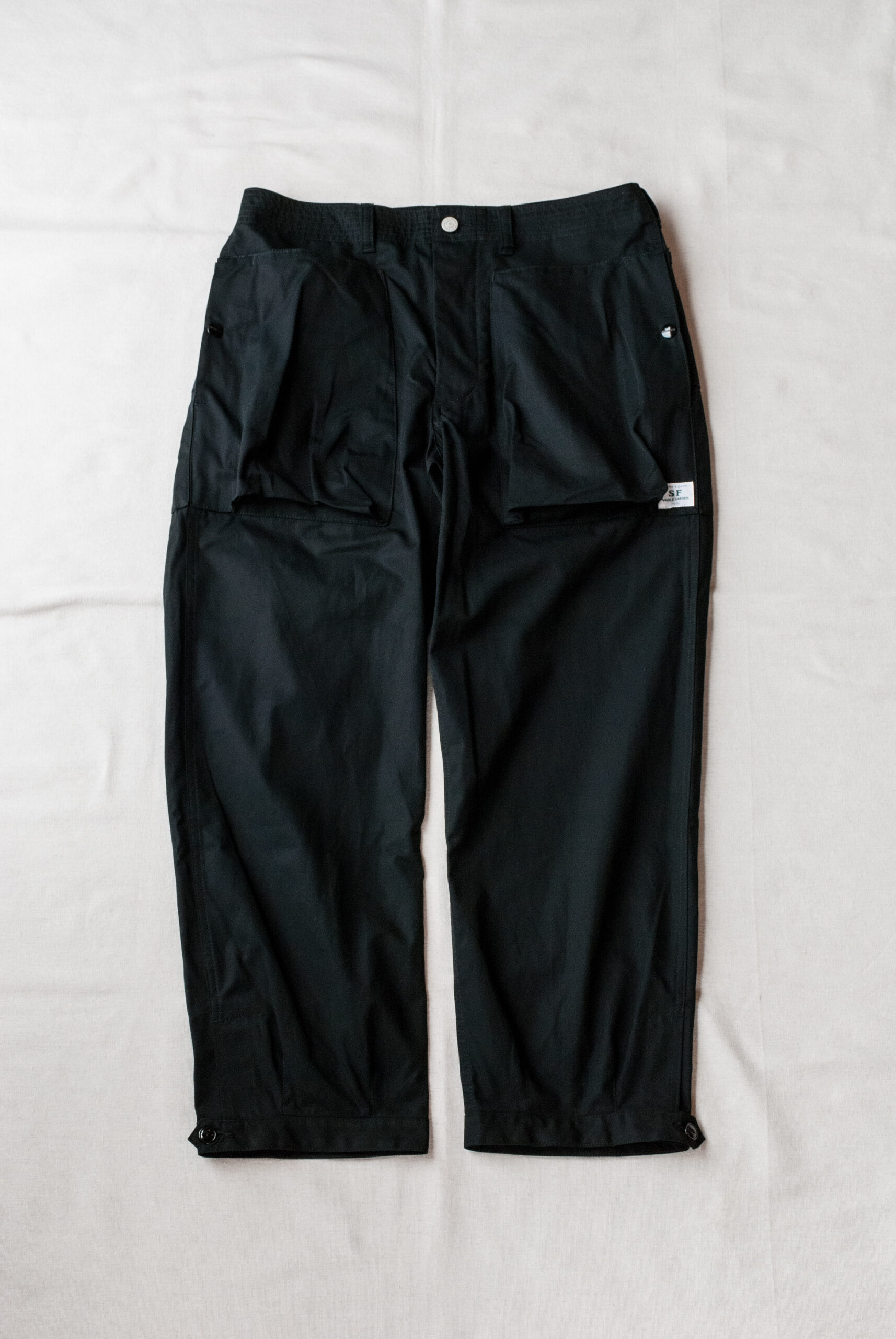 股にはササフラスお馴染みの180度開脚できるガゼットクロッチが付き、裾に設けられたボタン留めストラップによって、ワイドストレートから強烈なテーパードまで、3段階に調節可能。