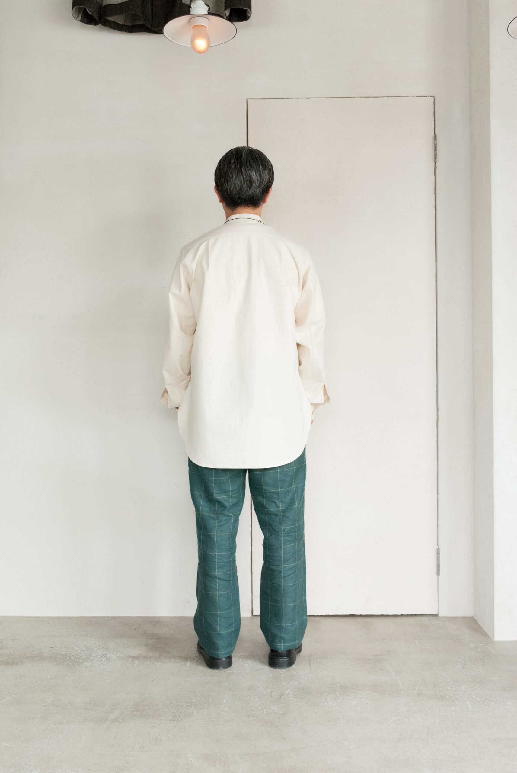 襟のないゆったりとしたシルエットは、太めのパンツにもすっきりとしたパンツにも合います。