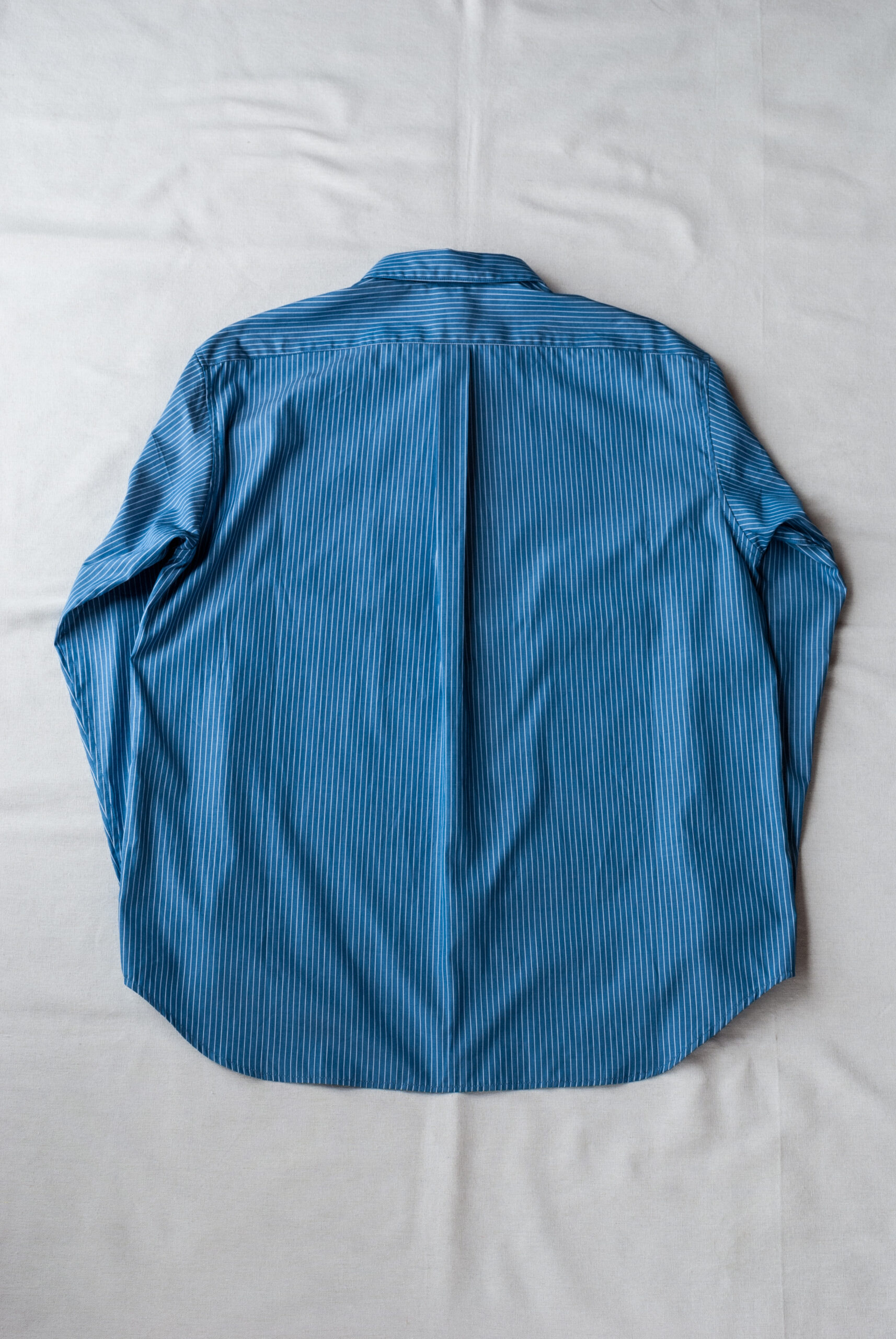 新型は、コバステッチのやや小さめなレギュラーカラーに、ゆったりと取られた身幅、ベーシックなプラケットとカフス、きっちりと柄合わせされたホームベース型のポケット、バックは身幅に余裕があるのでセンタープリーツ、一枚仕立てのヨークです。