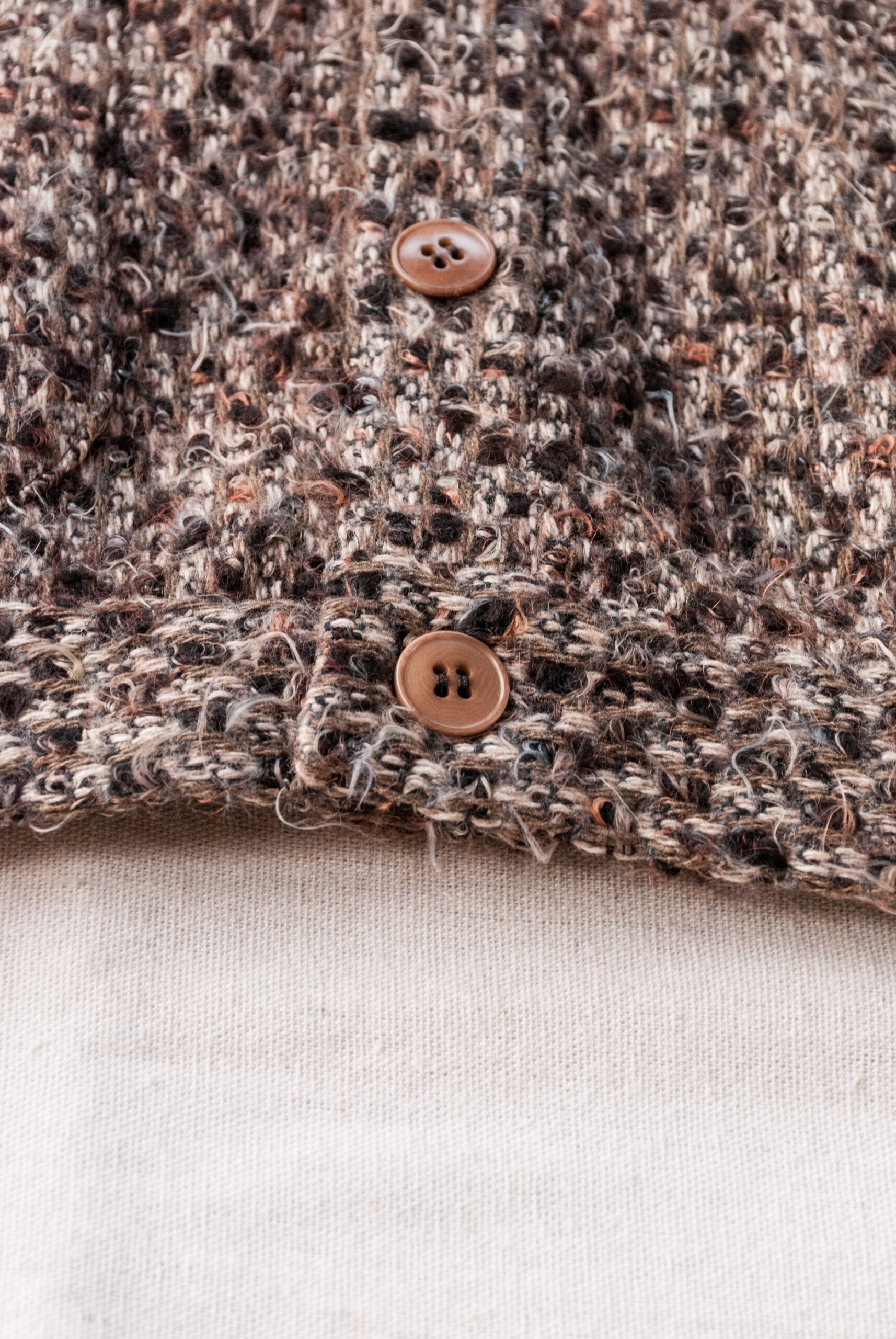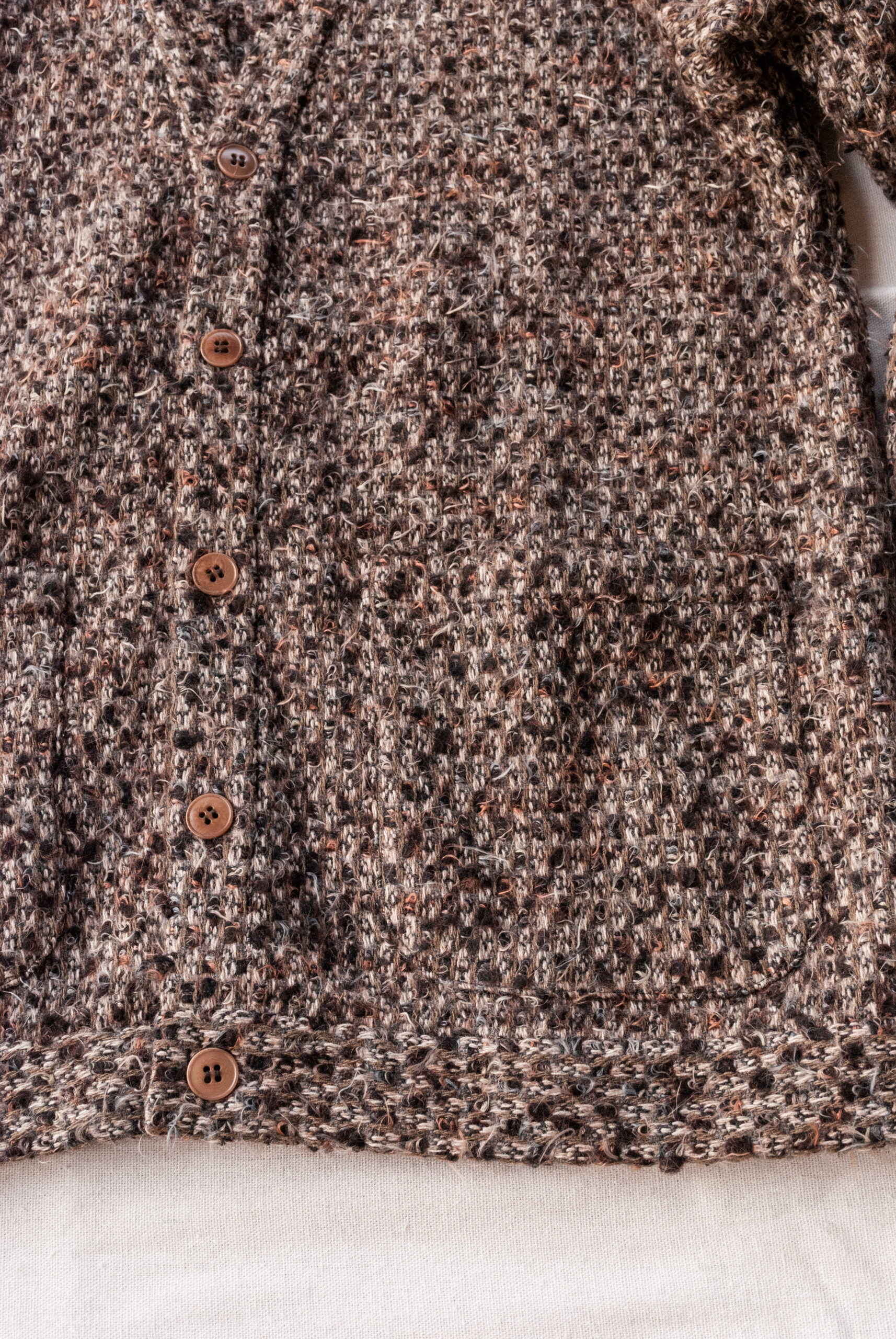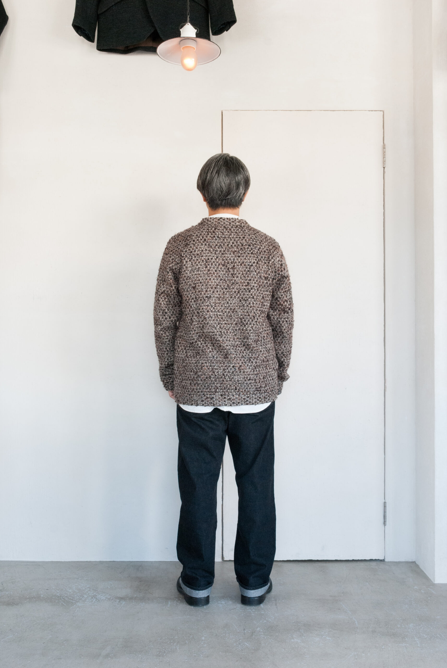 モヘアのような毛足の長い繊維と積み重なったレンガのような色味の糸が交差してできる美しい色相は、着込むことで糸が絡み合いまた違った表情を見せる。