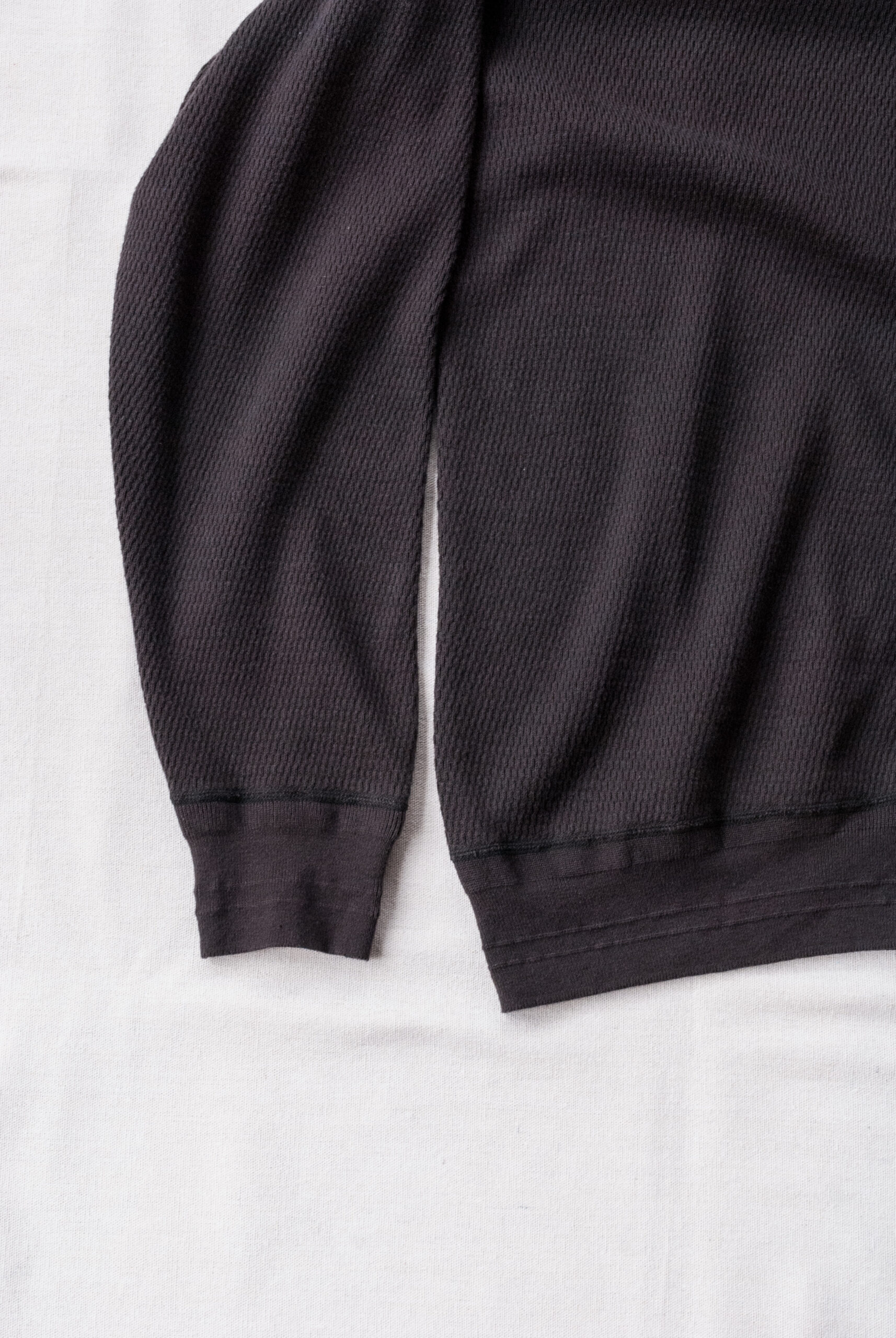 通常のサーマルよりもムラ感たっぷりの糸は、番手を太くして、編み目も大きめに仕上げてあるので、ハニカムの柄もしっかりと立って、古着のような柔らかで優しい表情になってます。