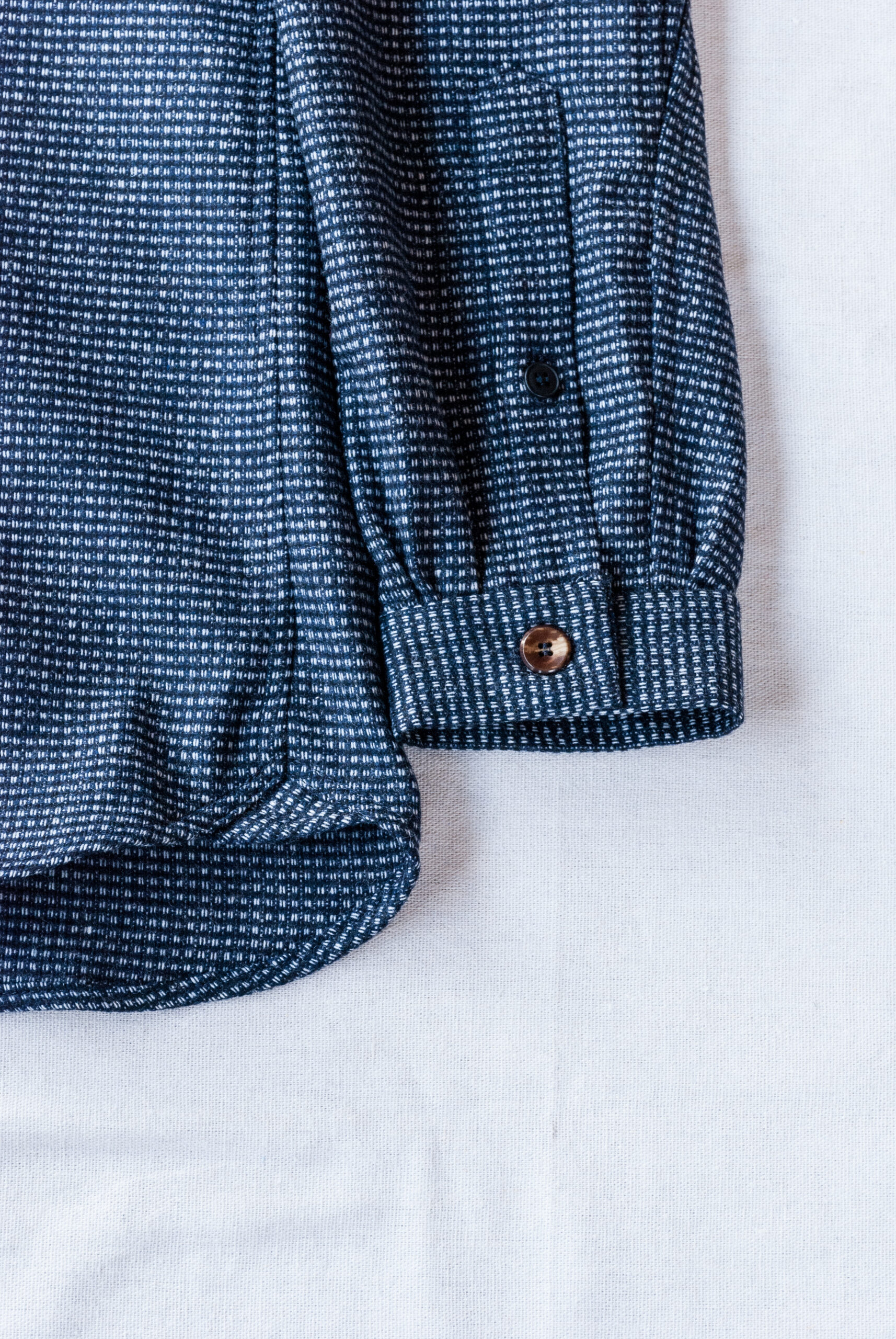 無地でもチェックでもストライプでもない独特の織り柄のリズムは、ウール特有の起毛感で中和され、ネイビーやチャコール等の同系色を合わせるとシックに、ベージュ、オリーブ等の色と合わせるとコントラストがありながらも柔らかい印象を与えます。