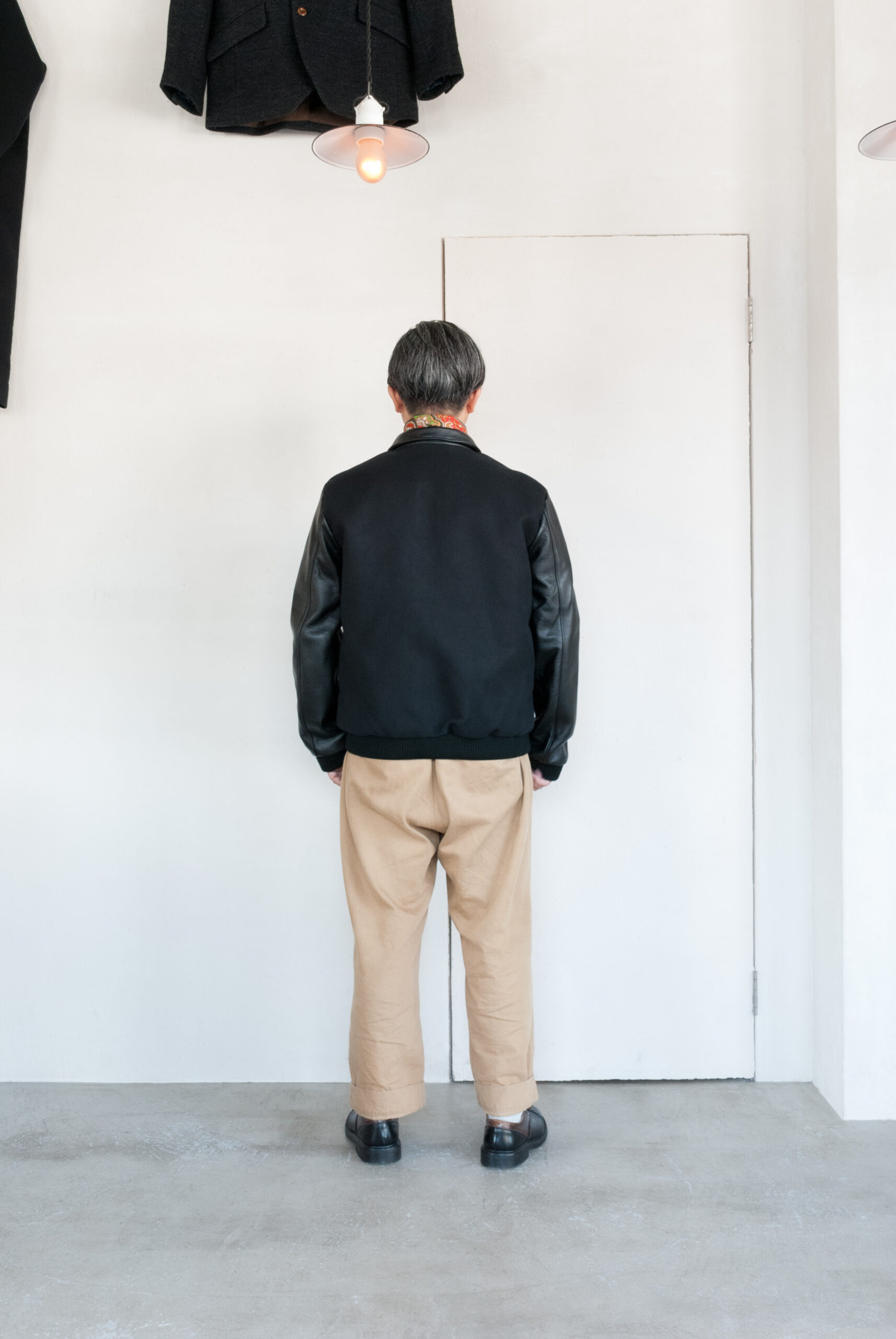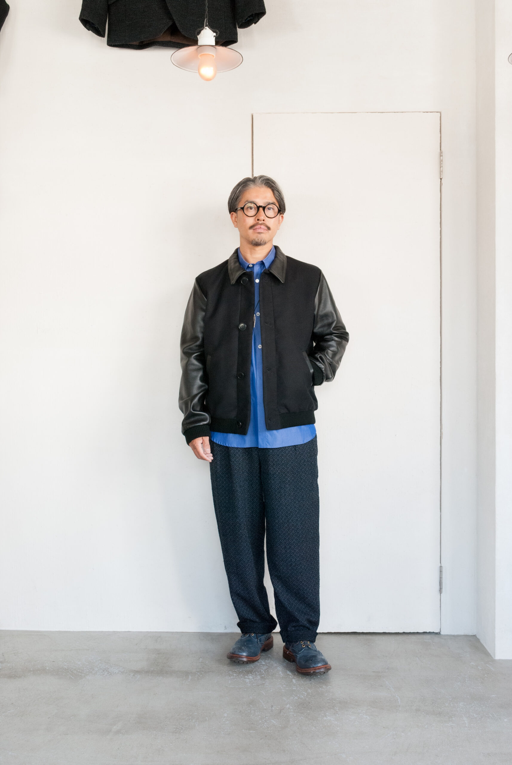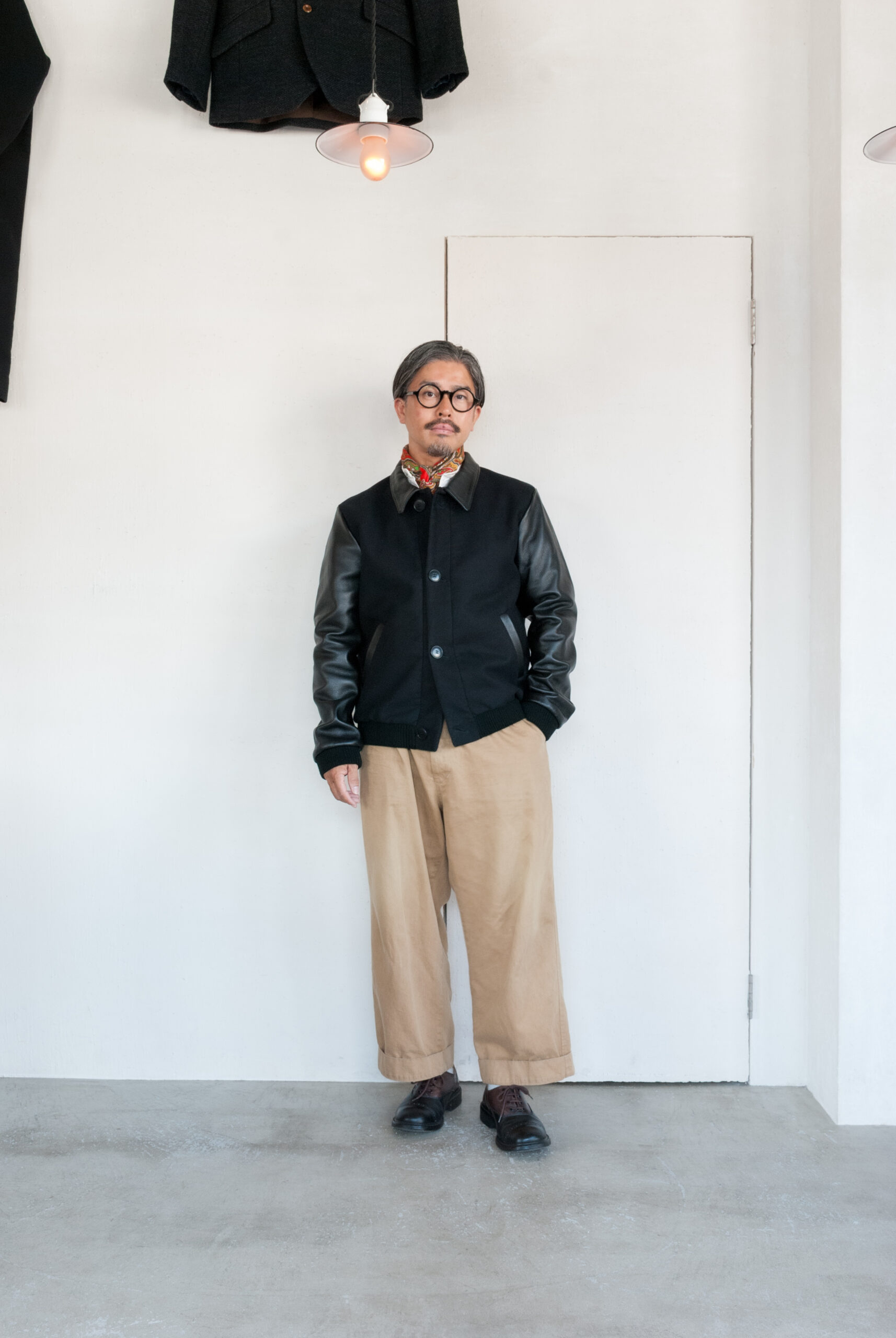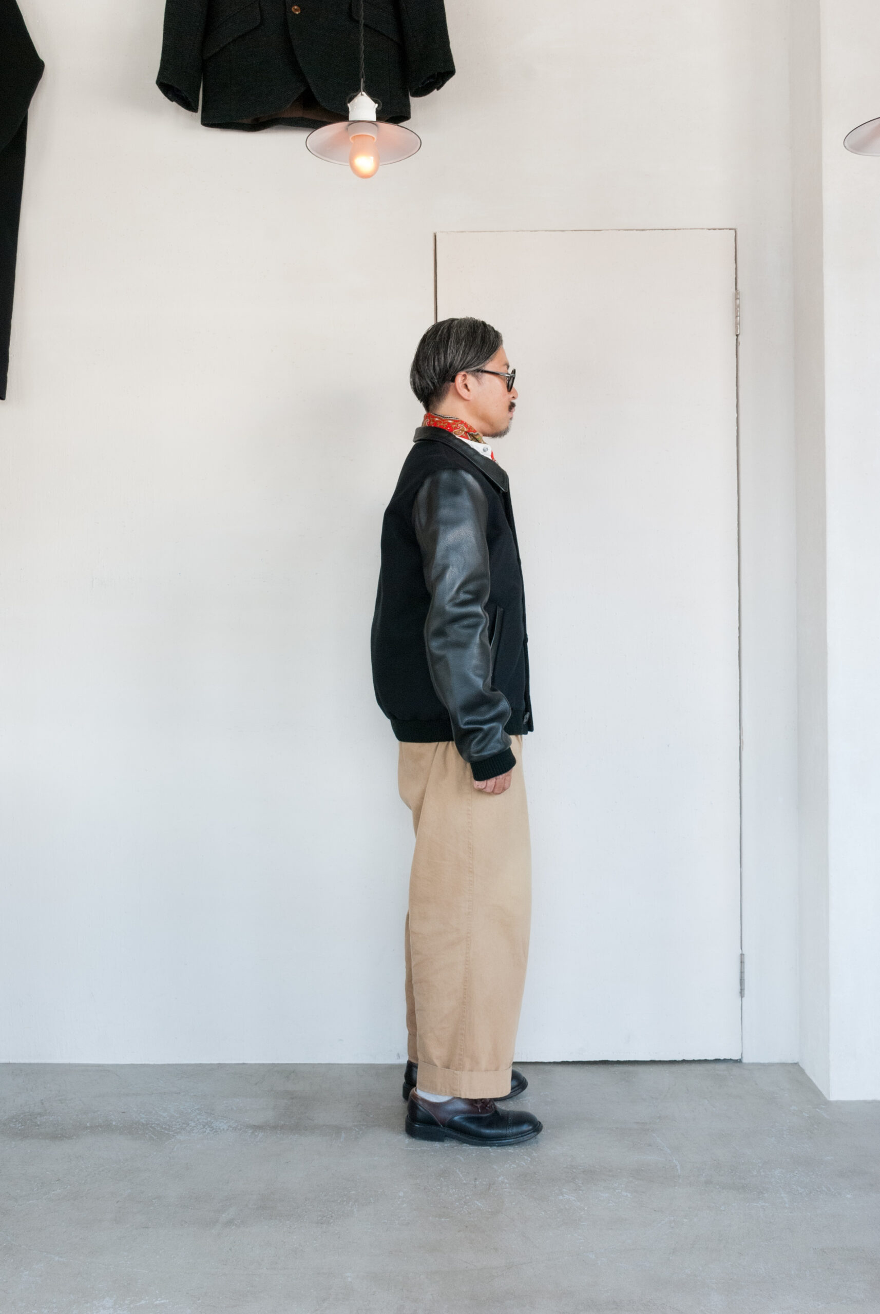 どことなくアワードジャケットのような雰囲気もあるし、レザーの襟を立てるとまた違った表情も見せてくれます。
