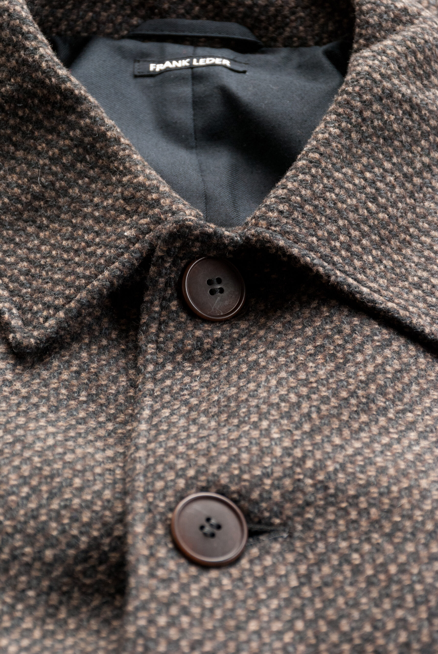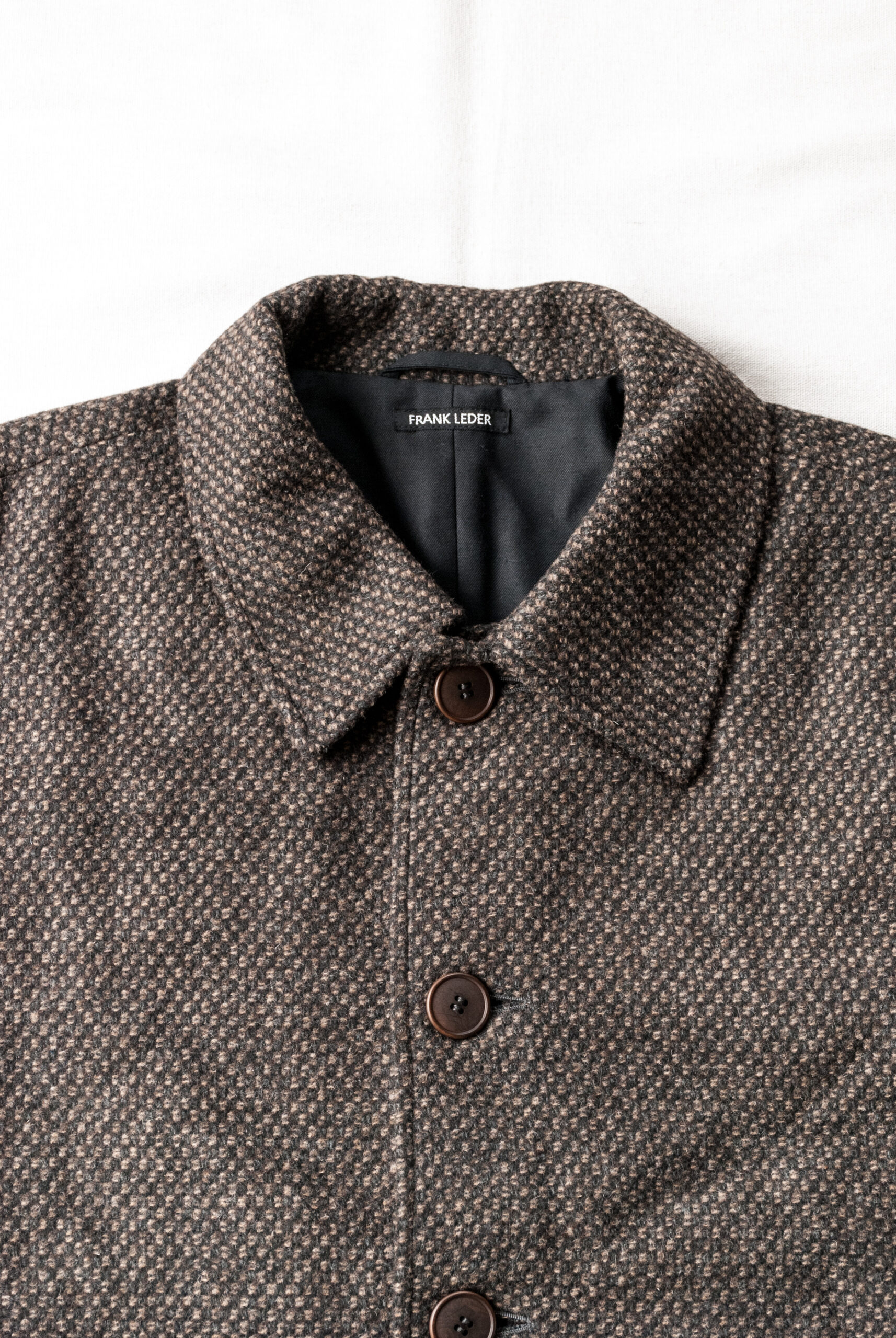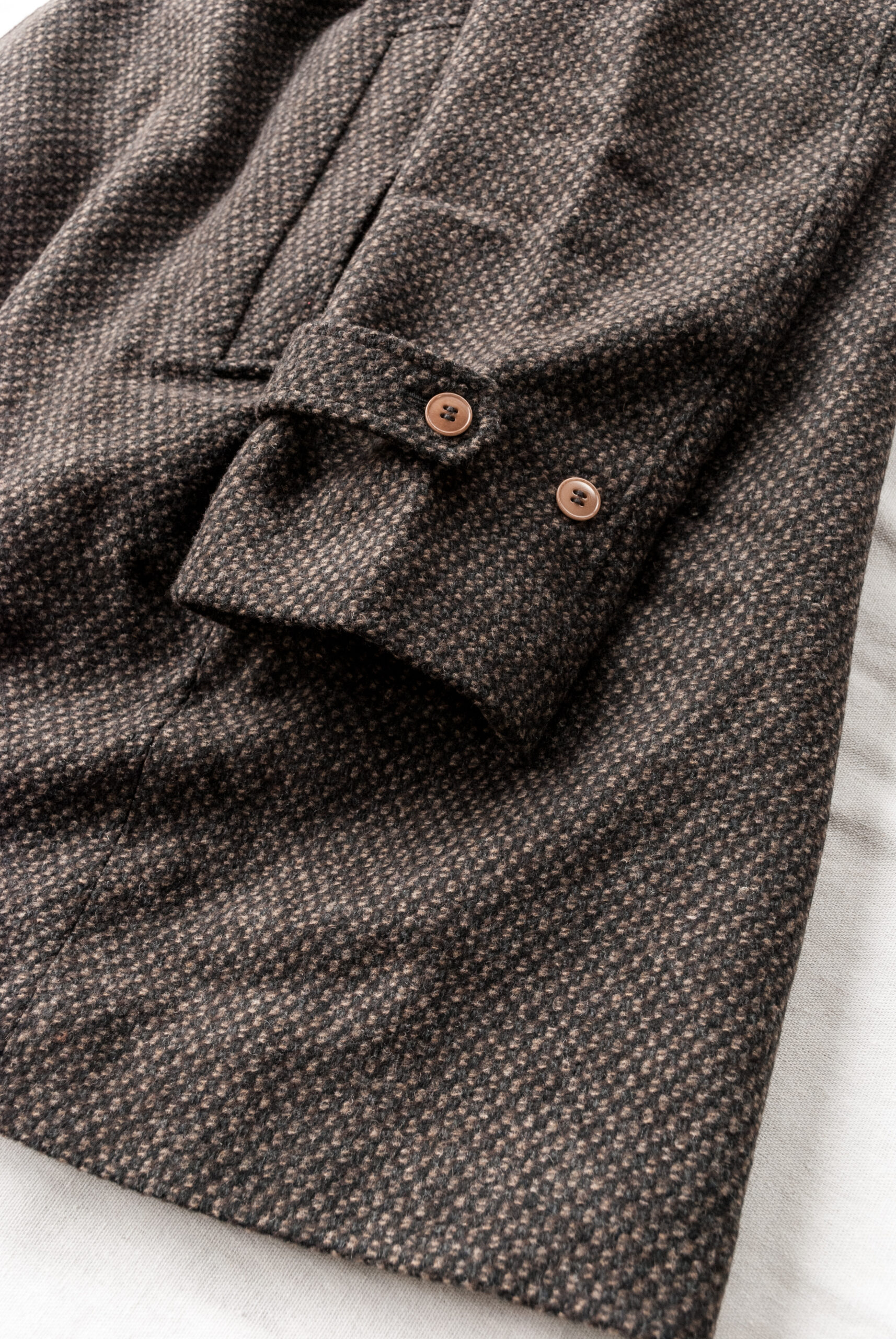 ブラウン、ダークブラウン、ベージュ、ネイビー、チャコールの糸が絶妙に混ざり合い、糸の太さの違いからくる立体感と掛け合わされ、奥行きのある美しい色彩が一枚の生地で表現されています。