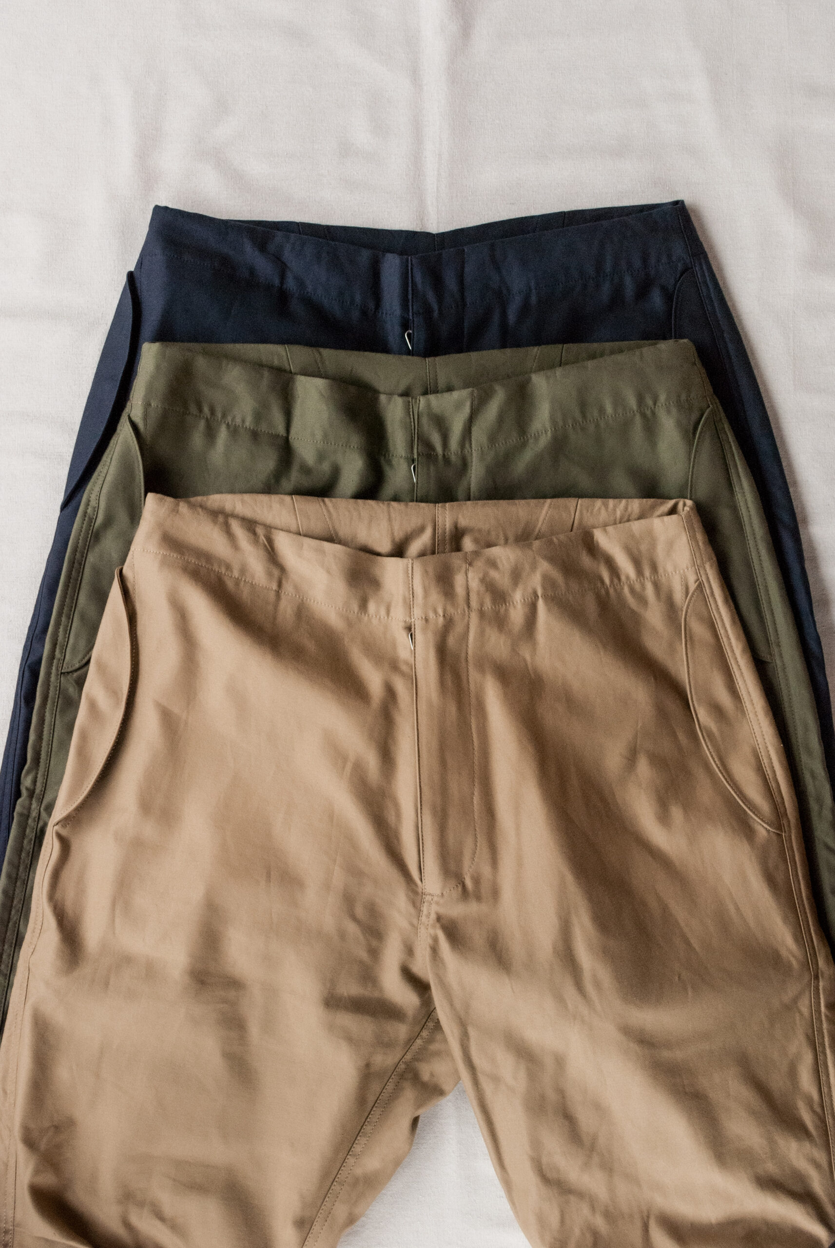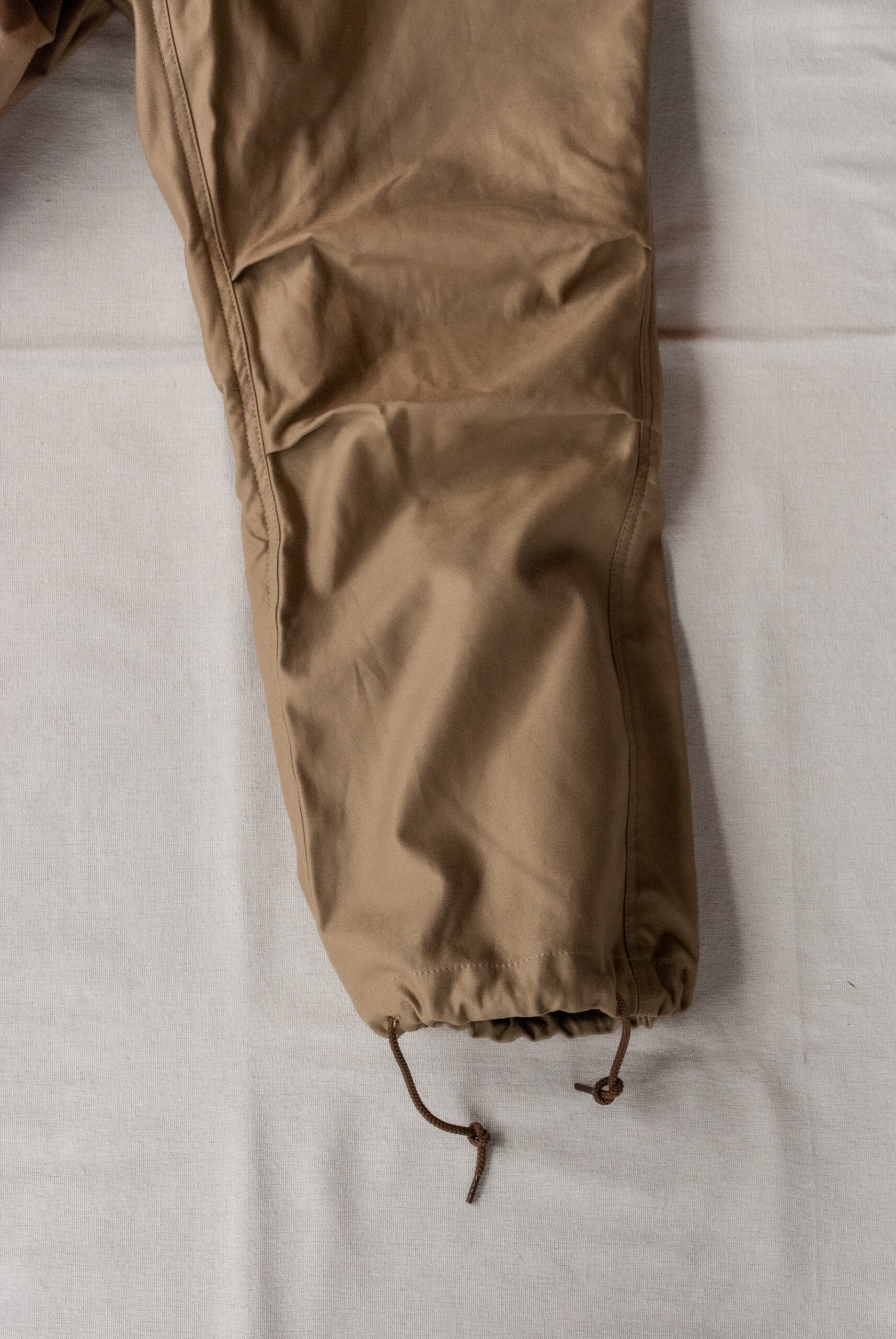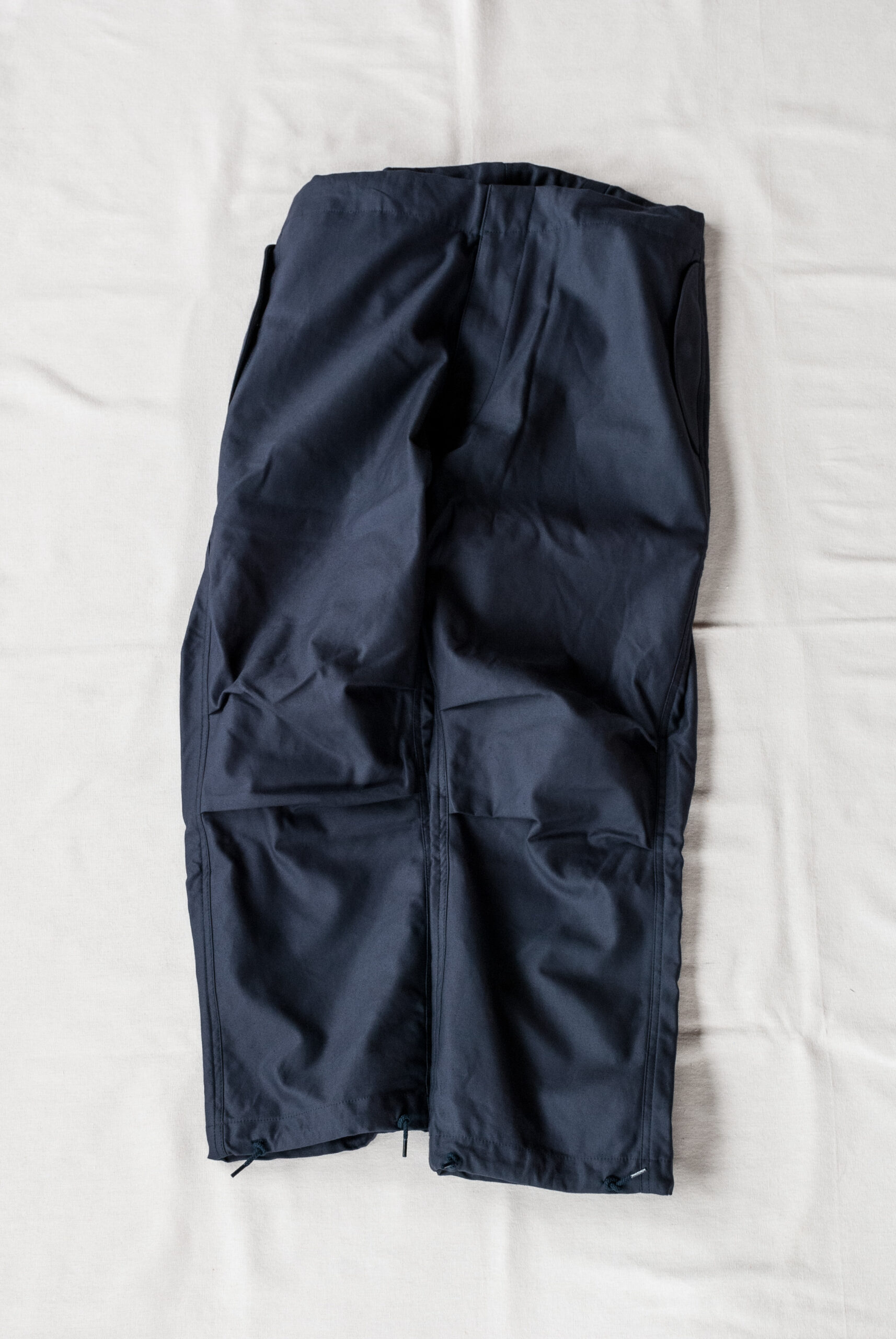 見た目はかなりシンプルですが、膝のダーツや、少し大ぶりなフロントジッパー、ウエストと裾につけられたドローコード、前回よりも広くとられた裾幅など。どれもデザイナーの拘りが詰まったディテールです。