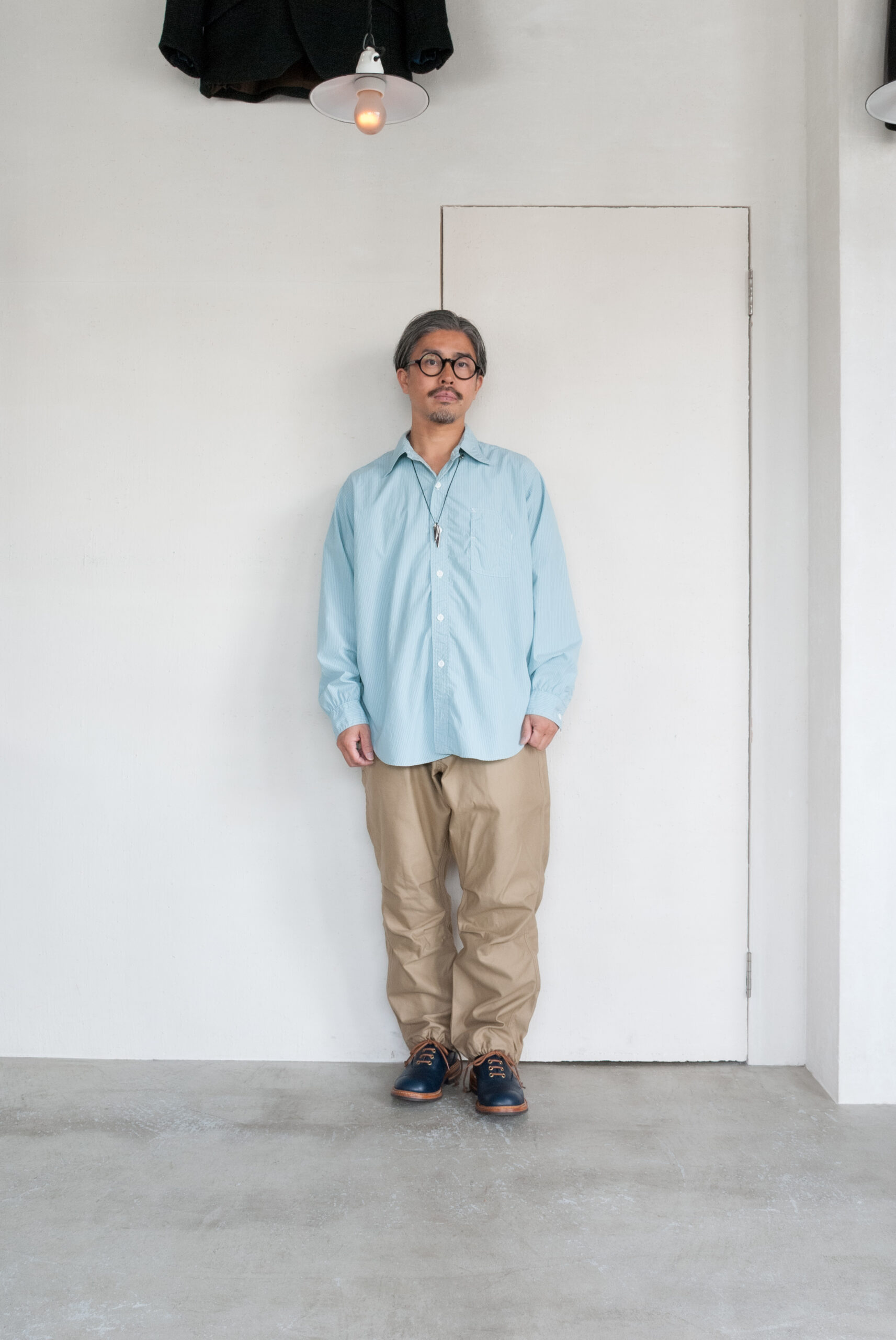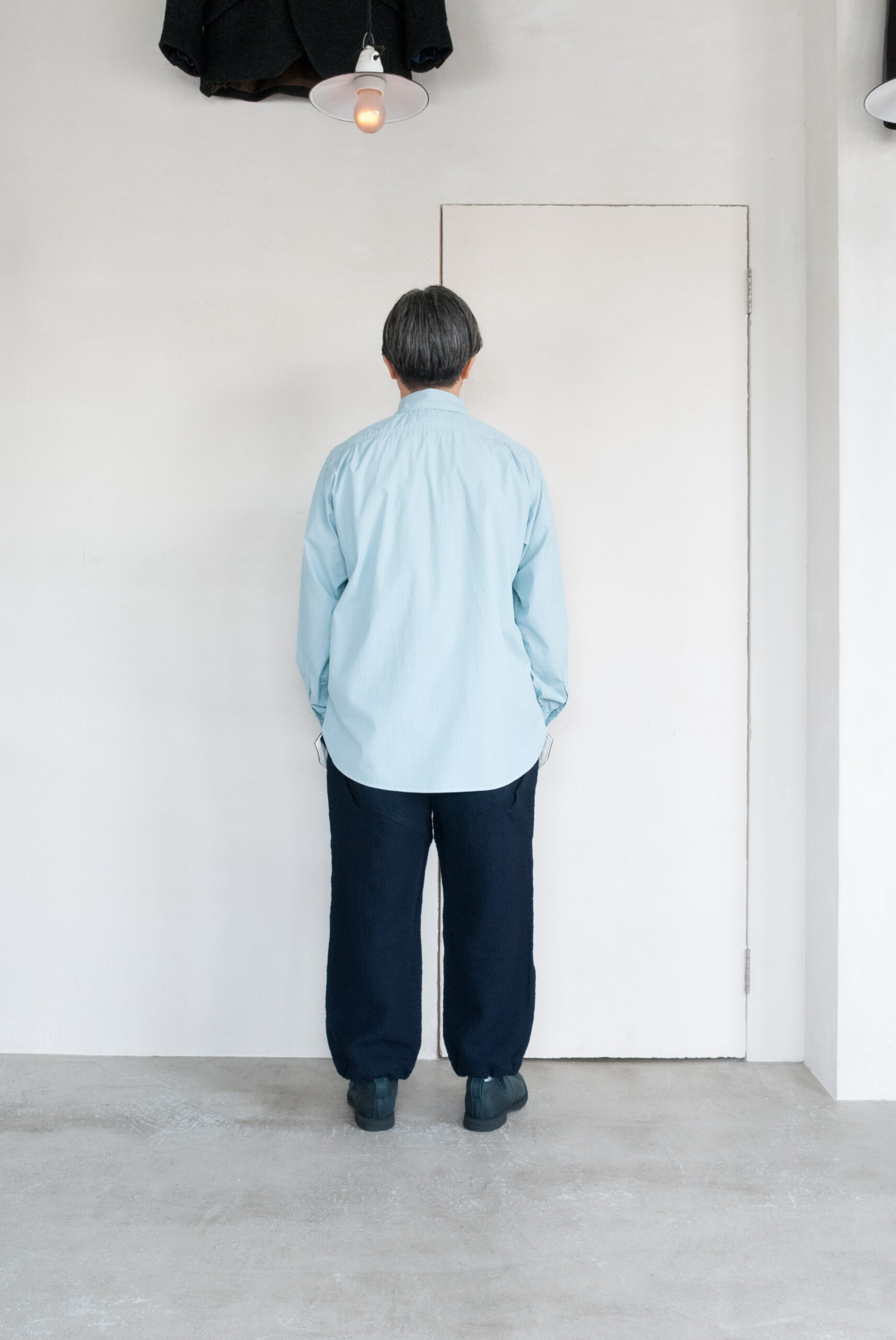 ポプリンらしい高密度に詰まったハリとコシのある生地で、今の時期はニットやスウェットのインナーにすると風が止まってくれるのでとっても暖かく、ネルシャツやウールシャツほどかさばらない、かなり優等生な生地です。
