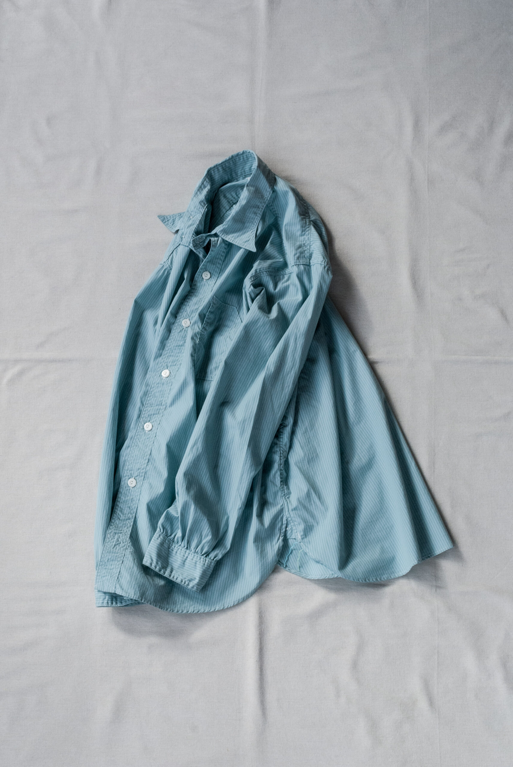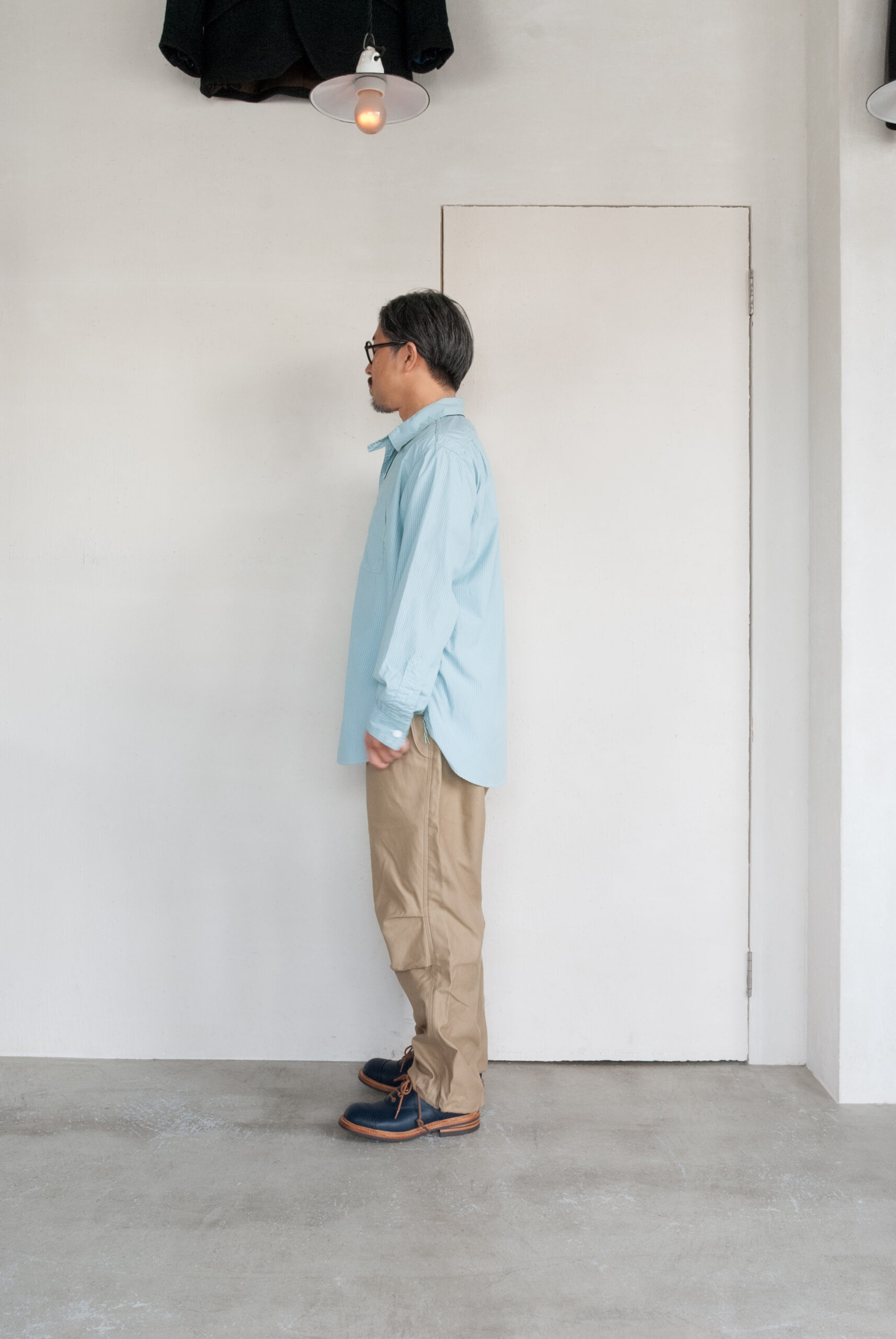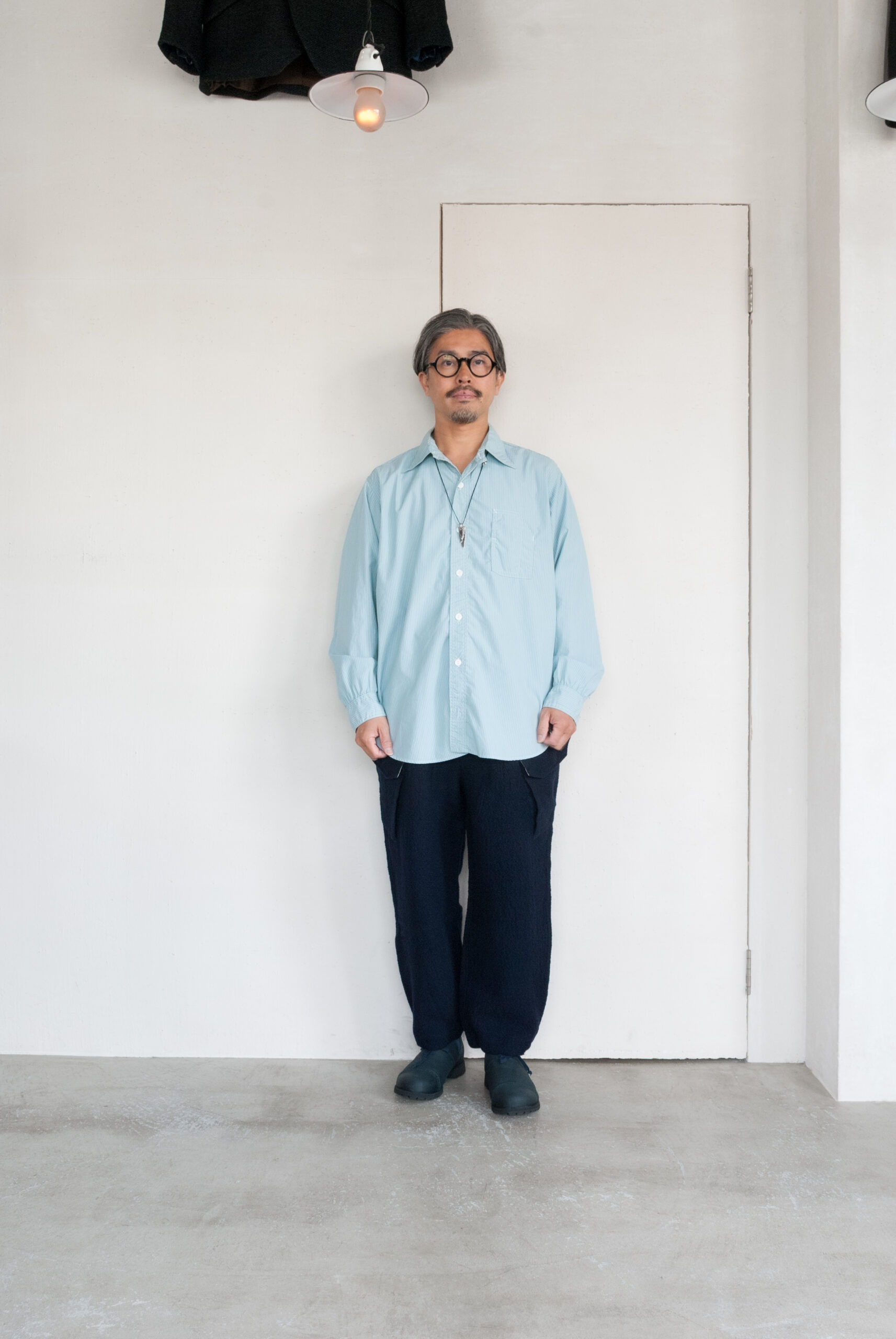 デザイナー大淵さんが1990年頃にF.I.T.(N.Yにあるファッション工科大学)のプロジェクトで作った1920年代風のワークシャツがデザインベースとなっており、袖口やヨーク(肩から背中の切り替え部分)のギャザー等、その当時のアメリカではポピュラーであったディテールを持ちながら、『その時代にありそうで、ない・・・』というポストのコンセプトを体現したようなシャツです。