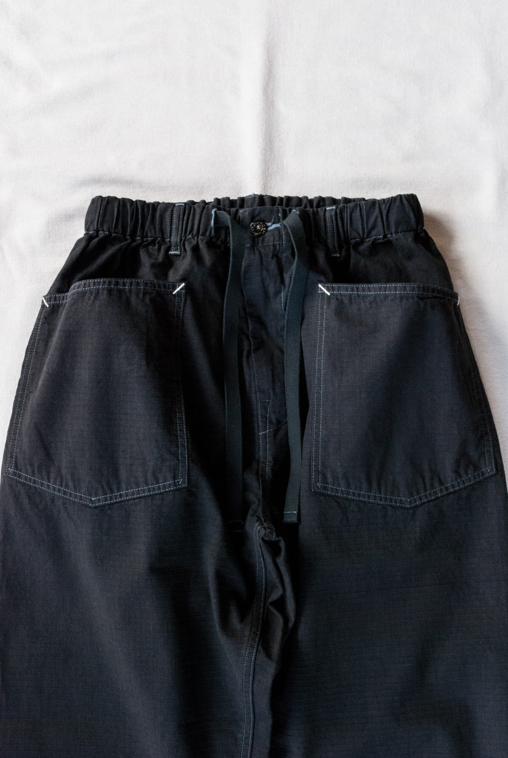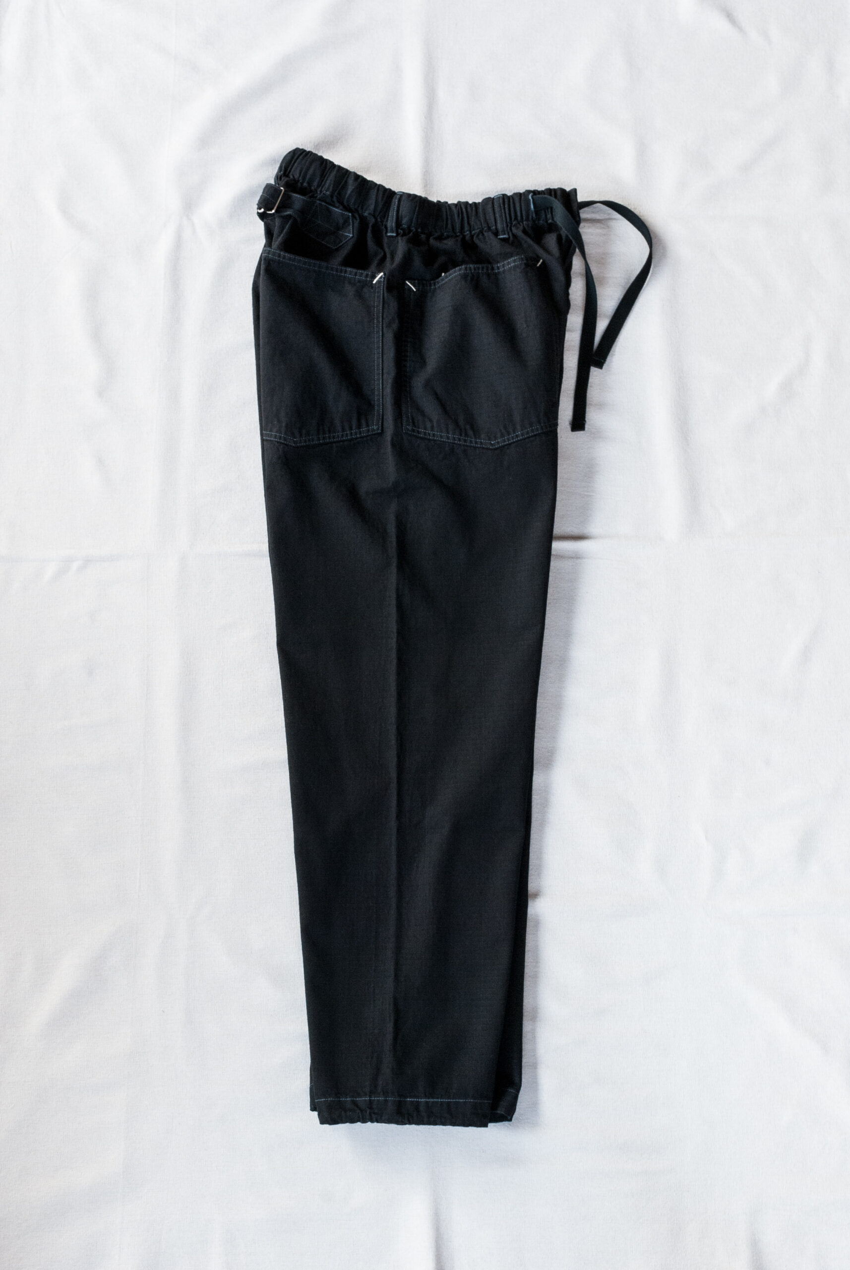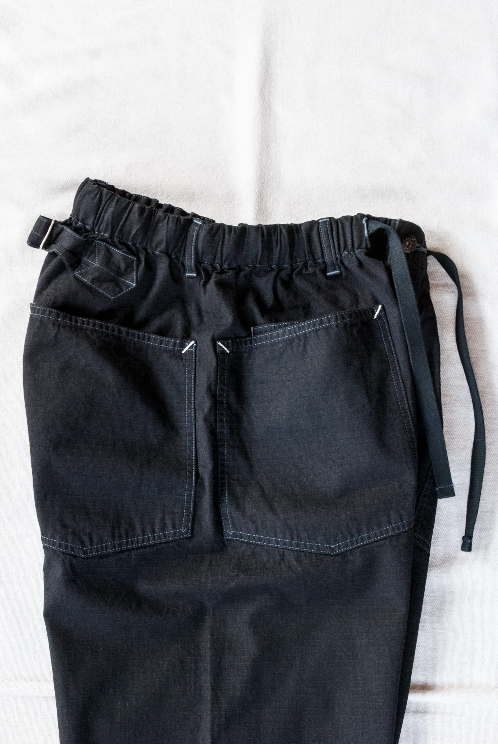 ARMY Pants由来のホームベース型パッチポケットとバックベルト、E-Zシリーズのエラスティックウエスト、裾のドローコードといった、本来なかった仕様を追加し、歴史上有りそうで、無かった、ハイブリッドな軍パンに仕上がっております。