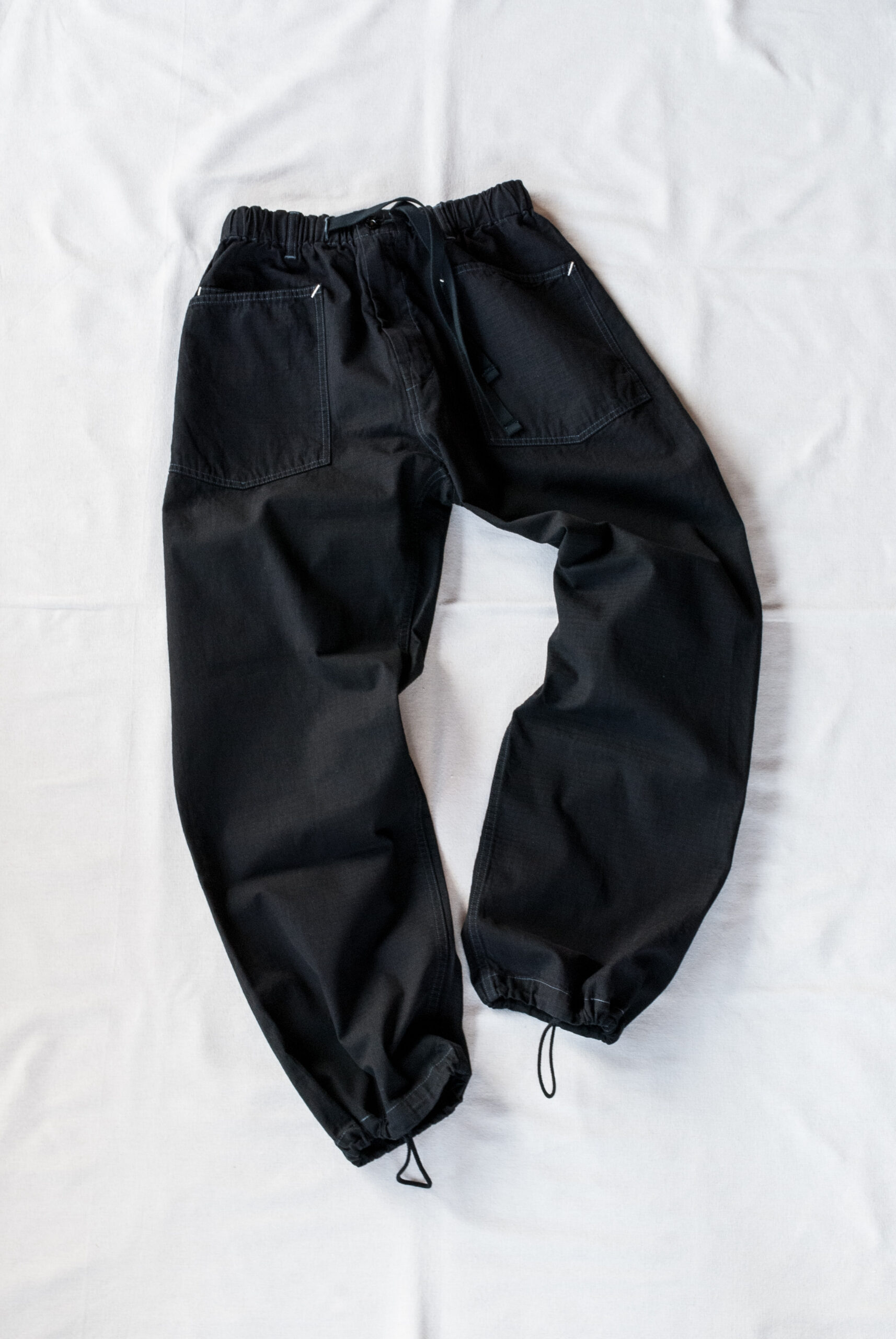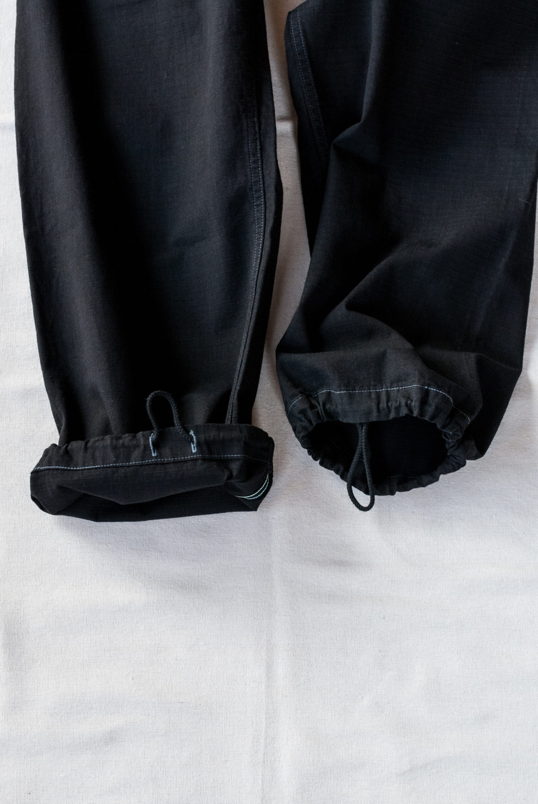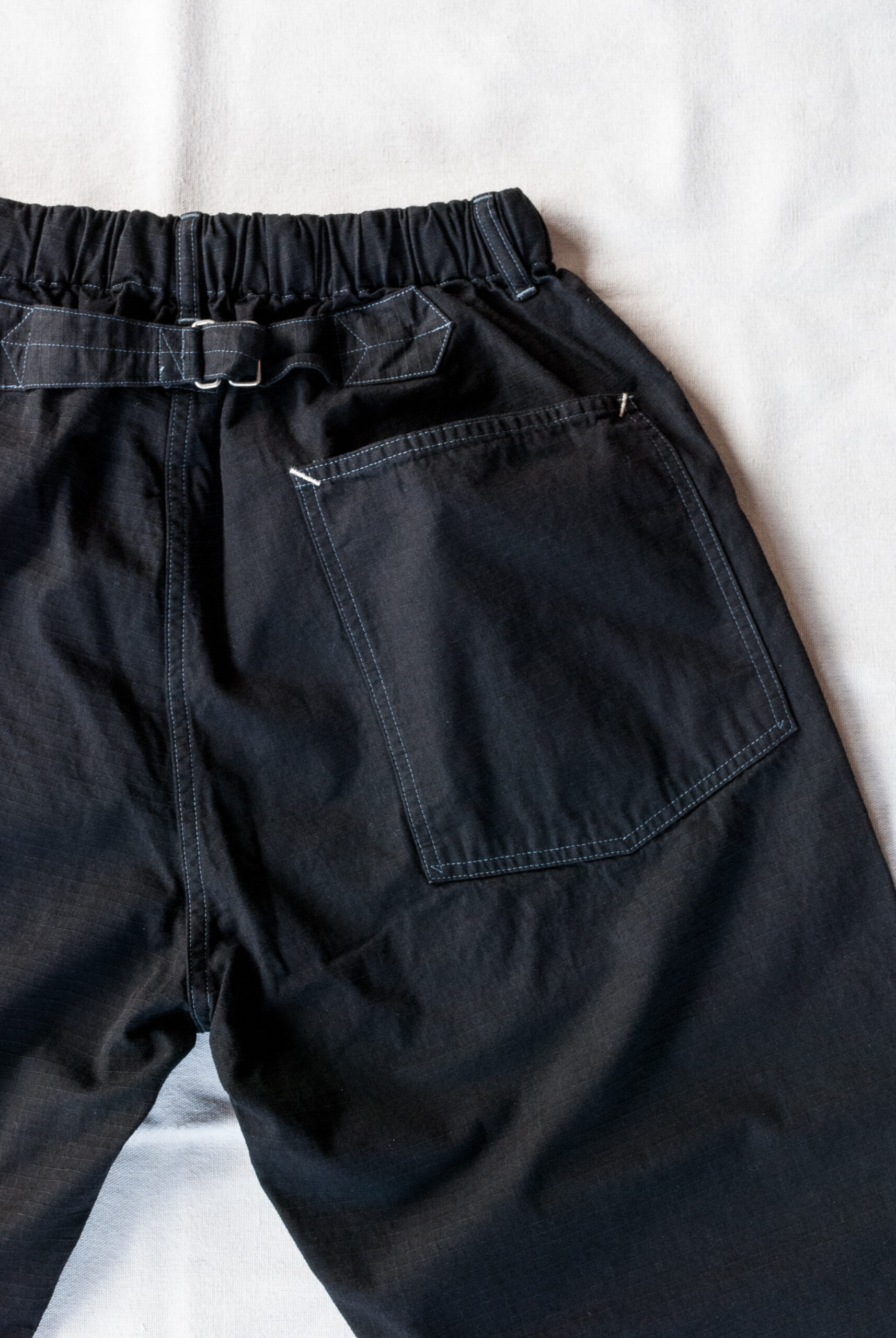 ARMY Pants由来のホームベース型パッチポケットとバックベルト、E-Zシリーズのエラスティックウエスト、裾のドローコードといった、本来なかった仕様を追加し、歴史上有りそうで、無かった、ハイブリッドな軍パンに仕上がっております。