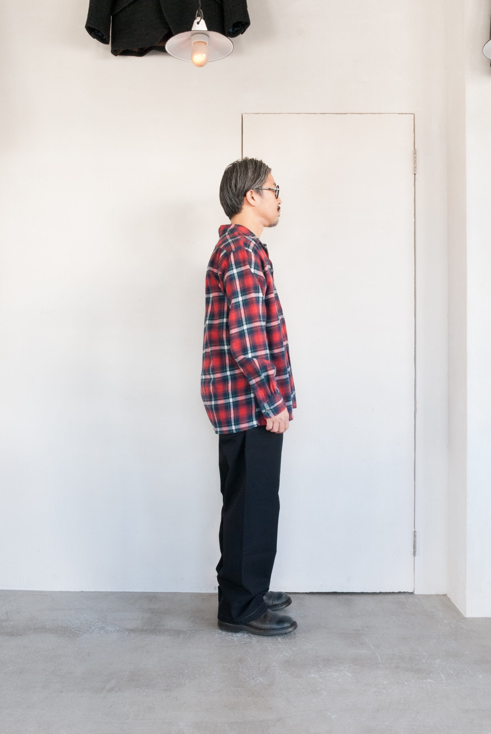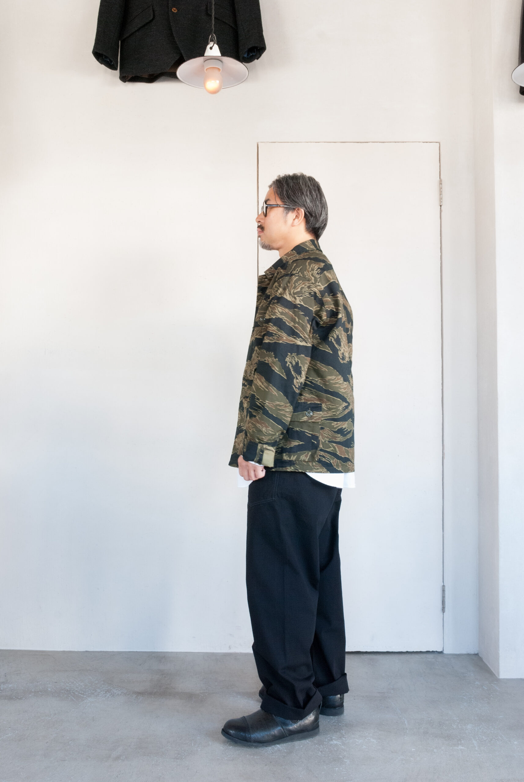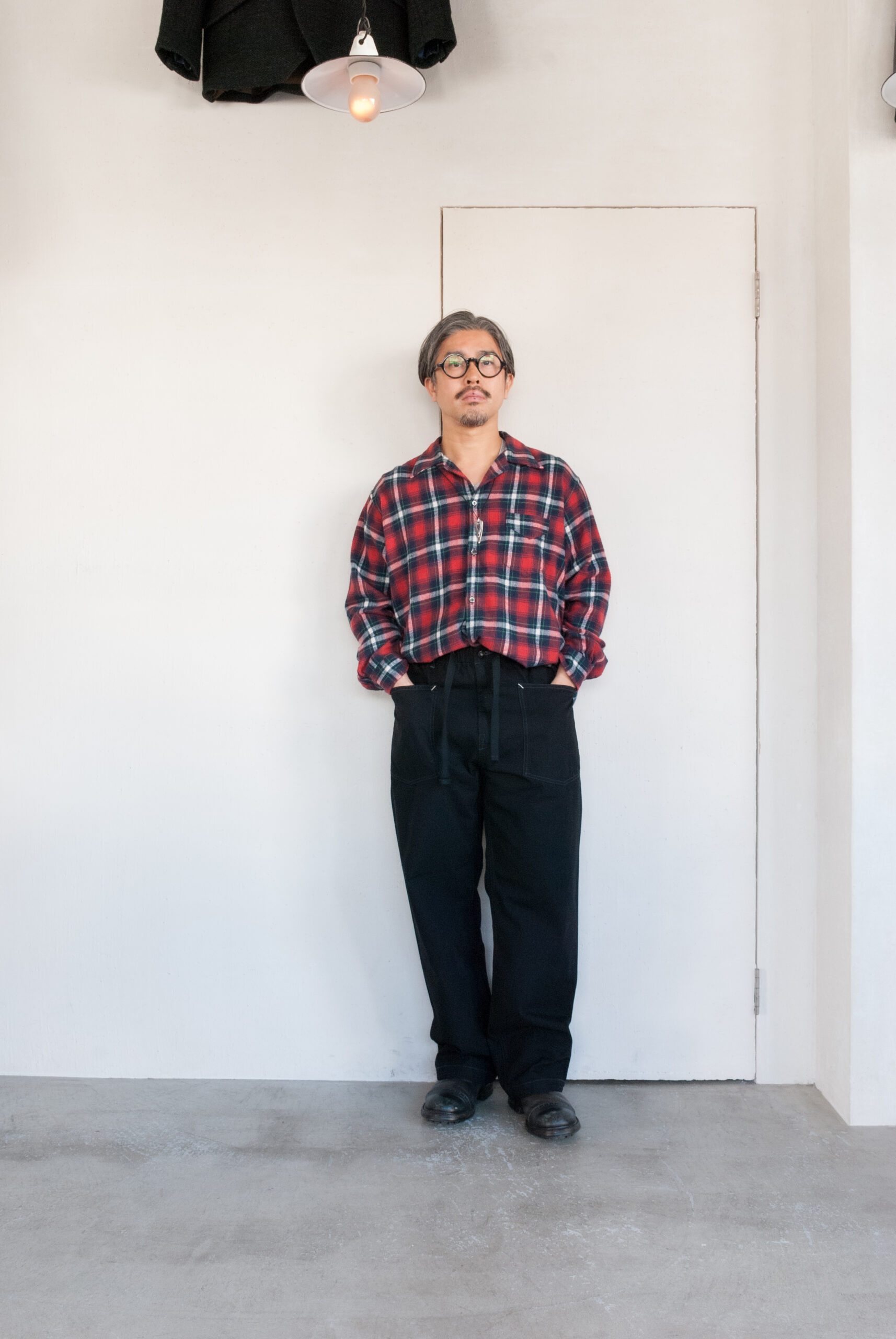 さらに、サイドシームのない巻きパンツのパターン上の問題(腰周りがタイトでお尻が張る)を、ややゆとりのあるパターンに変更し、ウエストをイージー化することによって解消し、ビンテージの軍パンのムードをきっちりと継承しながら穿きやすい。とても現代的なパンツにアップデートされています。