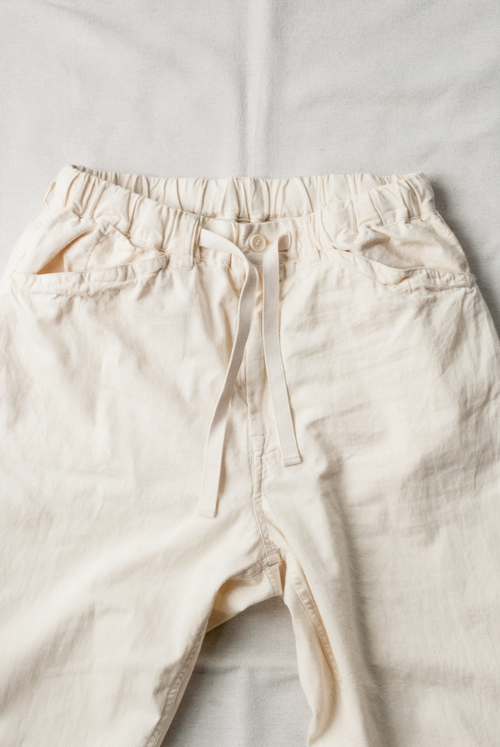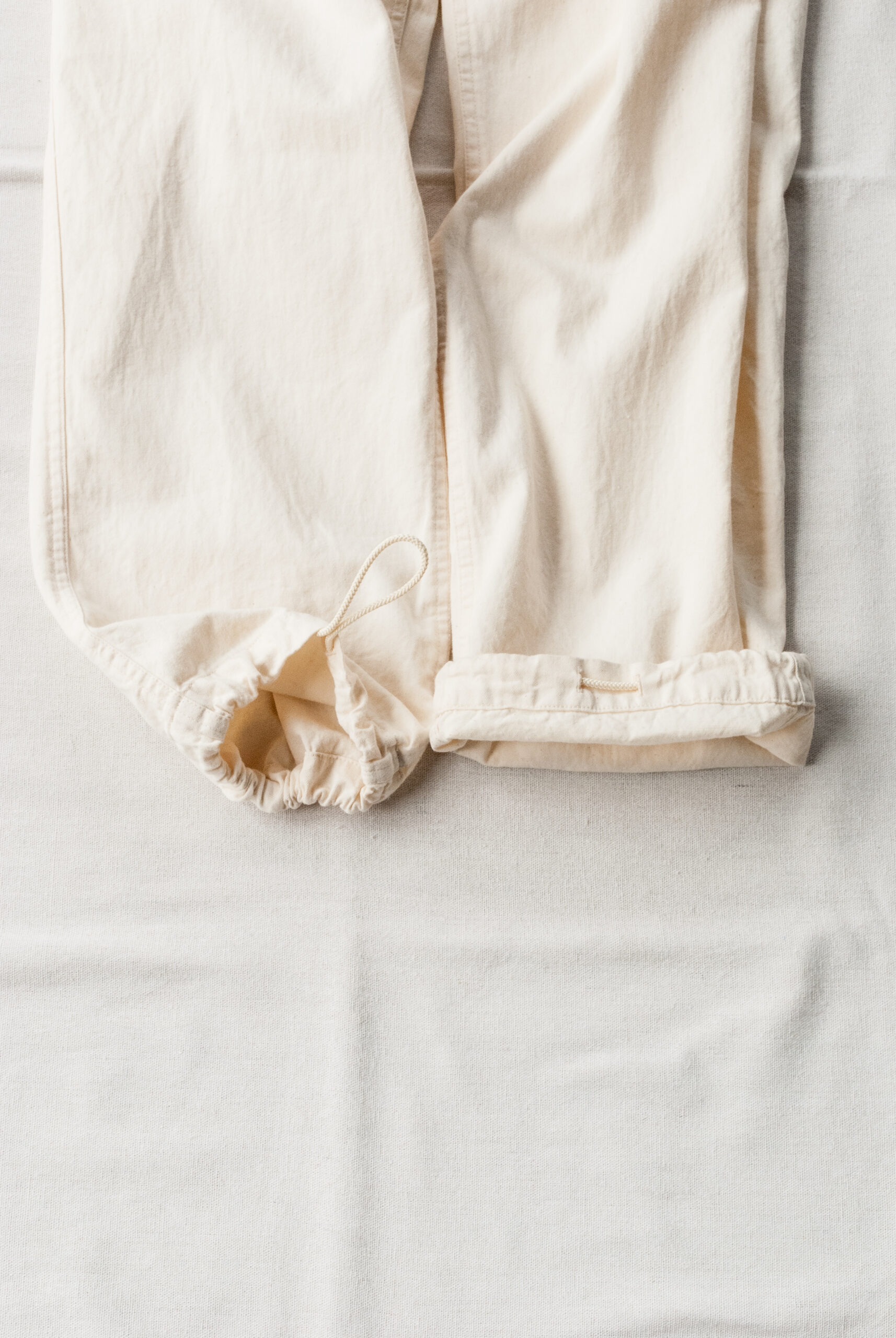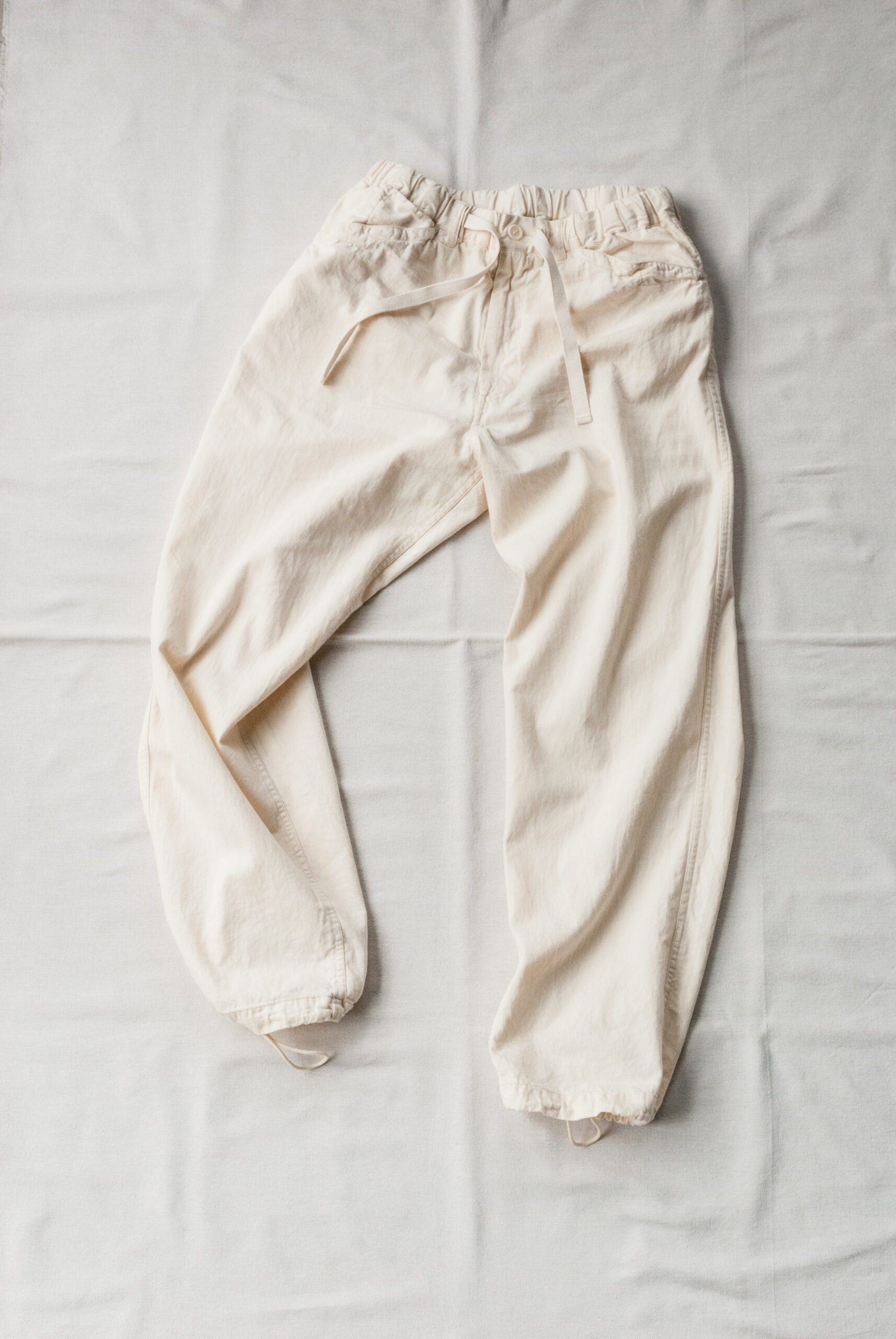 パターンは、お尻周りにゆとりがあるので穿きやすく、ゆるくかかったテーパード、ドローコードで調整可能な裾、ヘム幅は約2.5cmなので、そのまま2回ほどロールアップして穿くとサンダルとのバランスも良い感じになります。