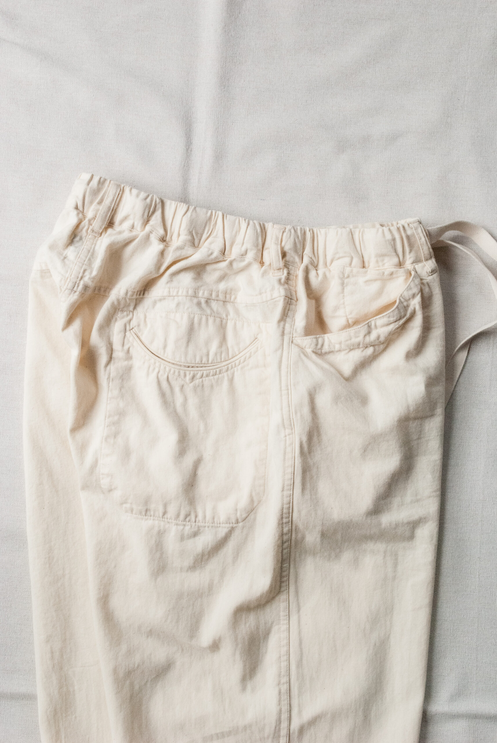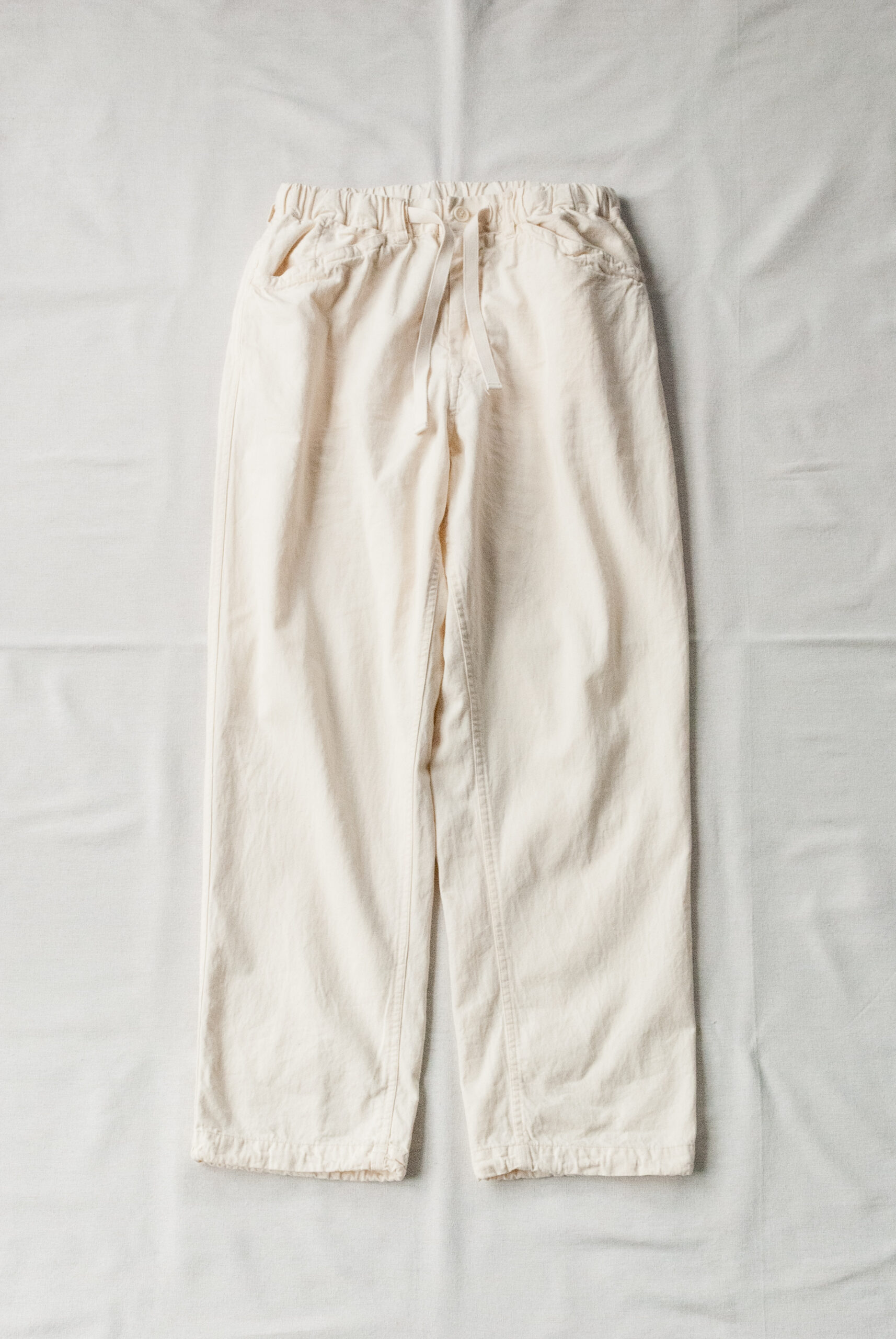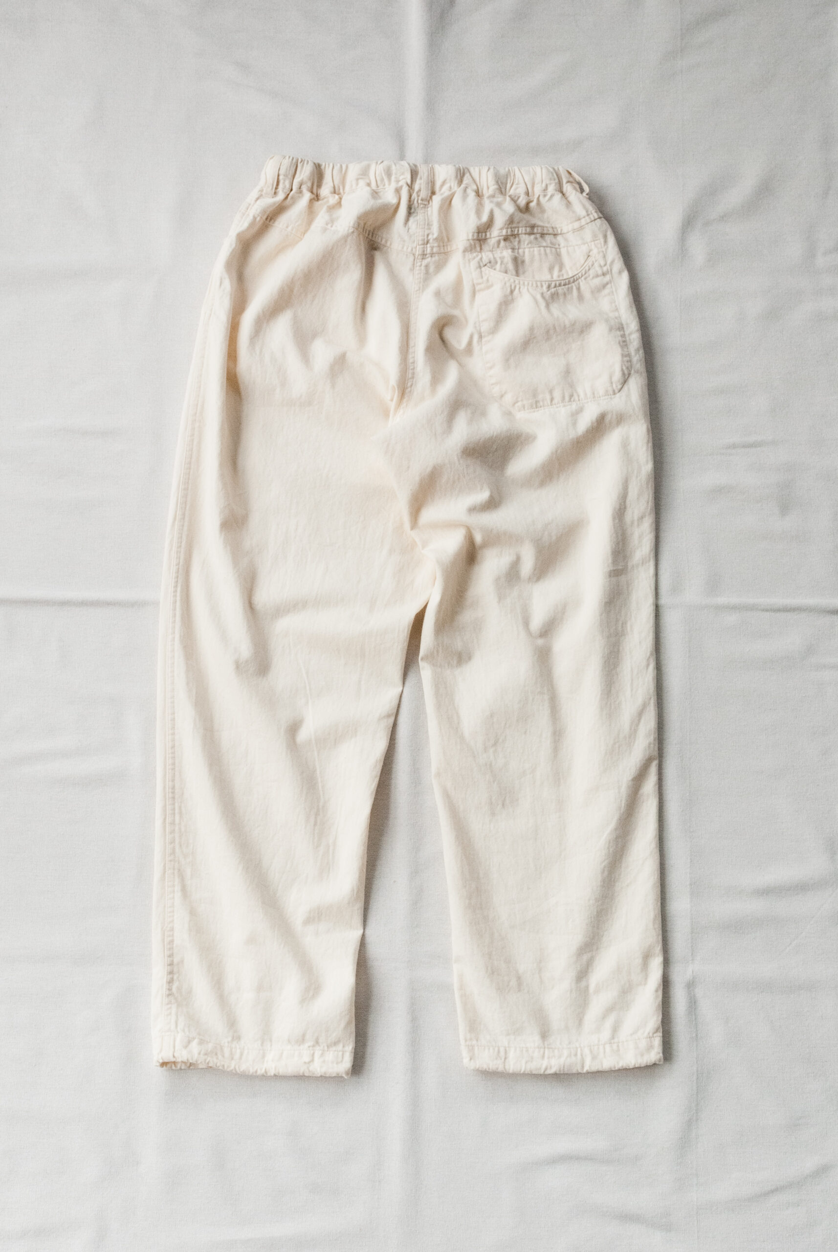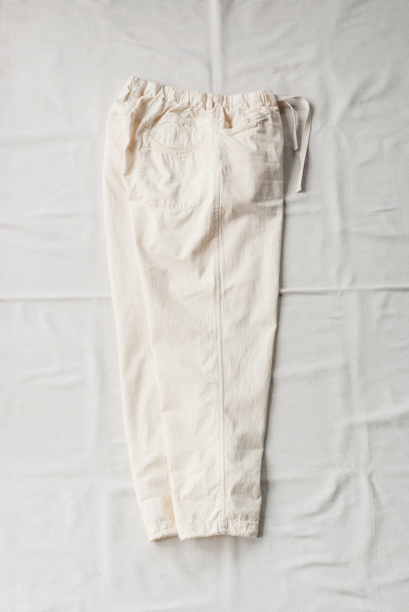 パターンは、お尻周りにゆとりがあるので穿きやすく、ゆるくかかったテーパード、ドローコードで調整可能な裾、ヘム幅は約2.5cmなので、そのまま2回ほどロールアップして穿くとサンダルとのバランスも良い感じになります。
