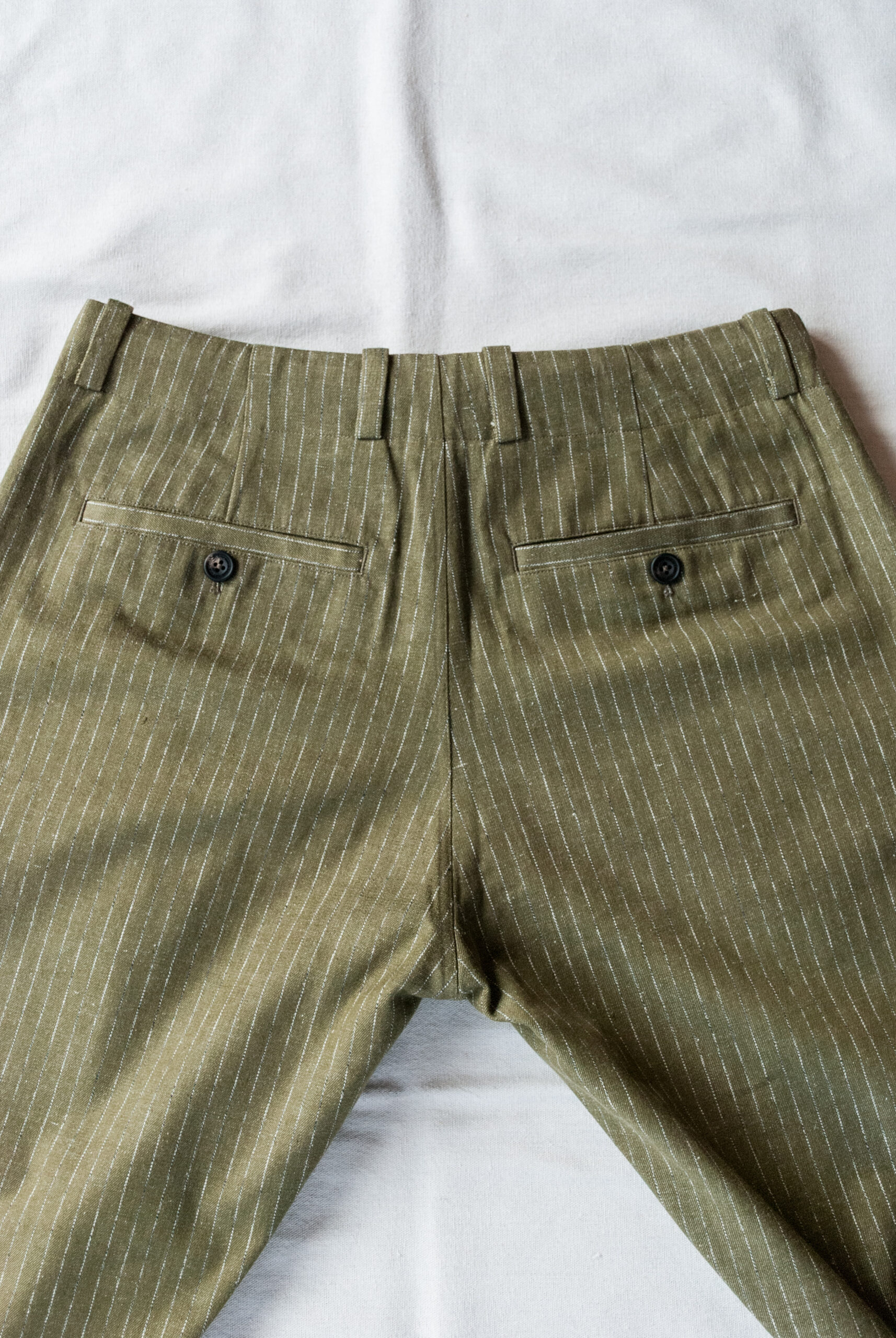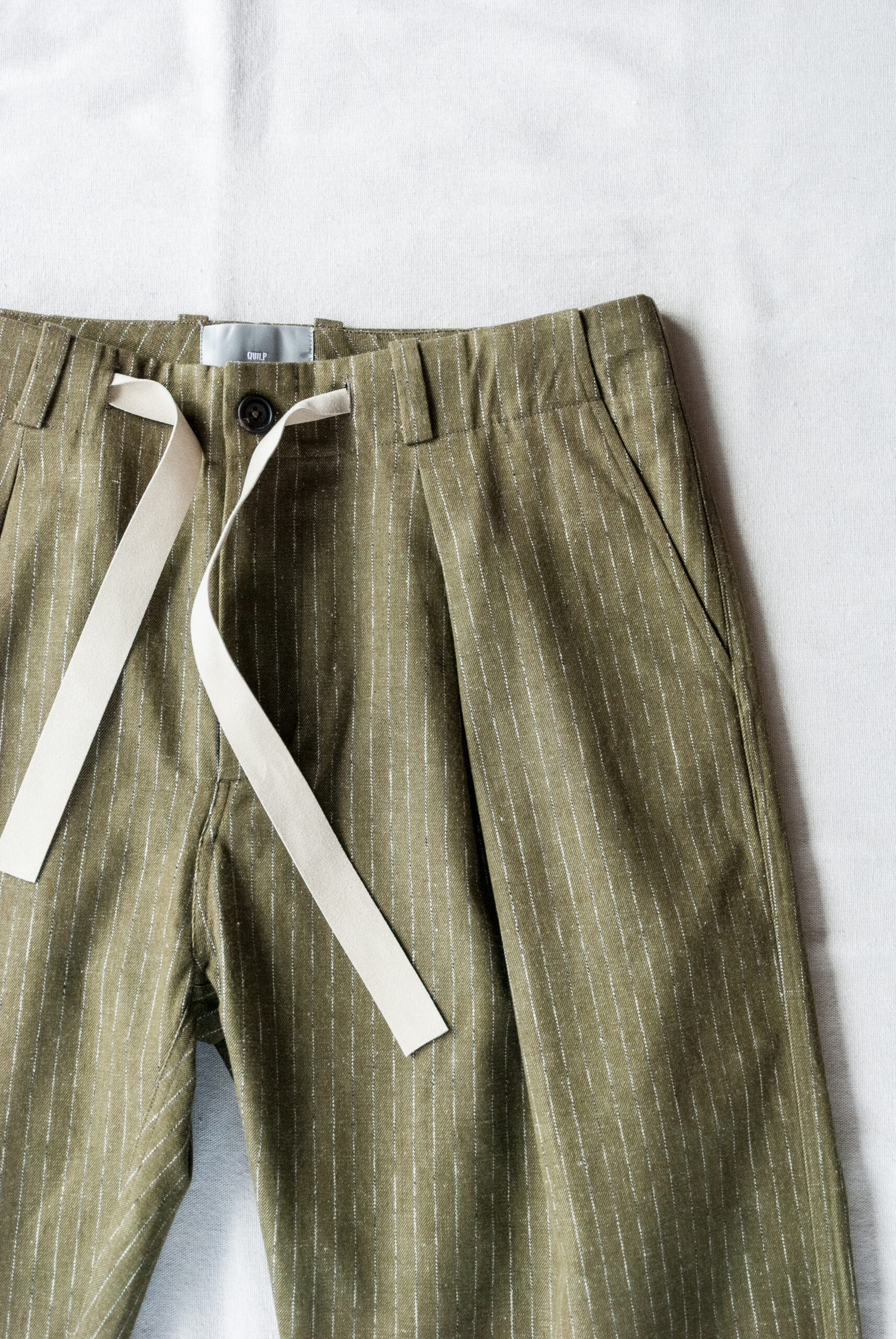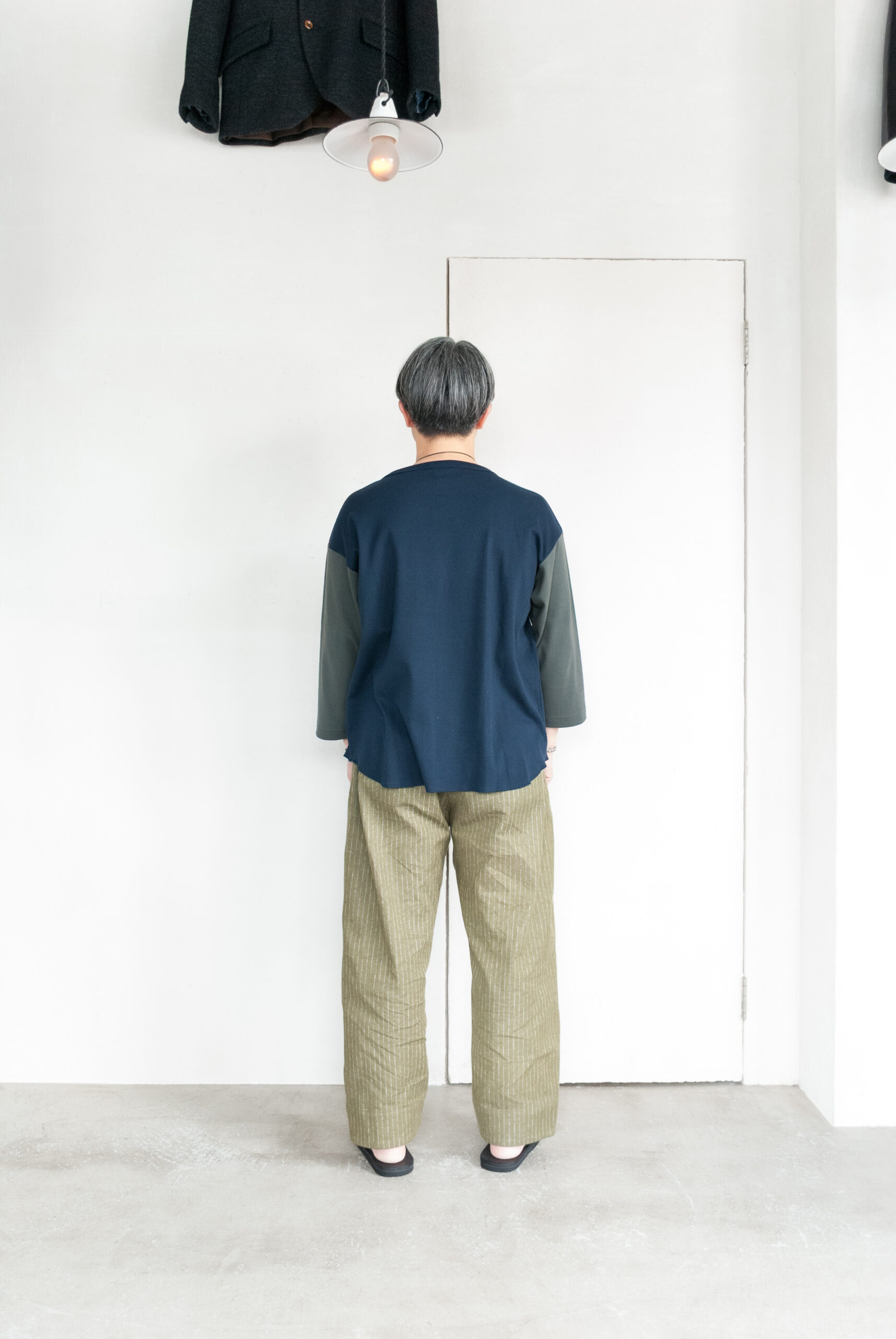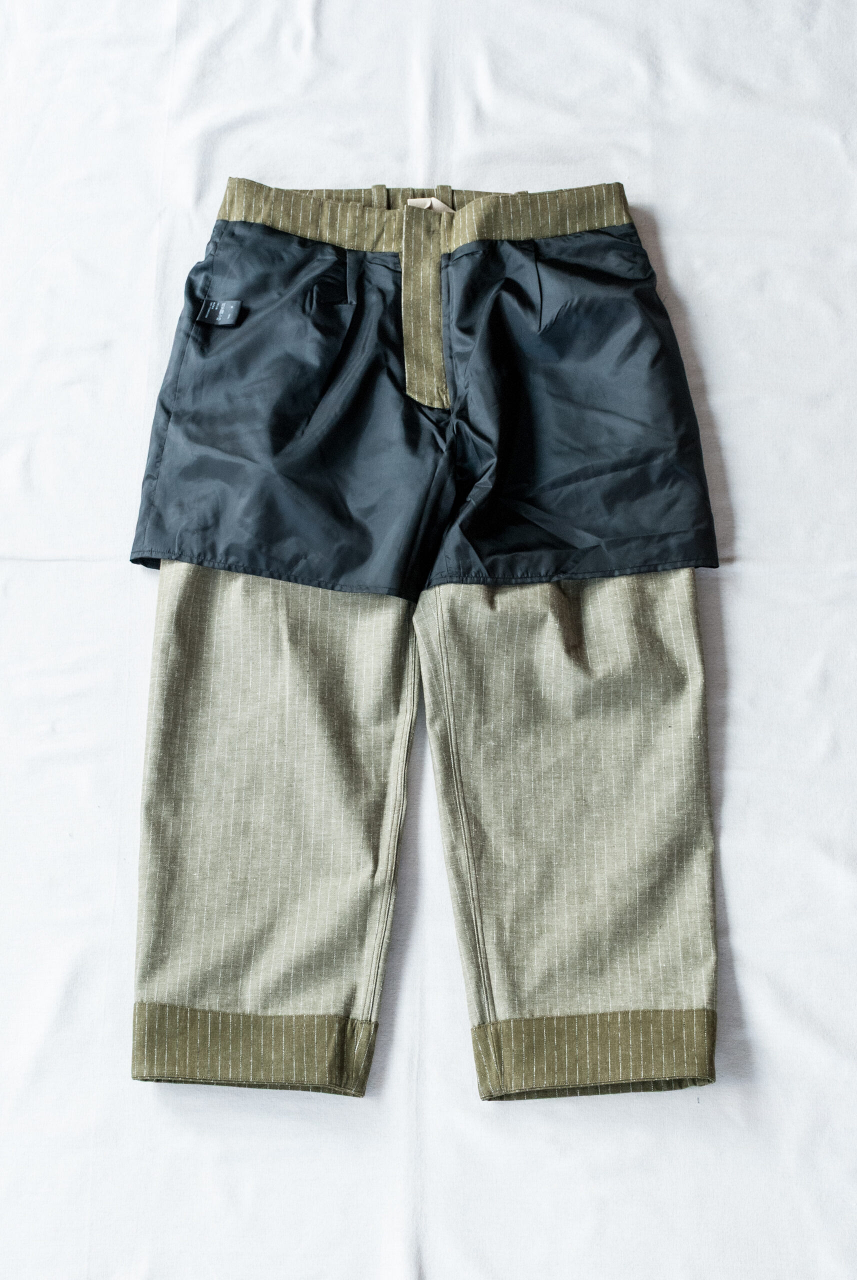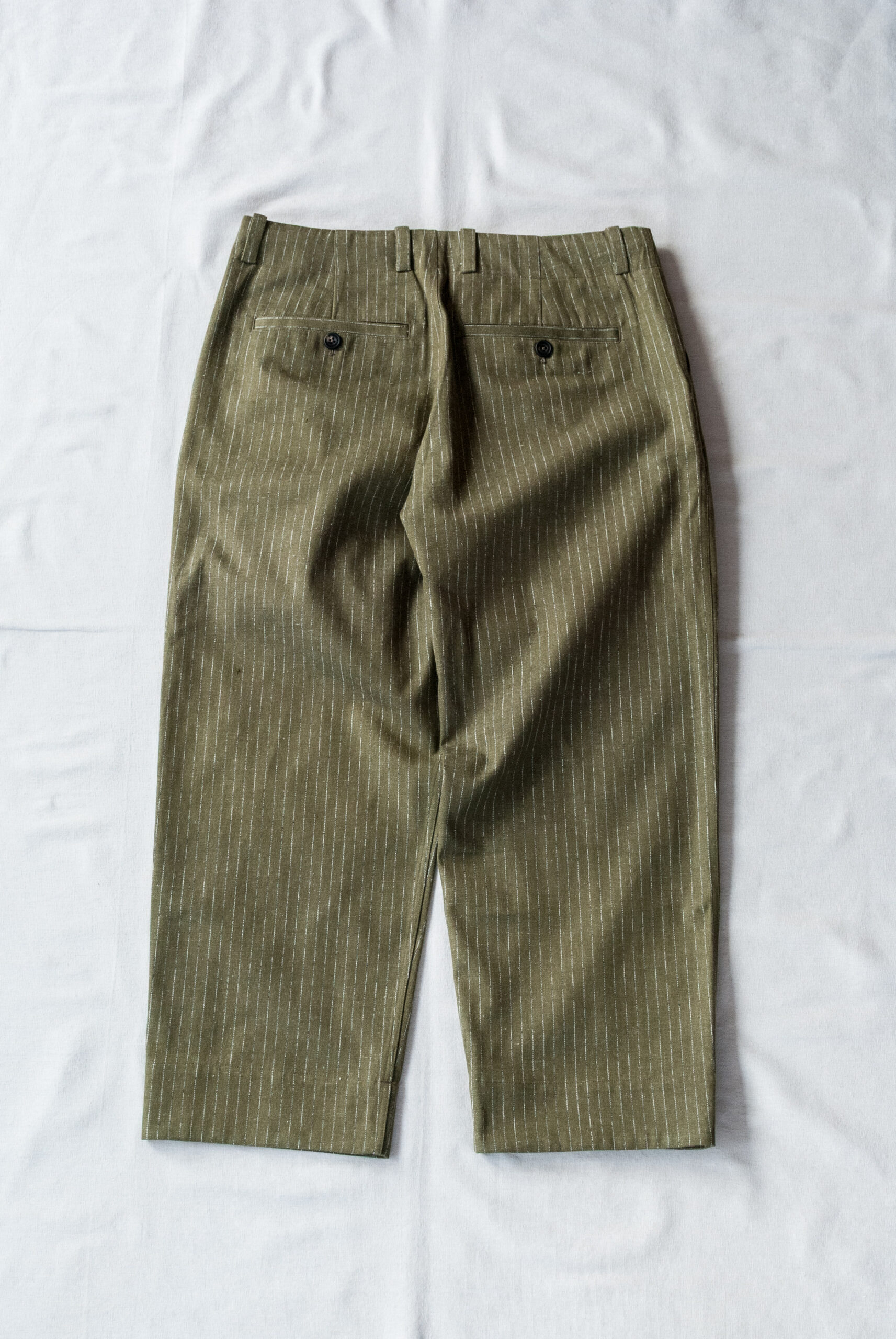 この希少なグリーンデニムを、ありふれたアメリカンスタイルの5ポケットパンツやミリタリースタイルに落とし込むのではなく、独自の視点で再構築。