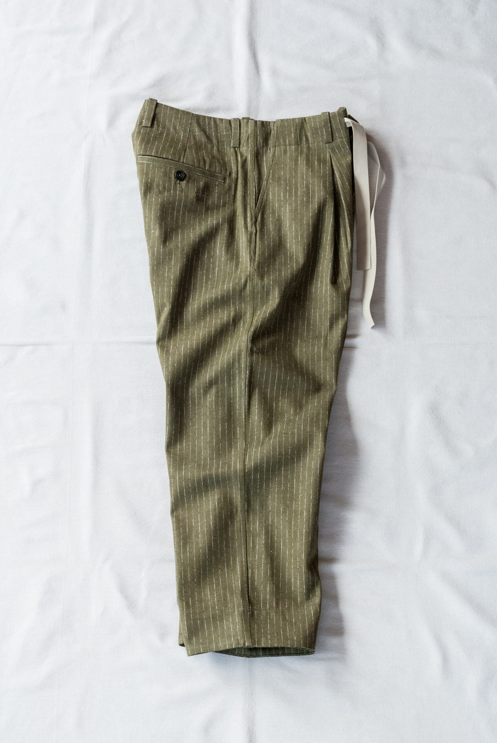 深いタックを取った太めのワークトラウザーズとして仕上げた無骨さの中に知性が宿る、まさにQUILPらしいバランス感覚が光る一本に。