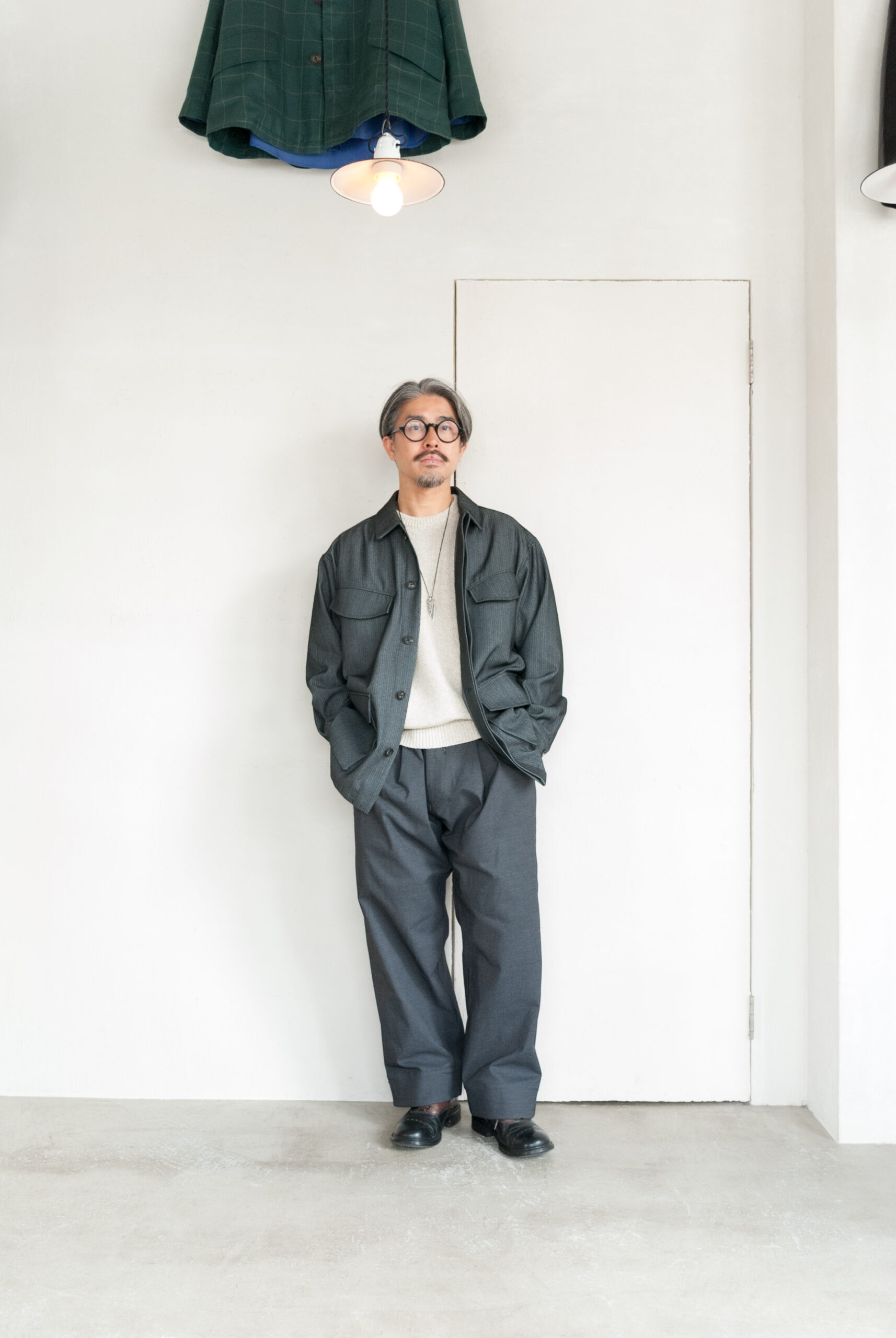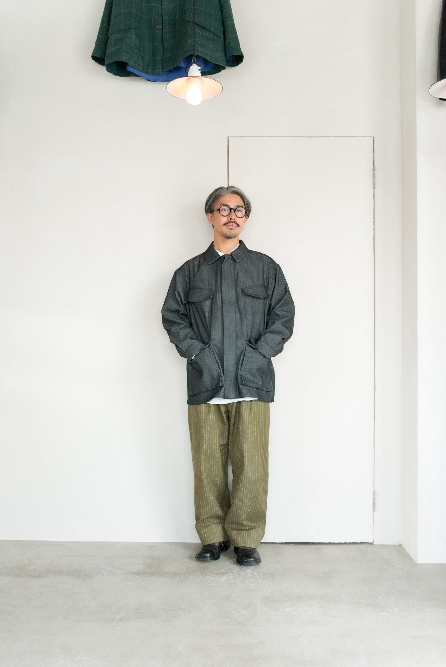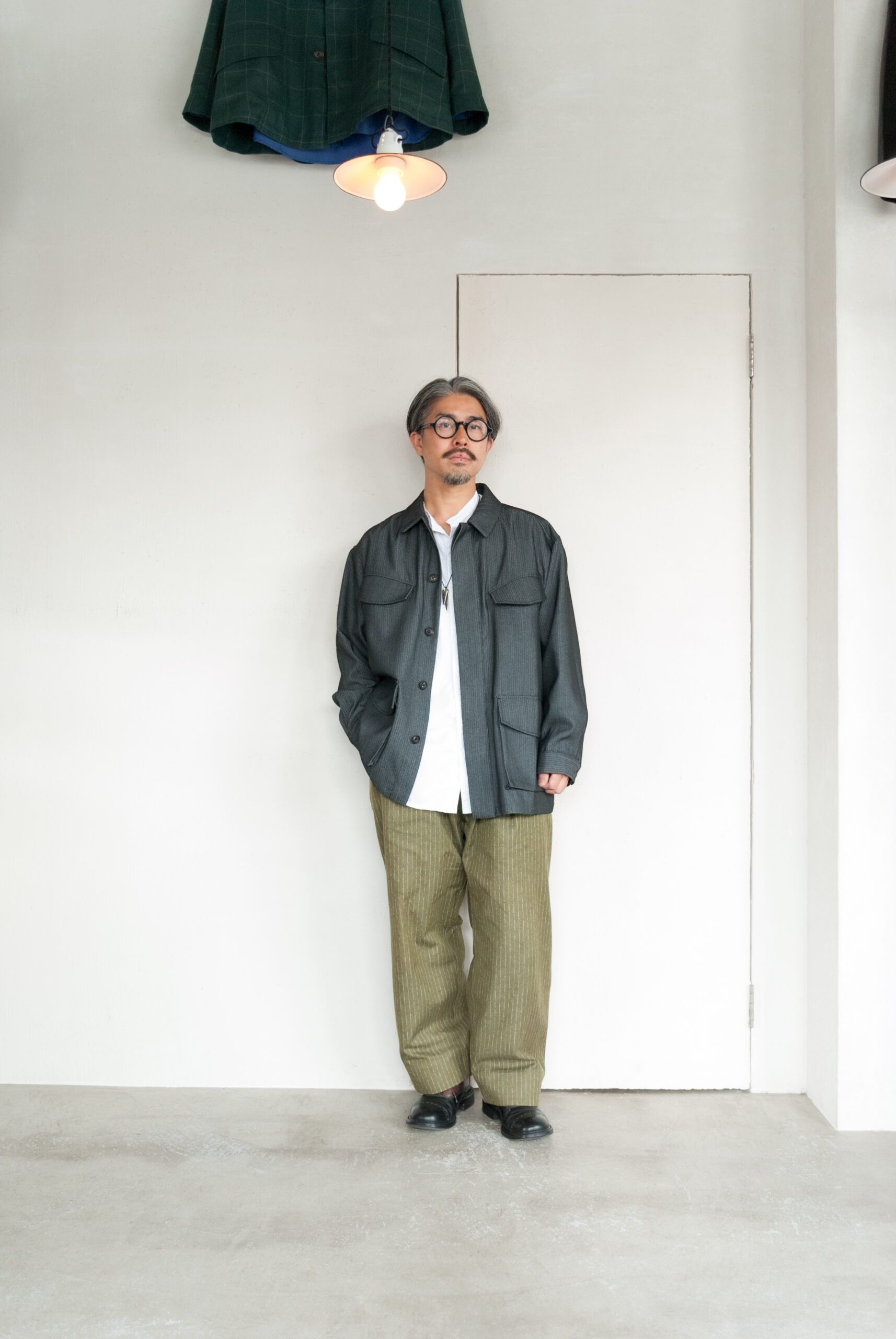 アメリカ軍のB.D.U.ジャケットやフランス軍のM47フィールドジャケットを思わせながらも、QUILPらしいどこか肩の力が抜けた雰囲気。