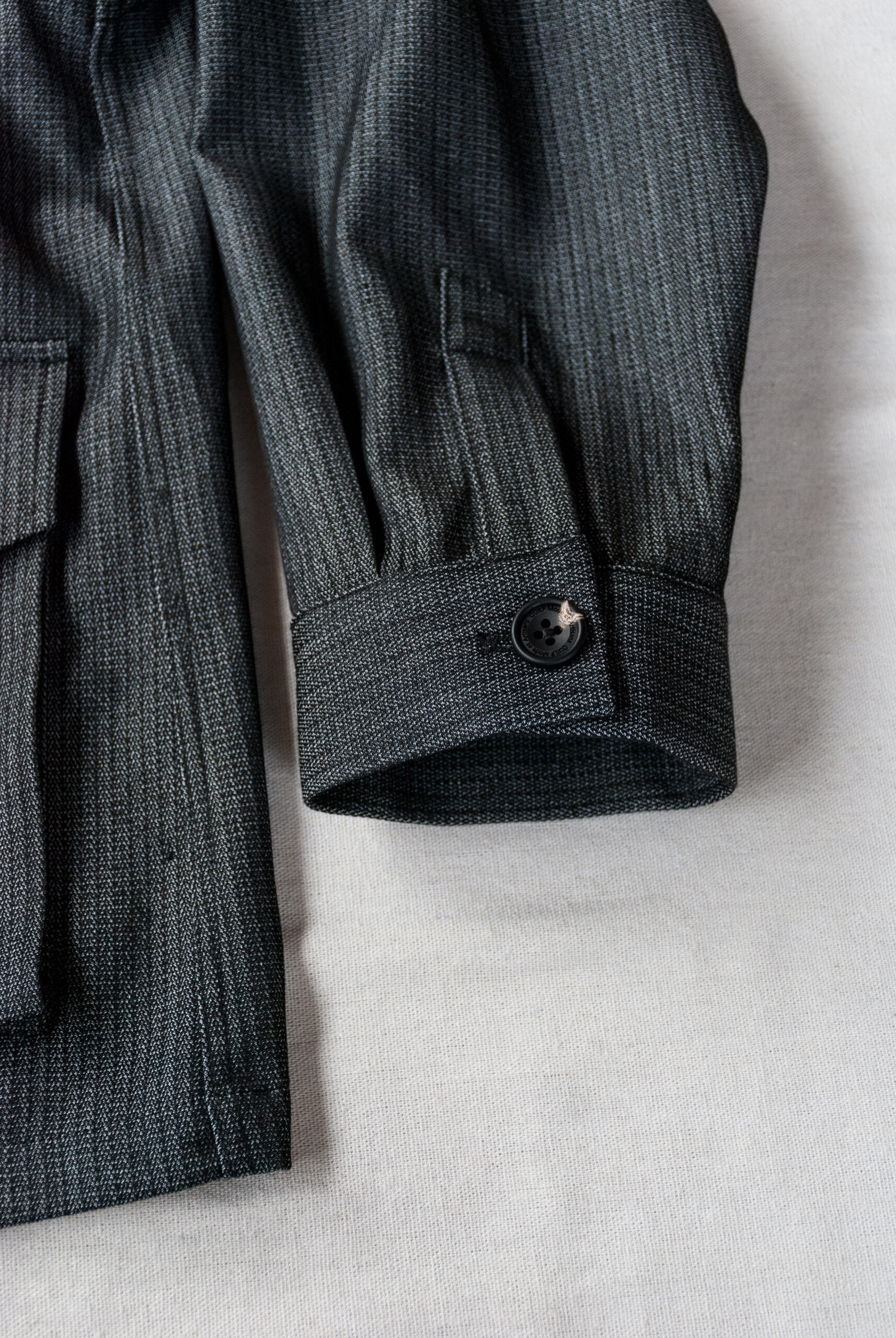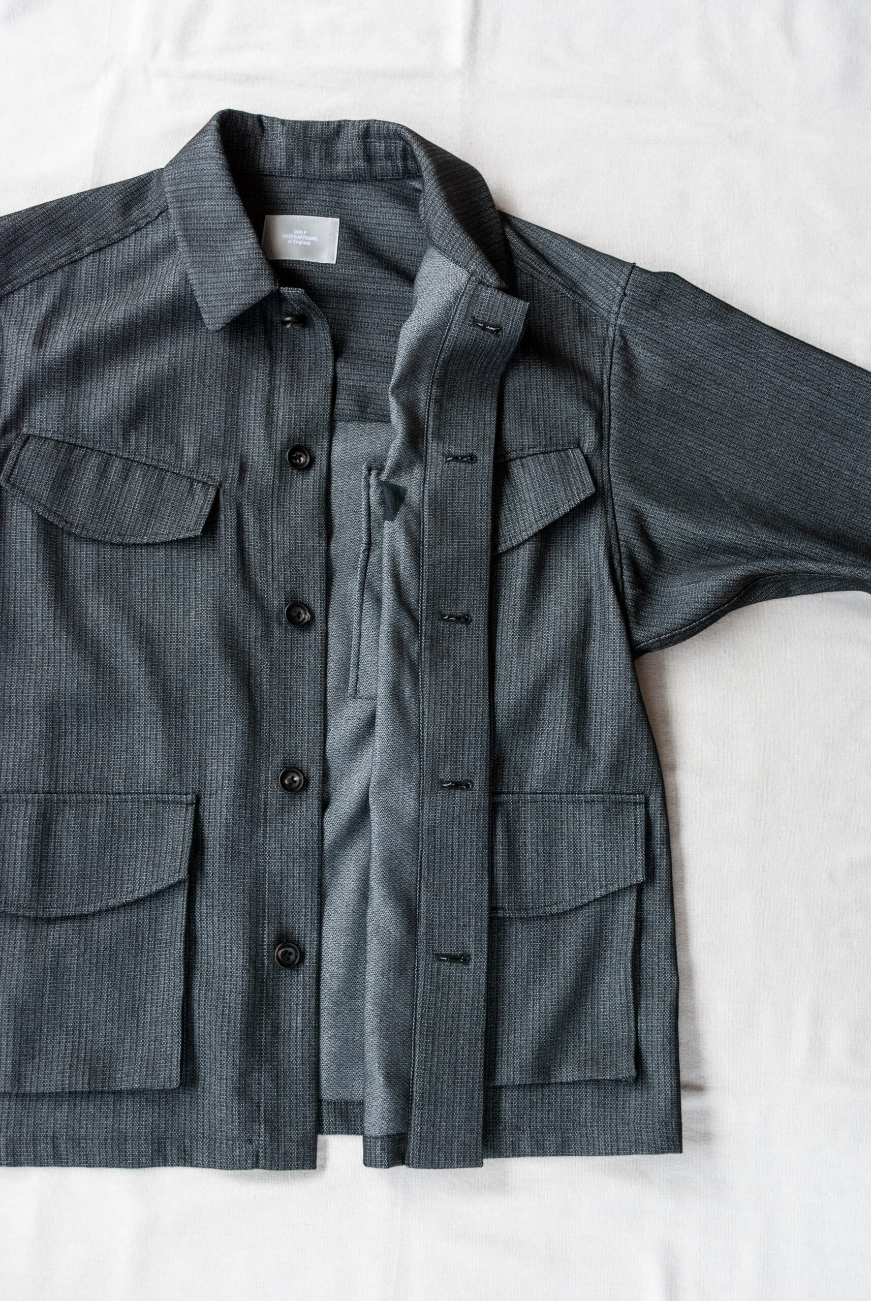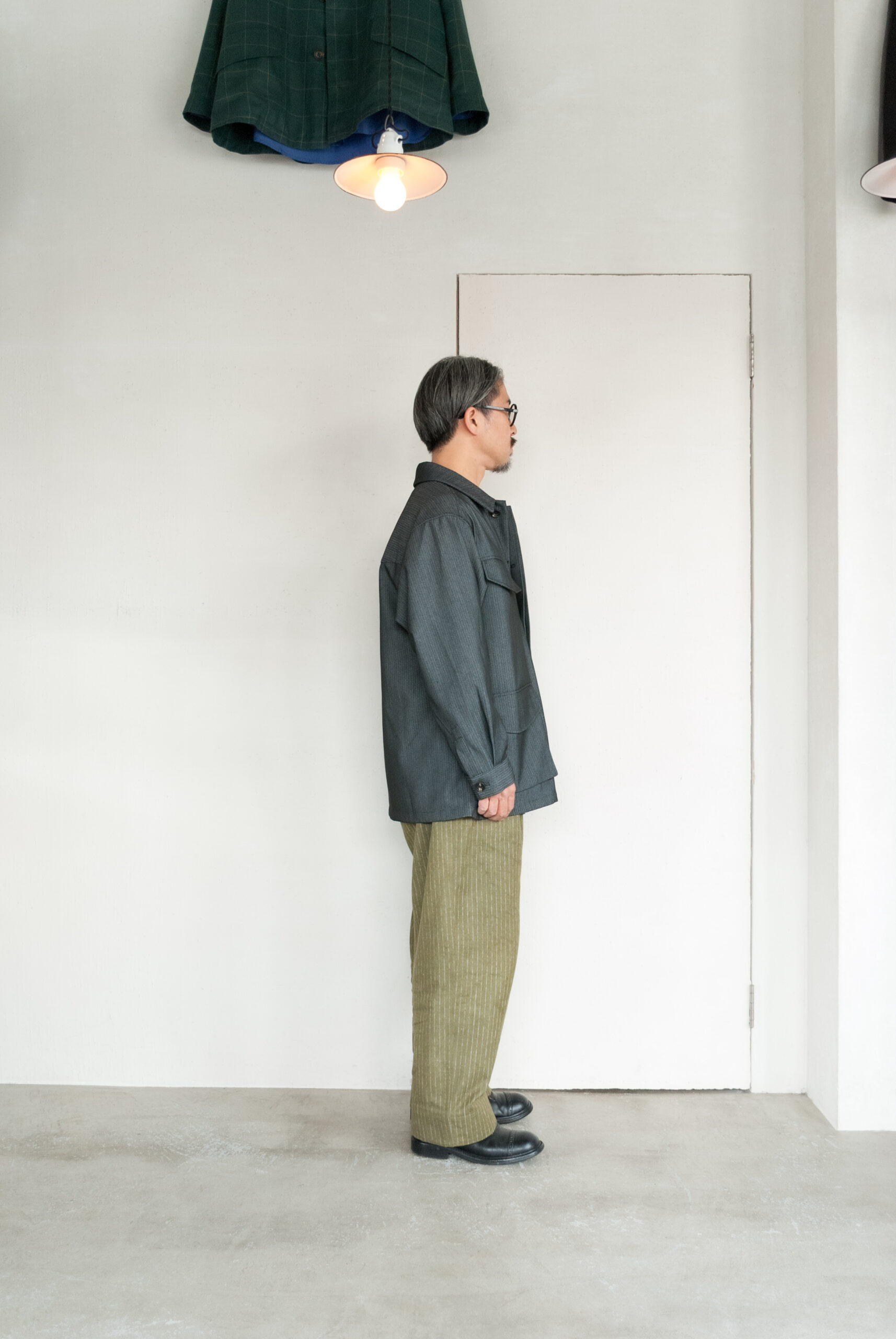 アメリカ軍のB.D.U.ジャケットやフランス軍のM47フィールドジャケットを思わせながらも、QUILPらしいどこか肩の力が抜けた雰囲気。