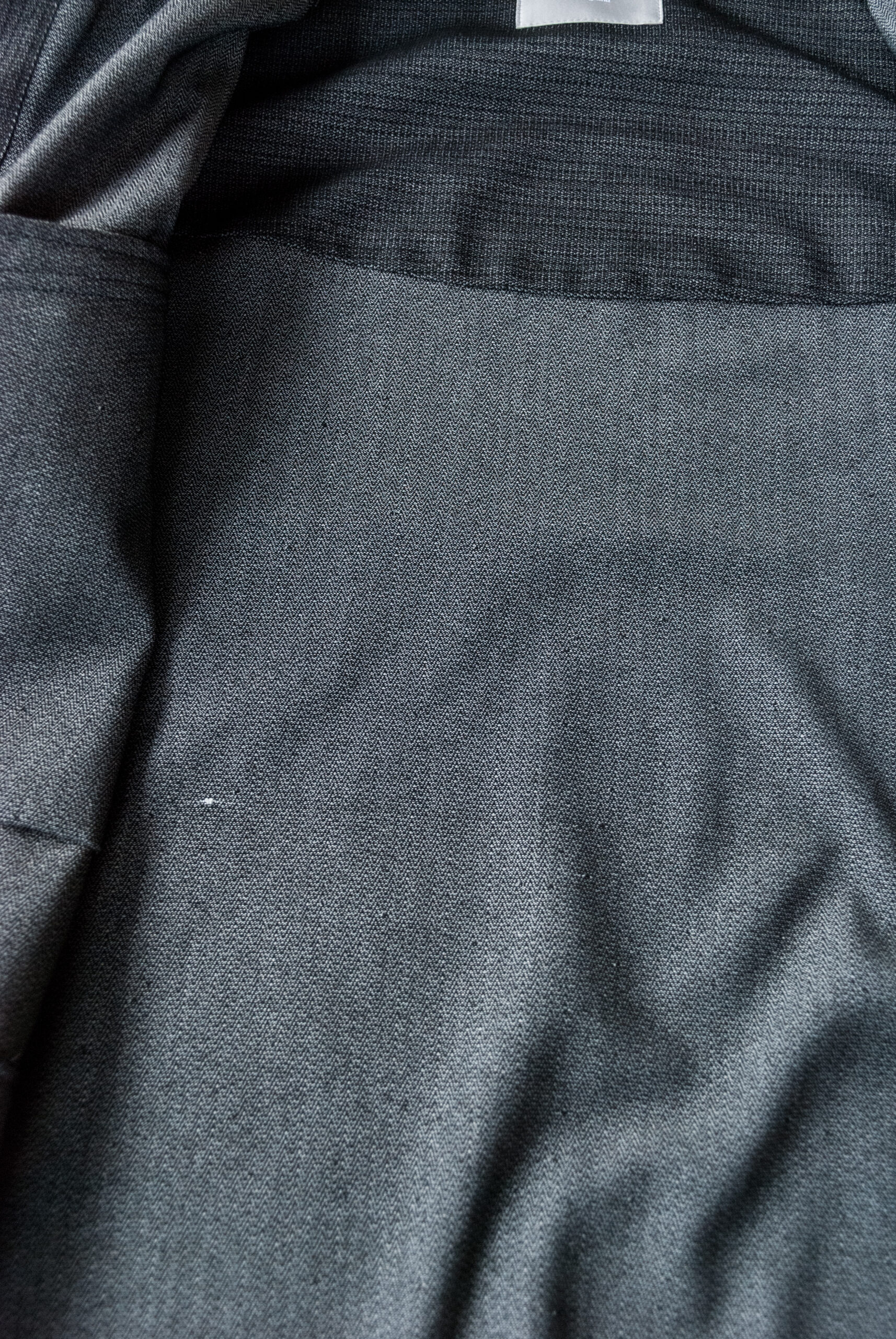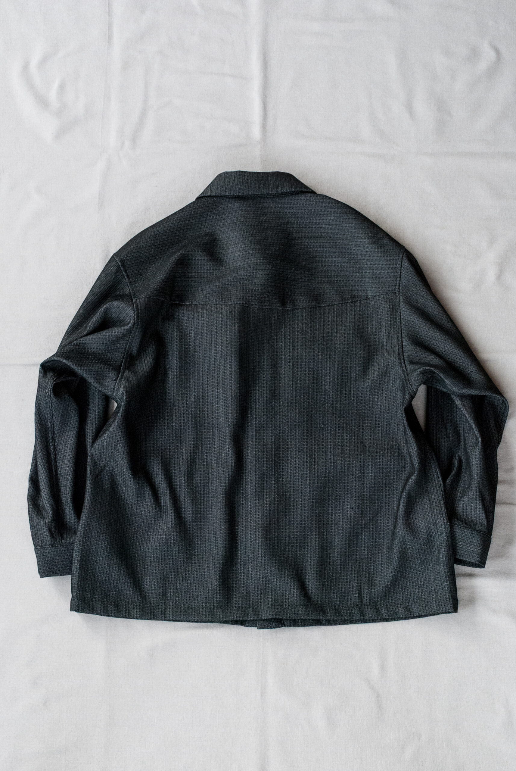 ポリエステル75%、コットン25%の素材は、表面がうっすらとストライプのようなピケ調、裏面はヘリンボーン風の織りが特徴で、デッドストックならではのネップ感が、味わい深い表情を生み出しています。