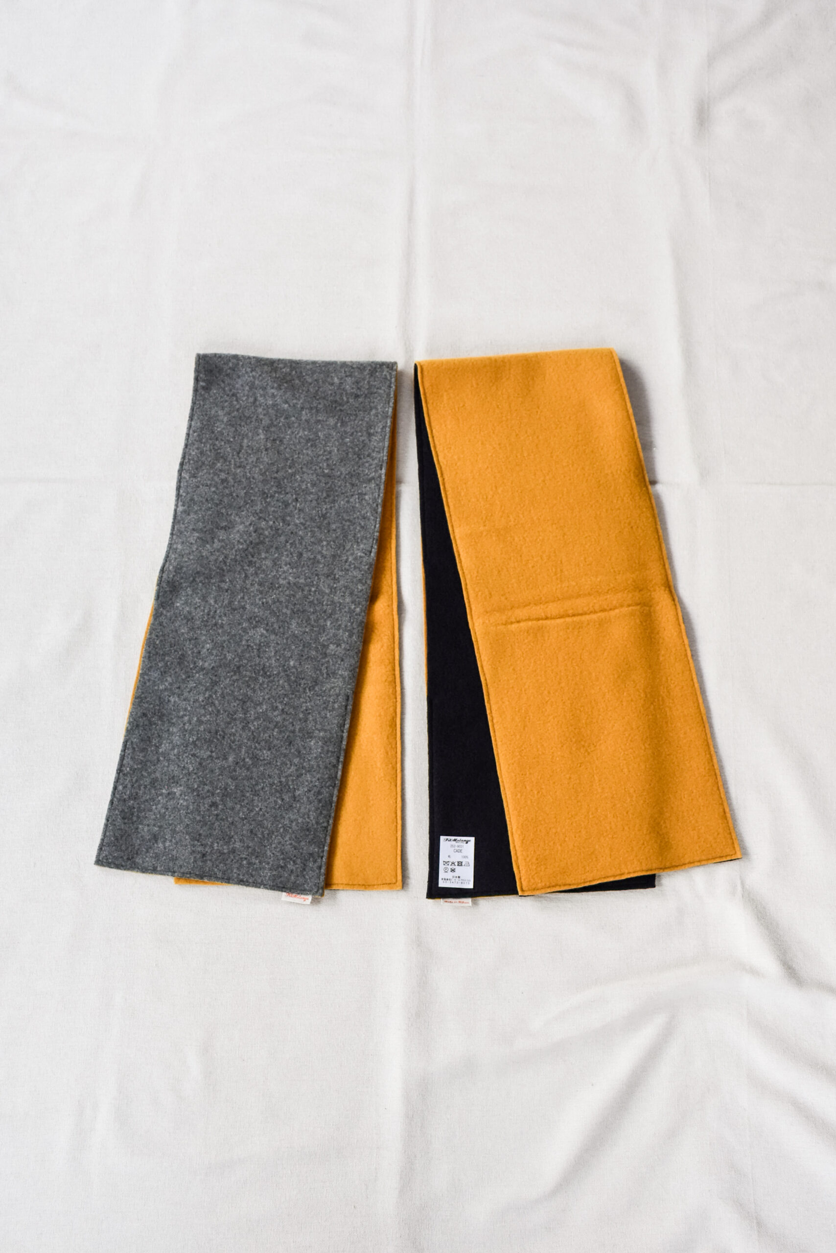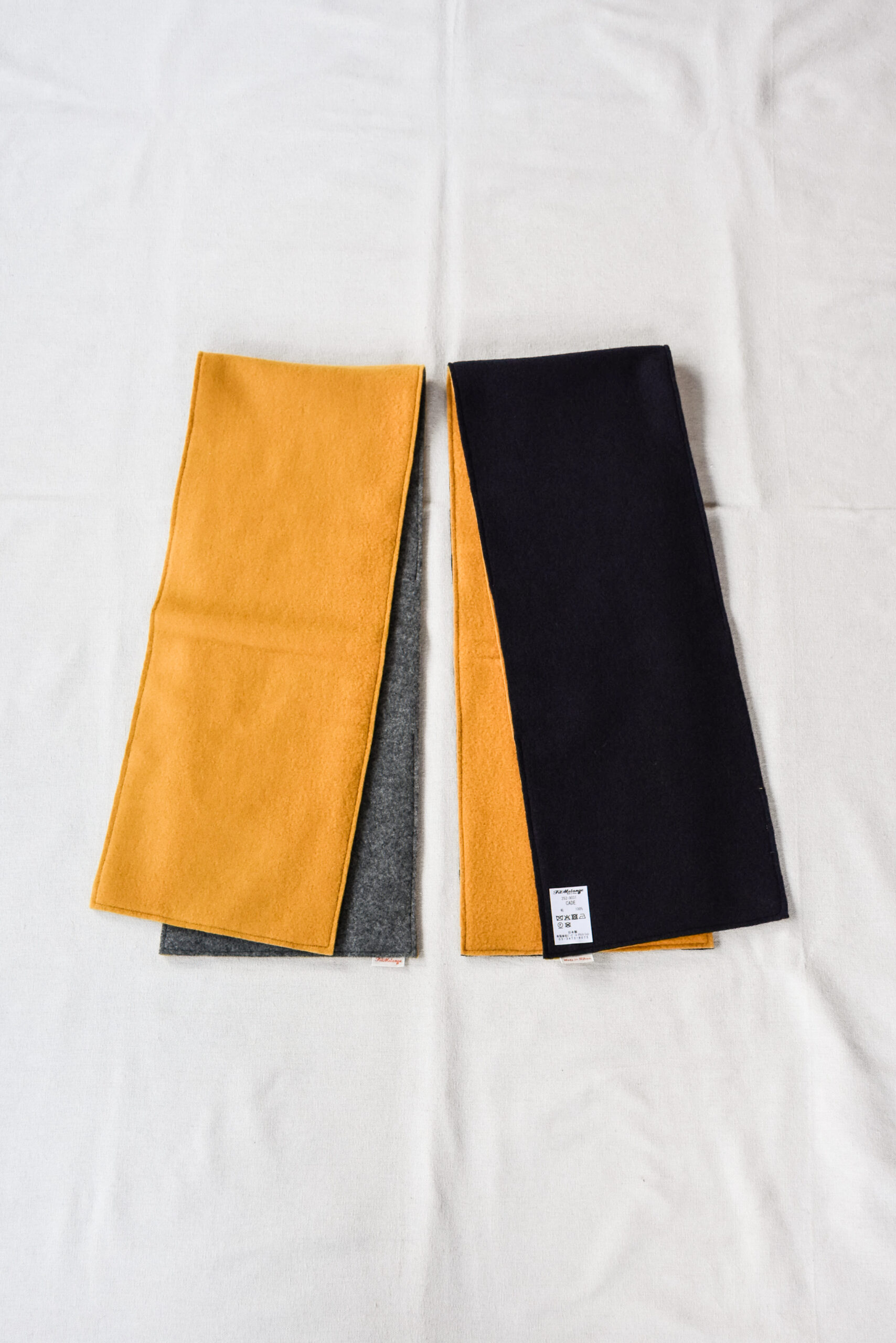 その生地を105×20cmという扱いやすいサイズに裁断し、二枚重ねで丁寧に縫製したのが、このマフラー『CADE』です。