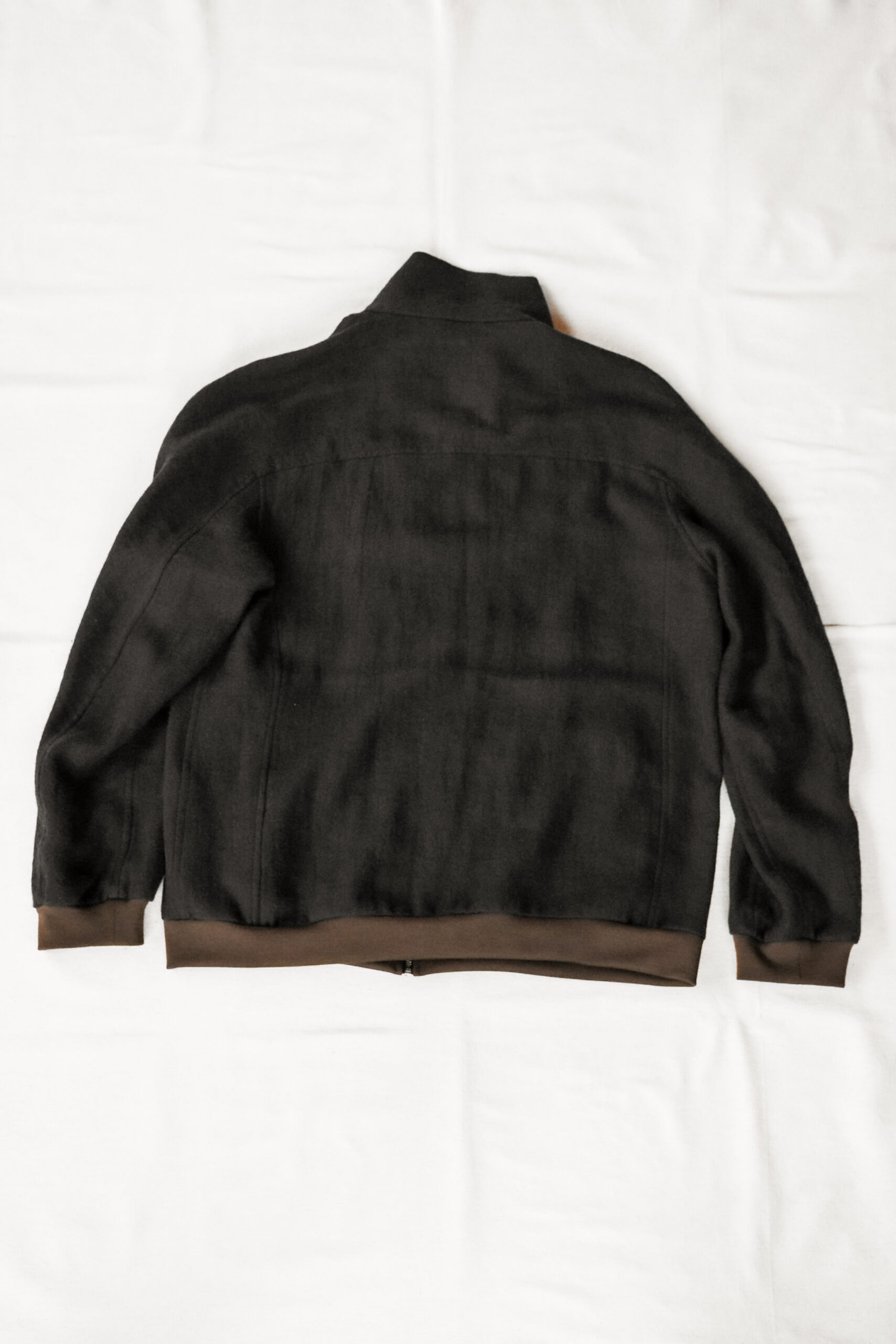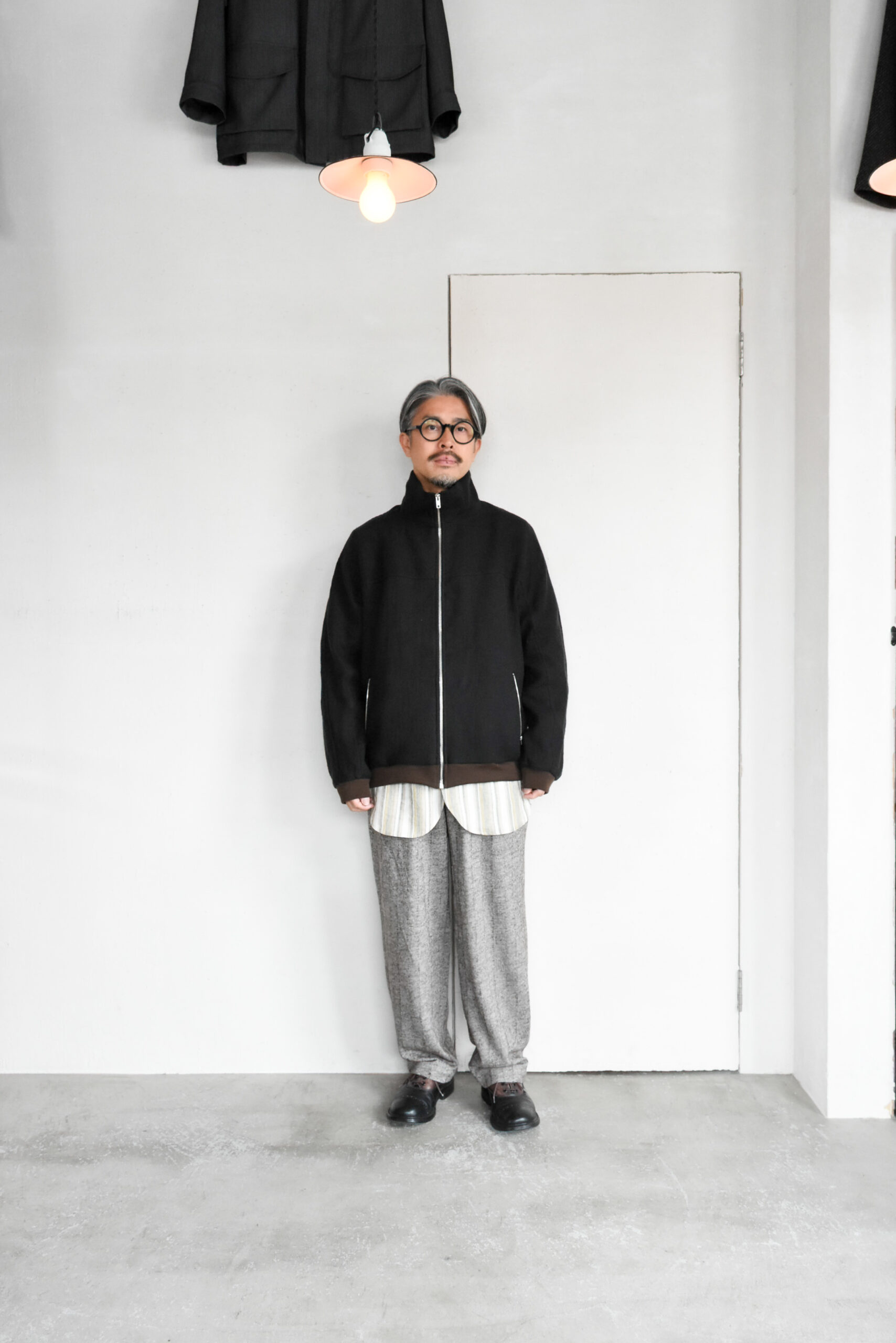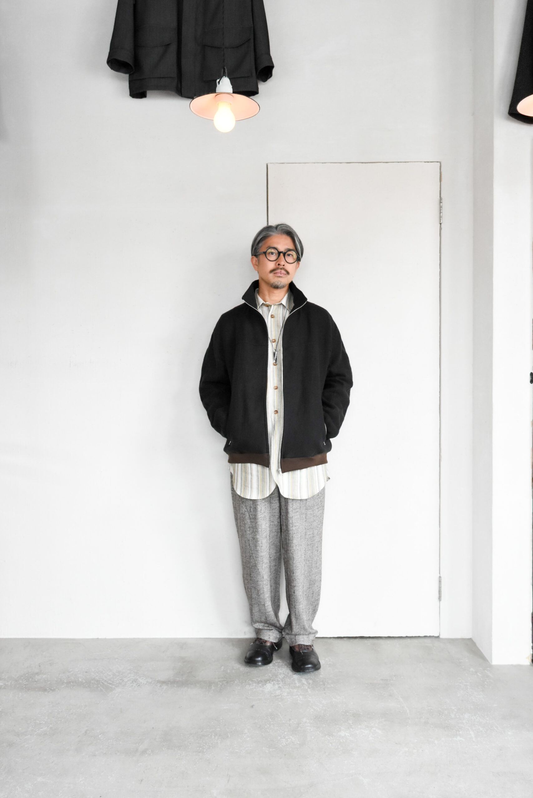 ゆったりとした設計なのに、縦にすっと落ちるラインが美しい Washed Wool のジップアップシャツ。