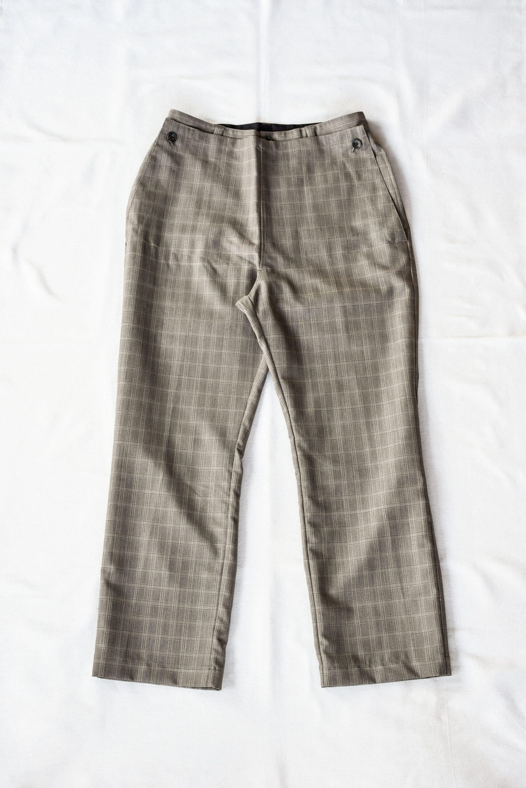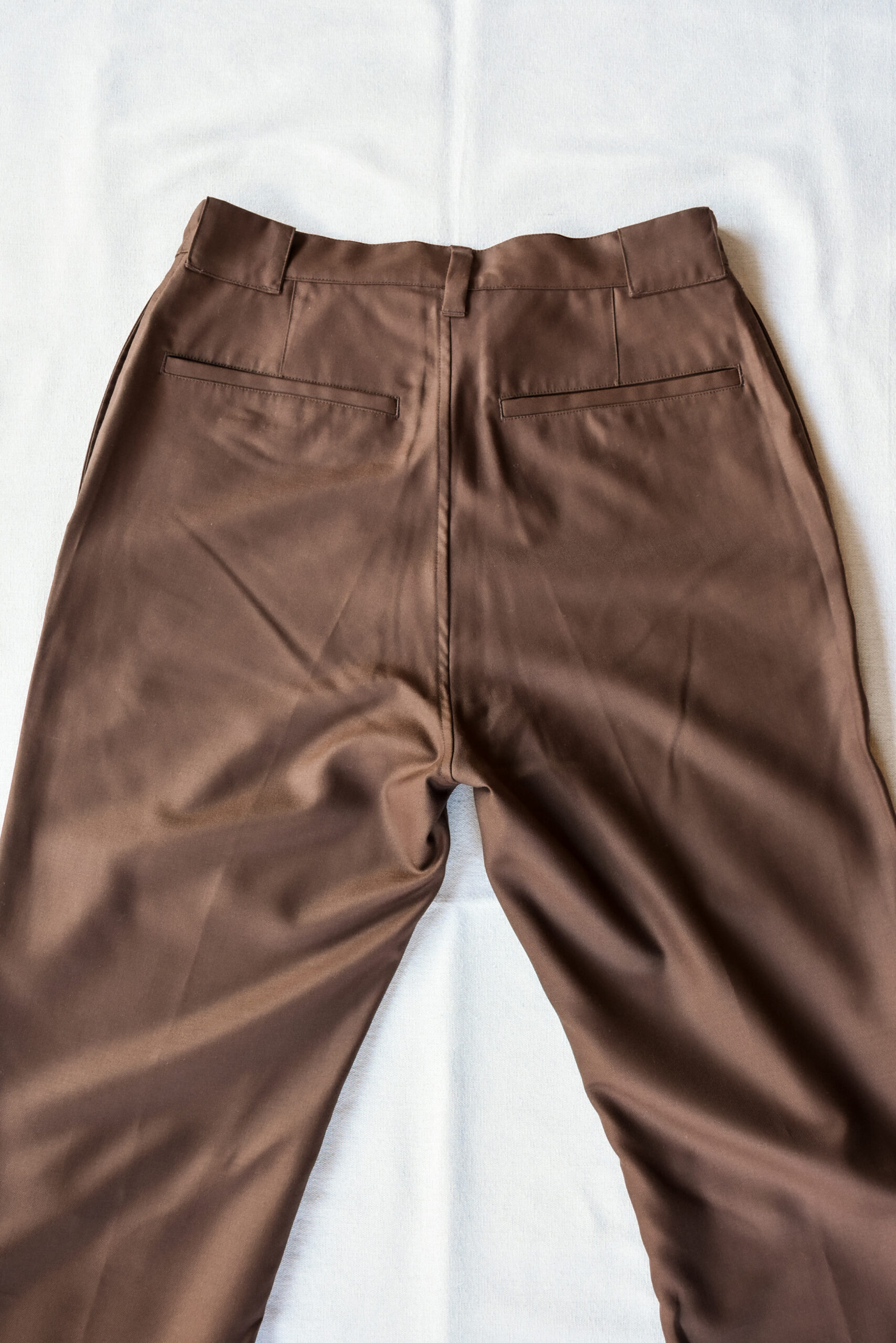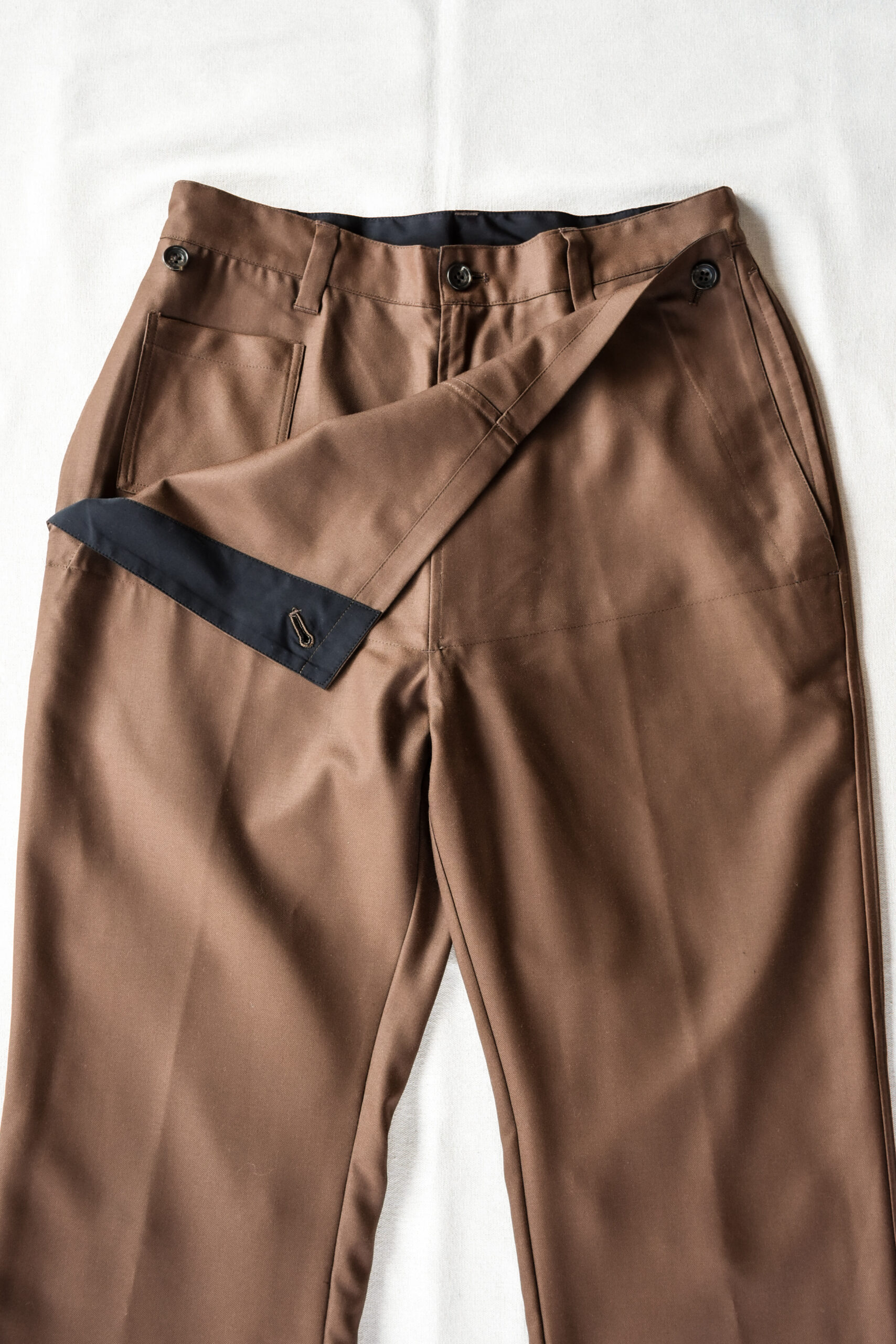 エプロンを下ろすと右側だけに現れるポケットや、後ろ姿のすっきりとした上品さなど、軍パンとスラックスの“いいところ”が自然に重なっています。