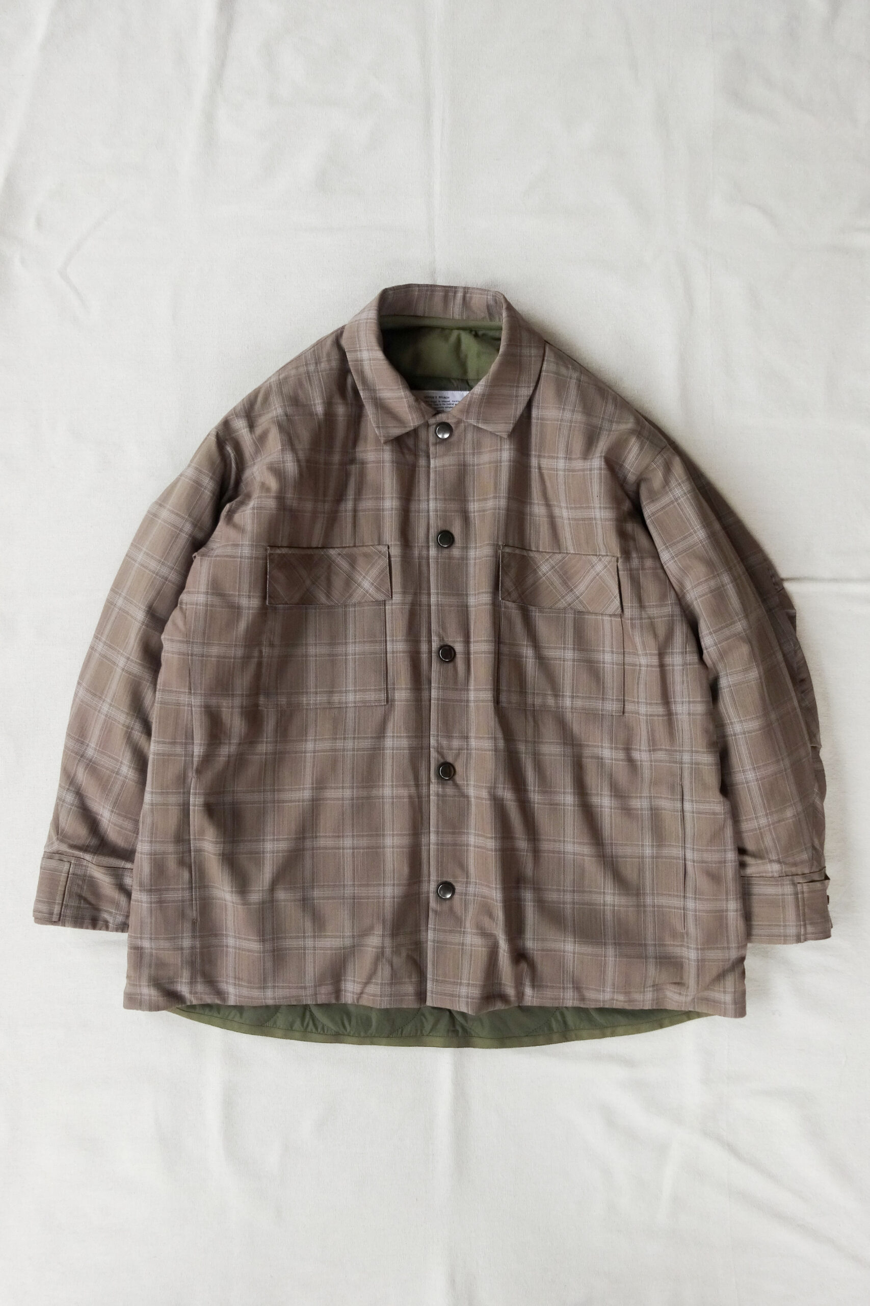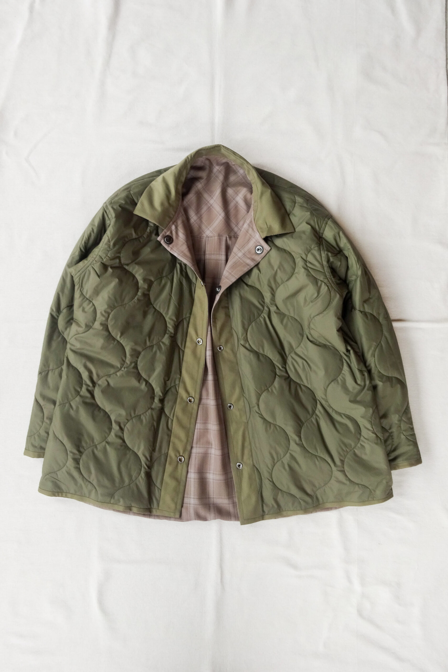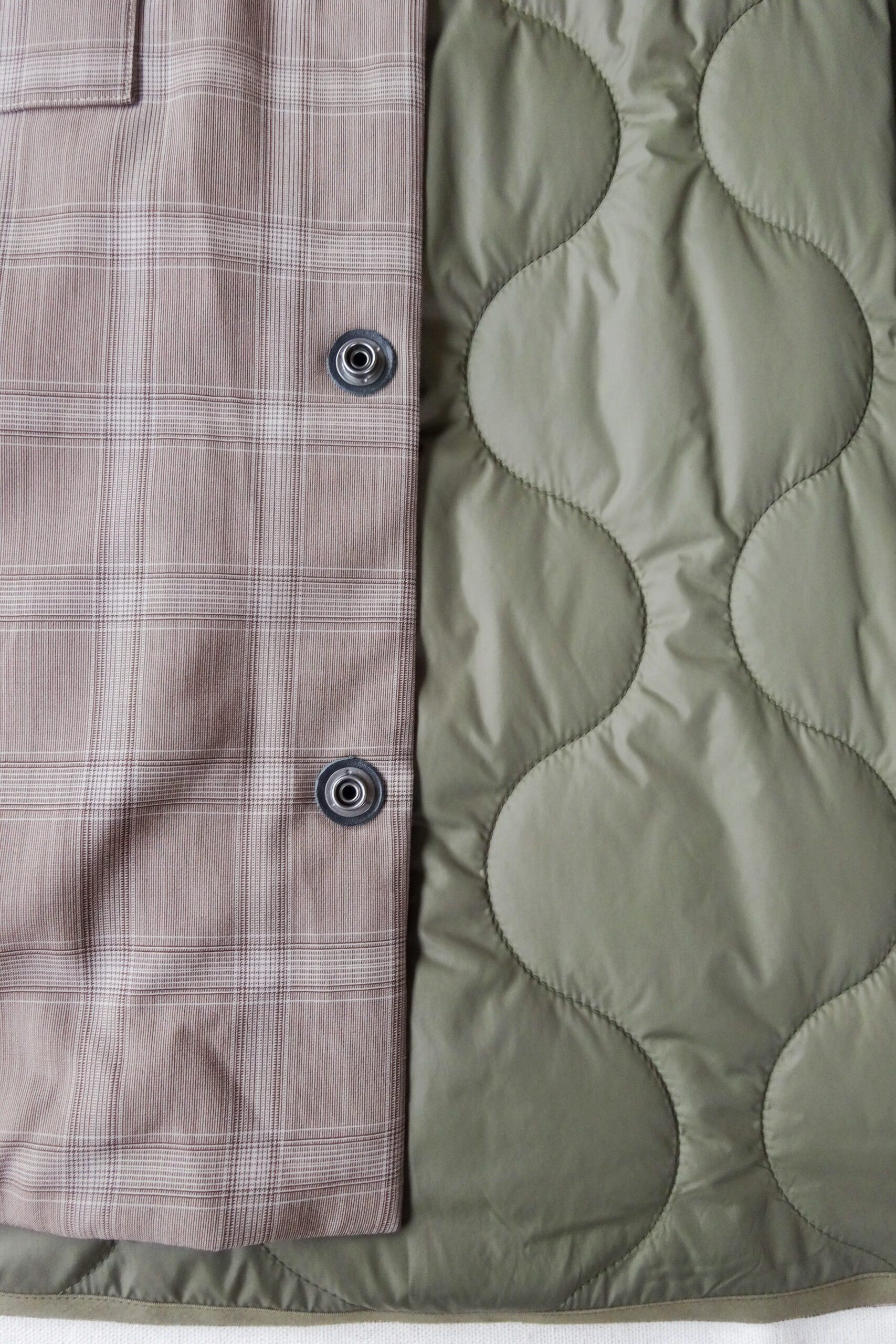 チェック面はスーパー140’sウールを使ったまろやかなベージュ×ブラウン、裏面は光沢を抑えたオリーブのオリジナルキルティング。