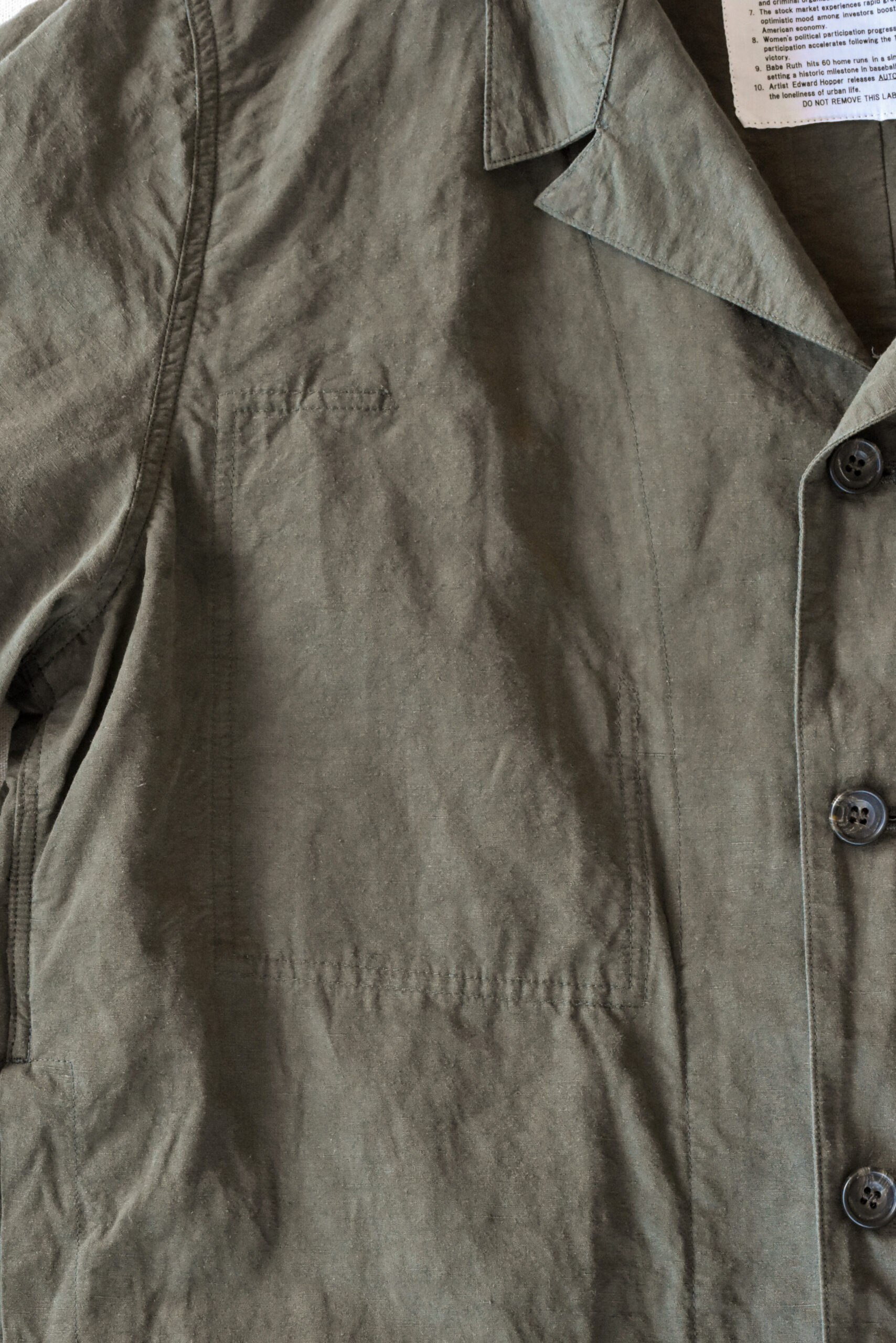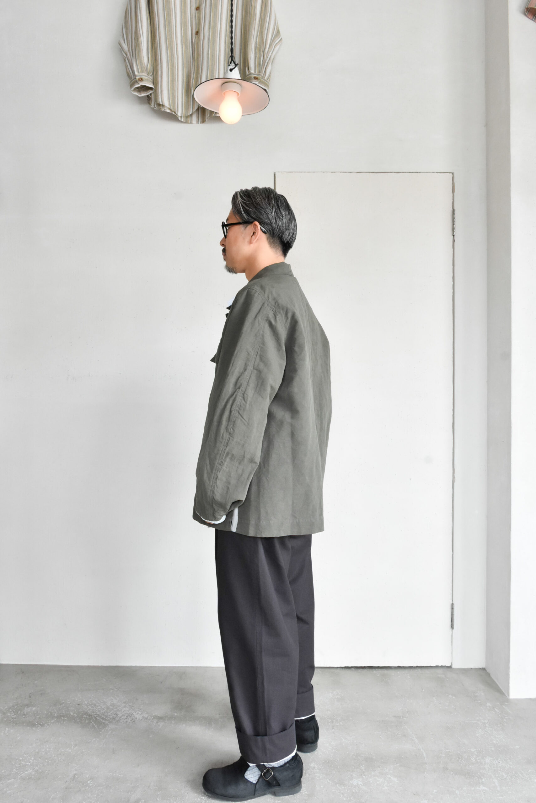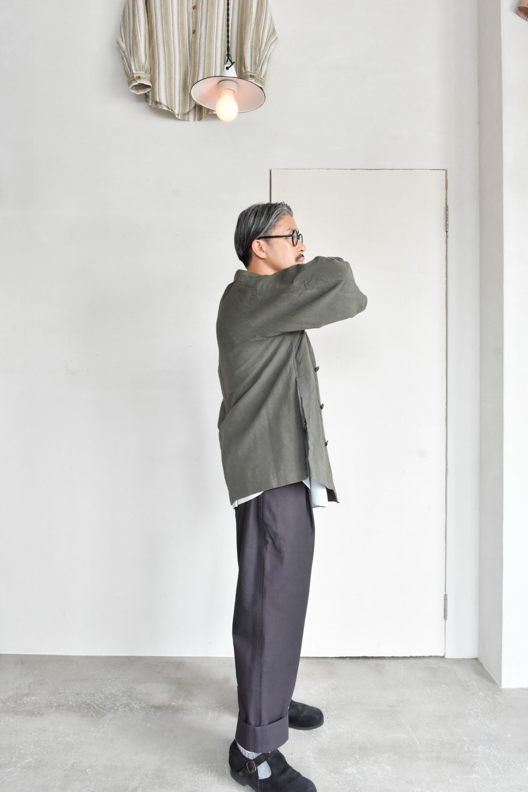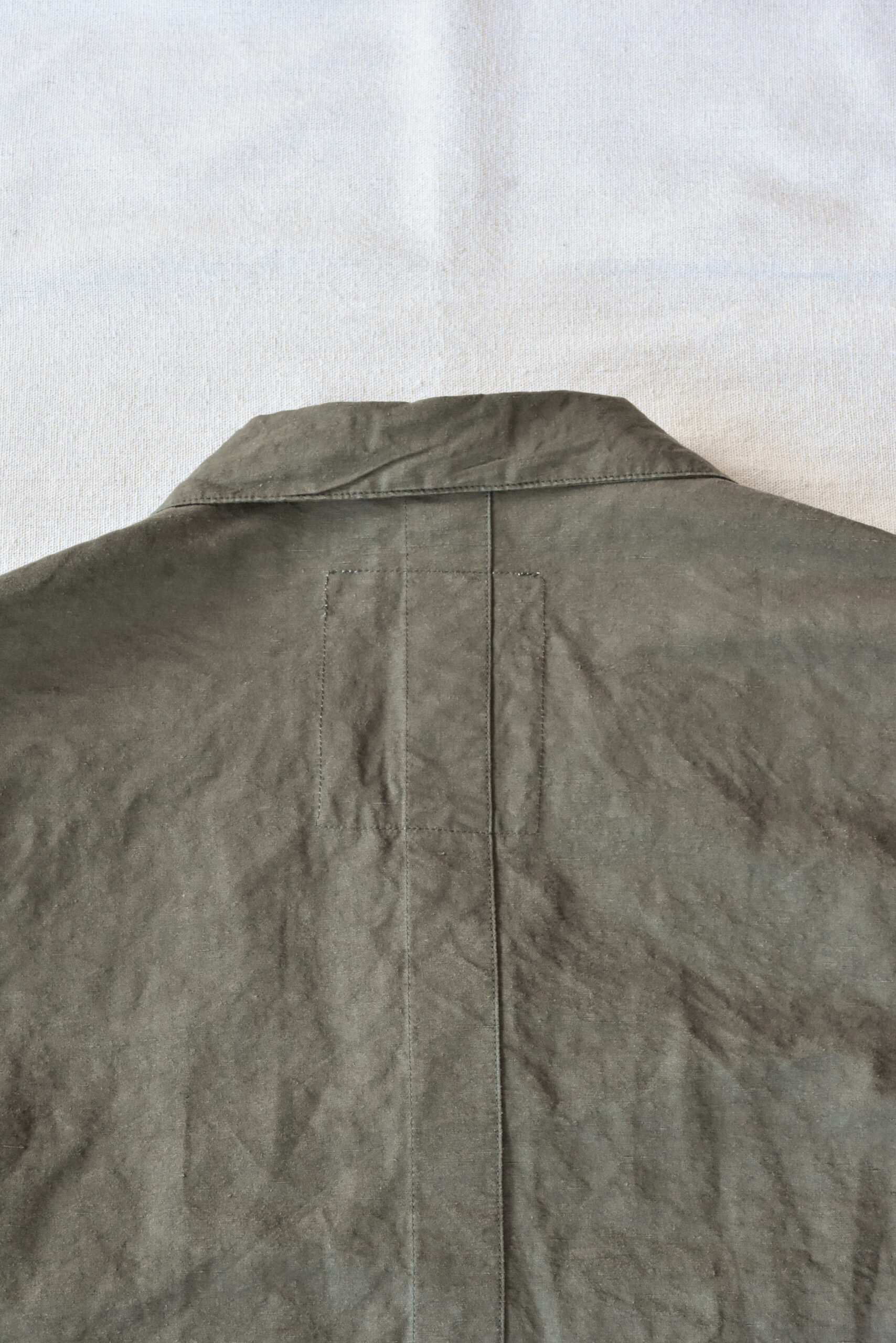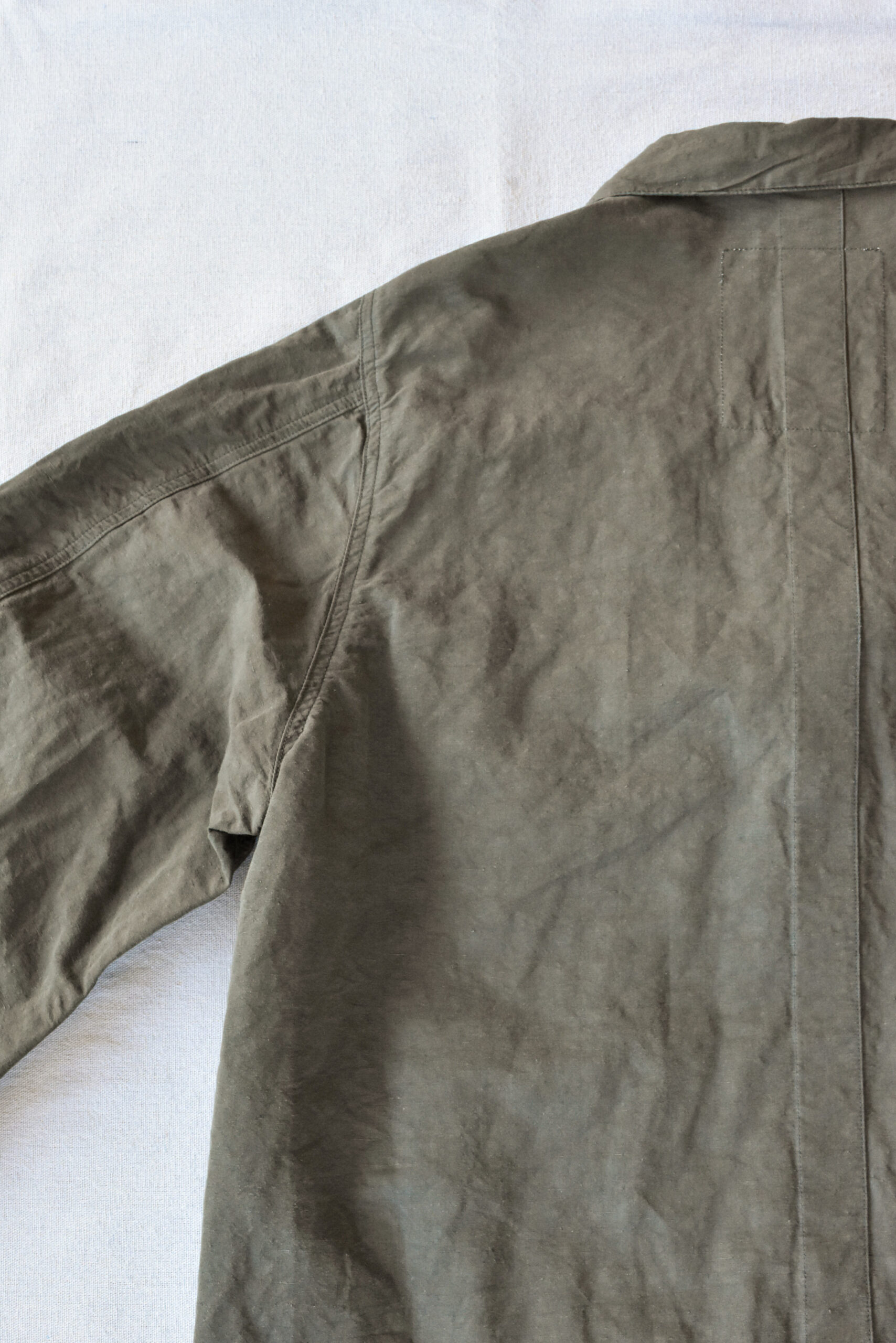 身幅にゆとりを持たせたリラックスシルエットに、自然な腕の振りを意識した立体的な袖、そしてあえて太く取られた背中の縫い合わせなど、見た目のシンプルさの中にも作り込みが感じられます。