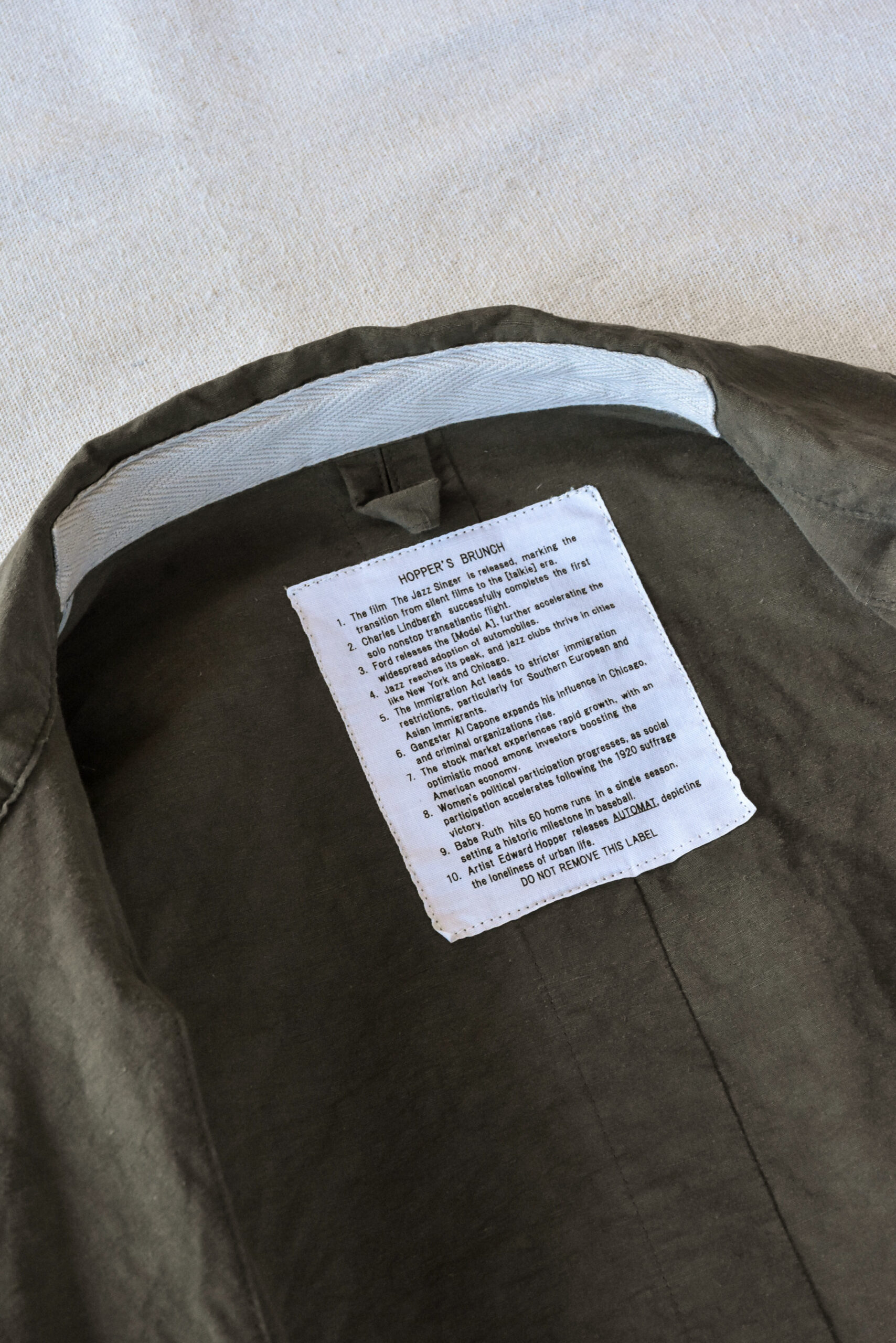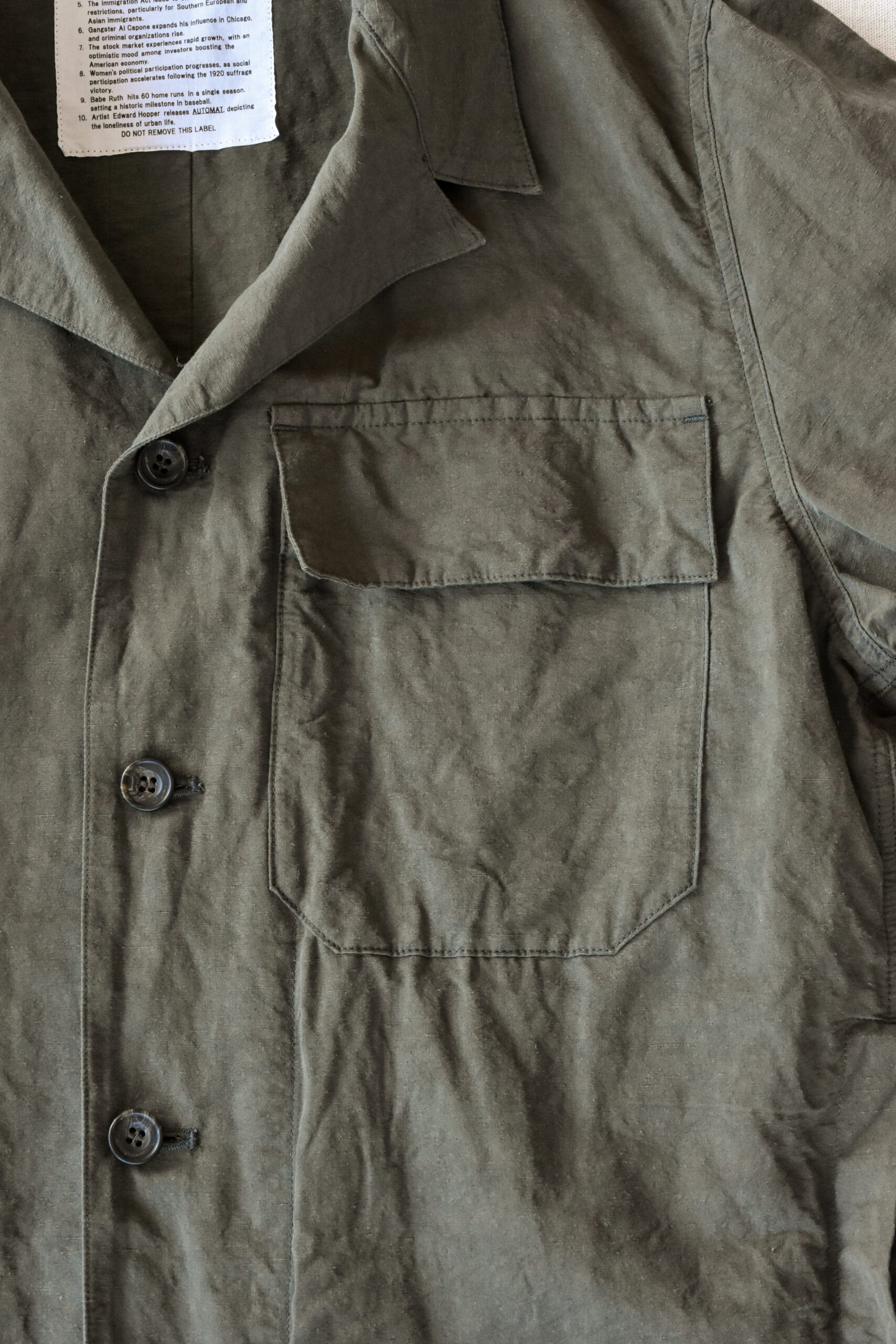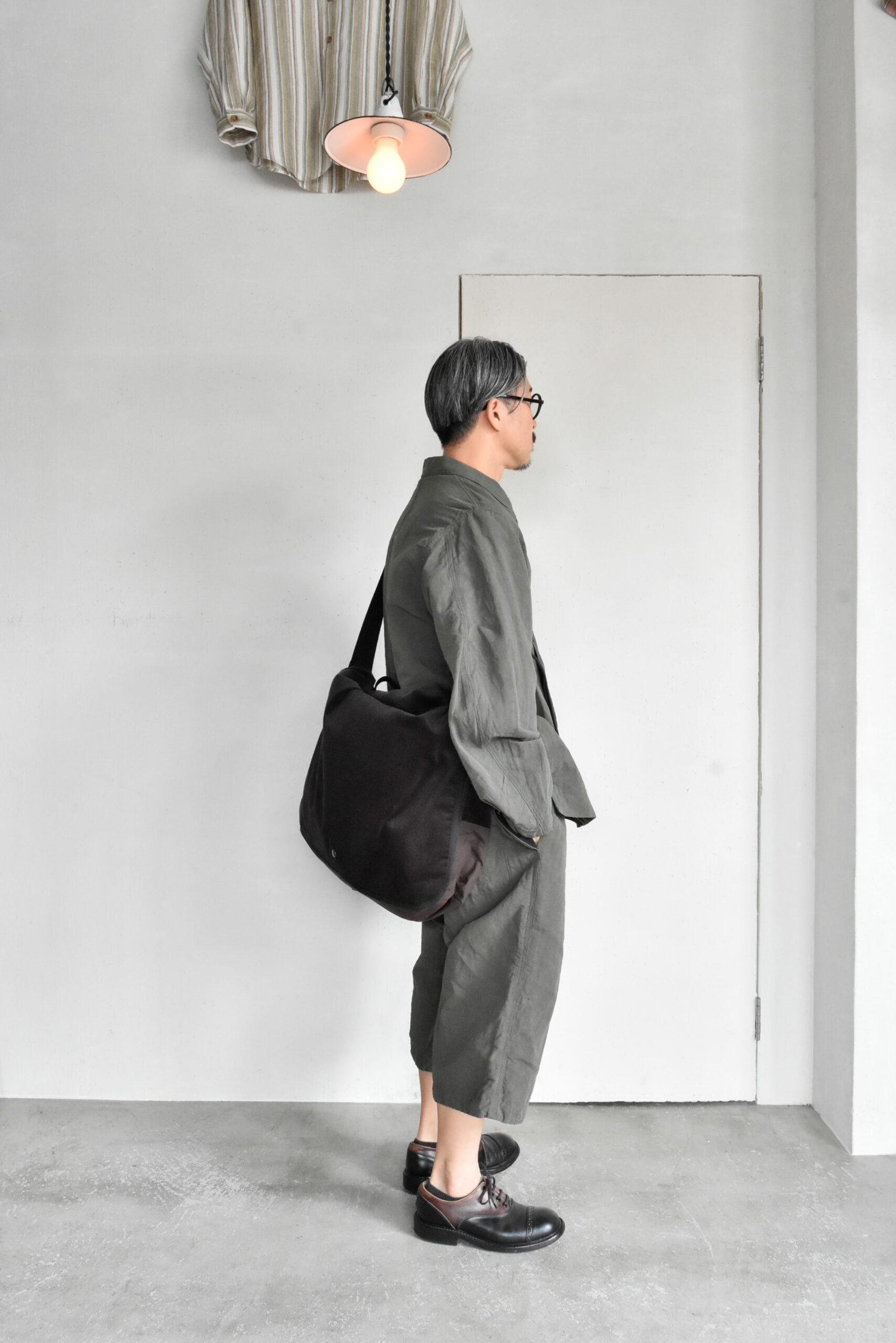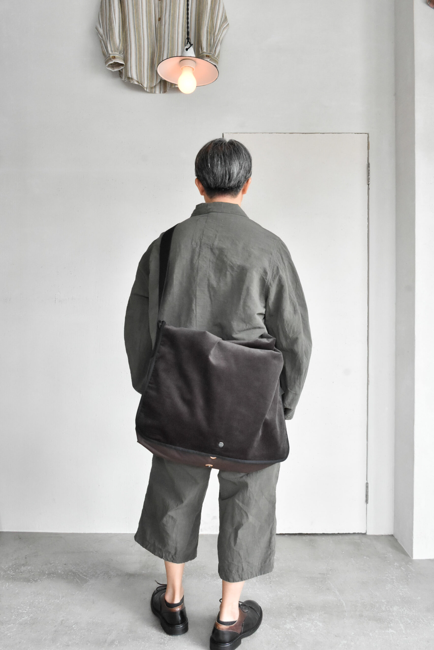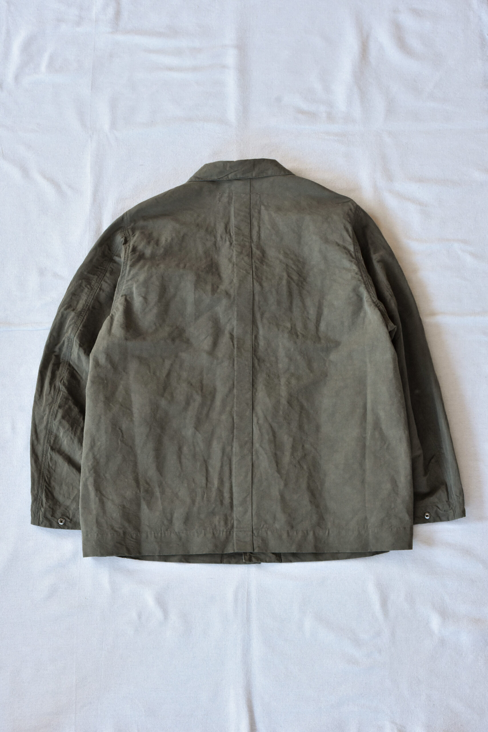 身幅にゆとりを持たせたリラックスシルエットに、自然な腕の振りを意識した立体的な袖、そしてあえて太く取られた背中の縫い合わせなど、見た目のシンプルさの中にも作り込みが感じられます。