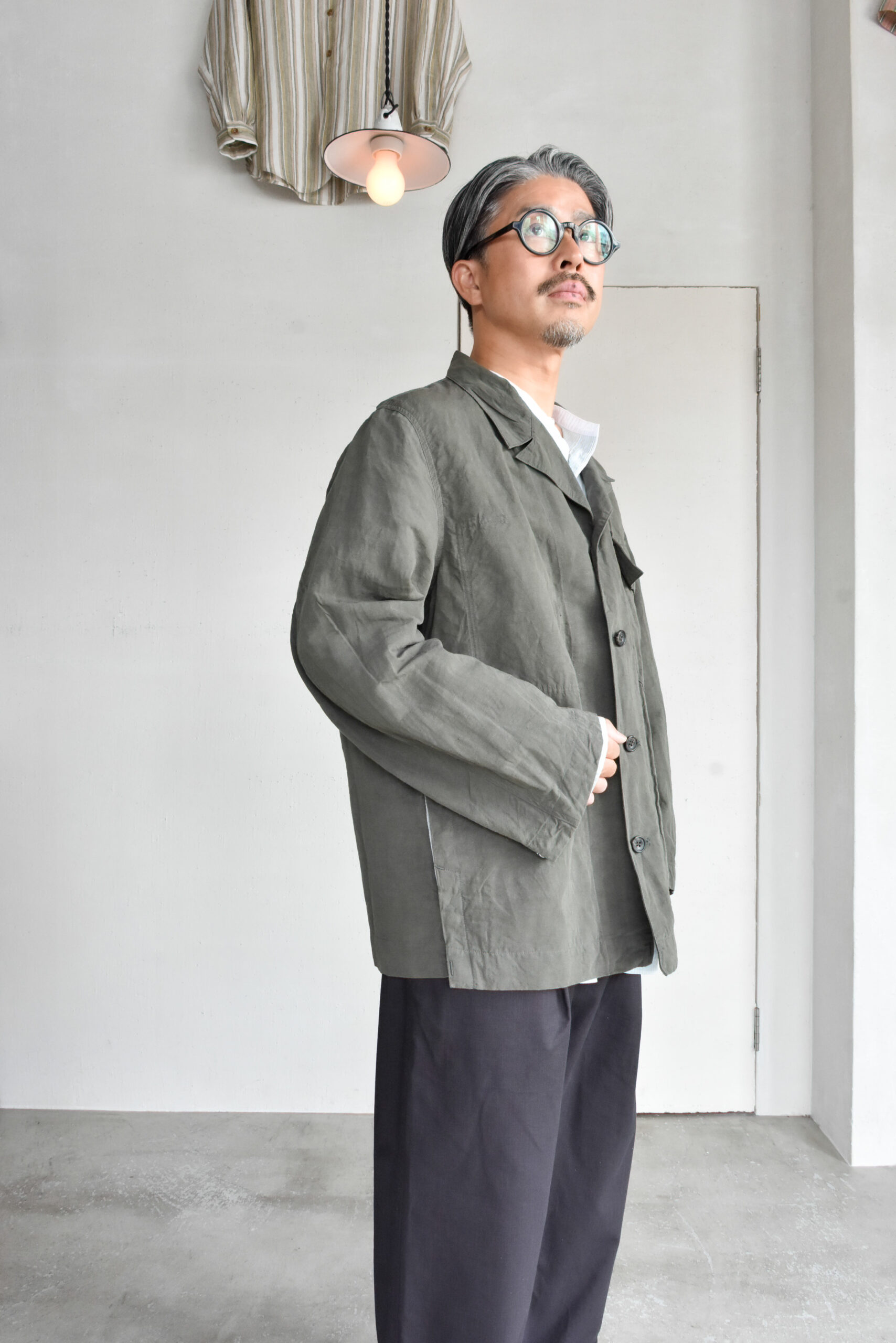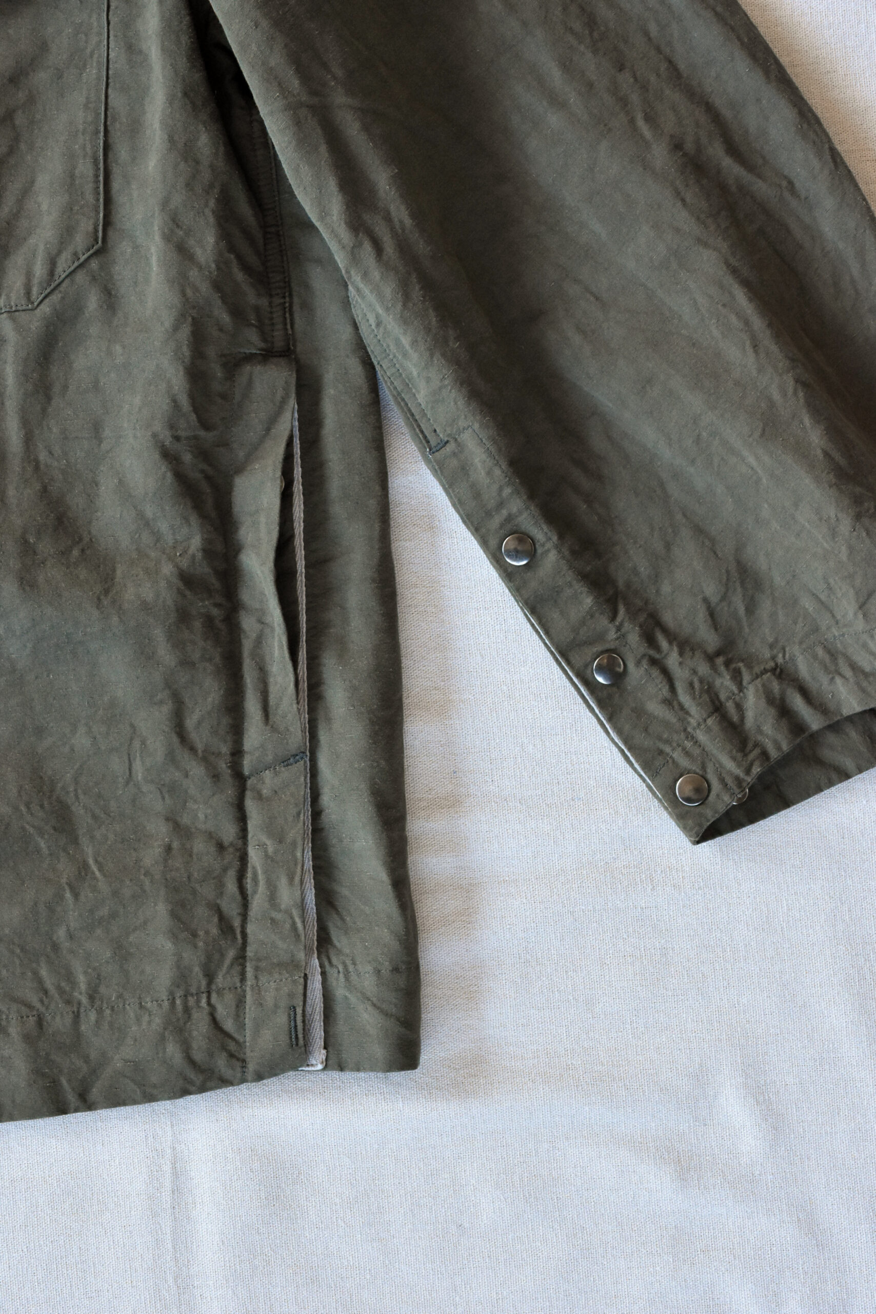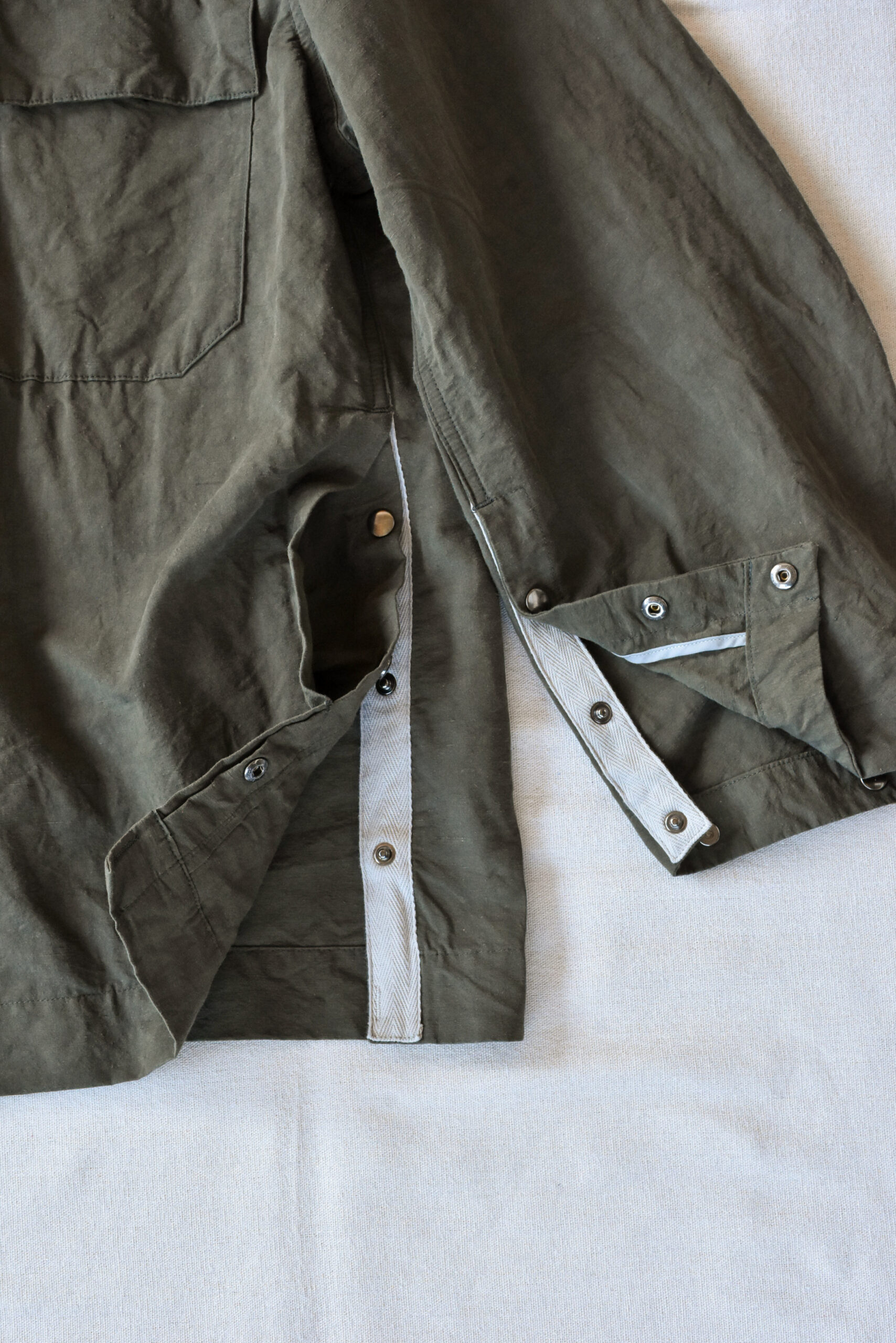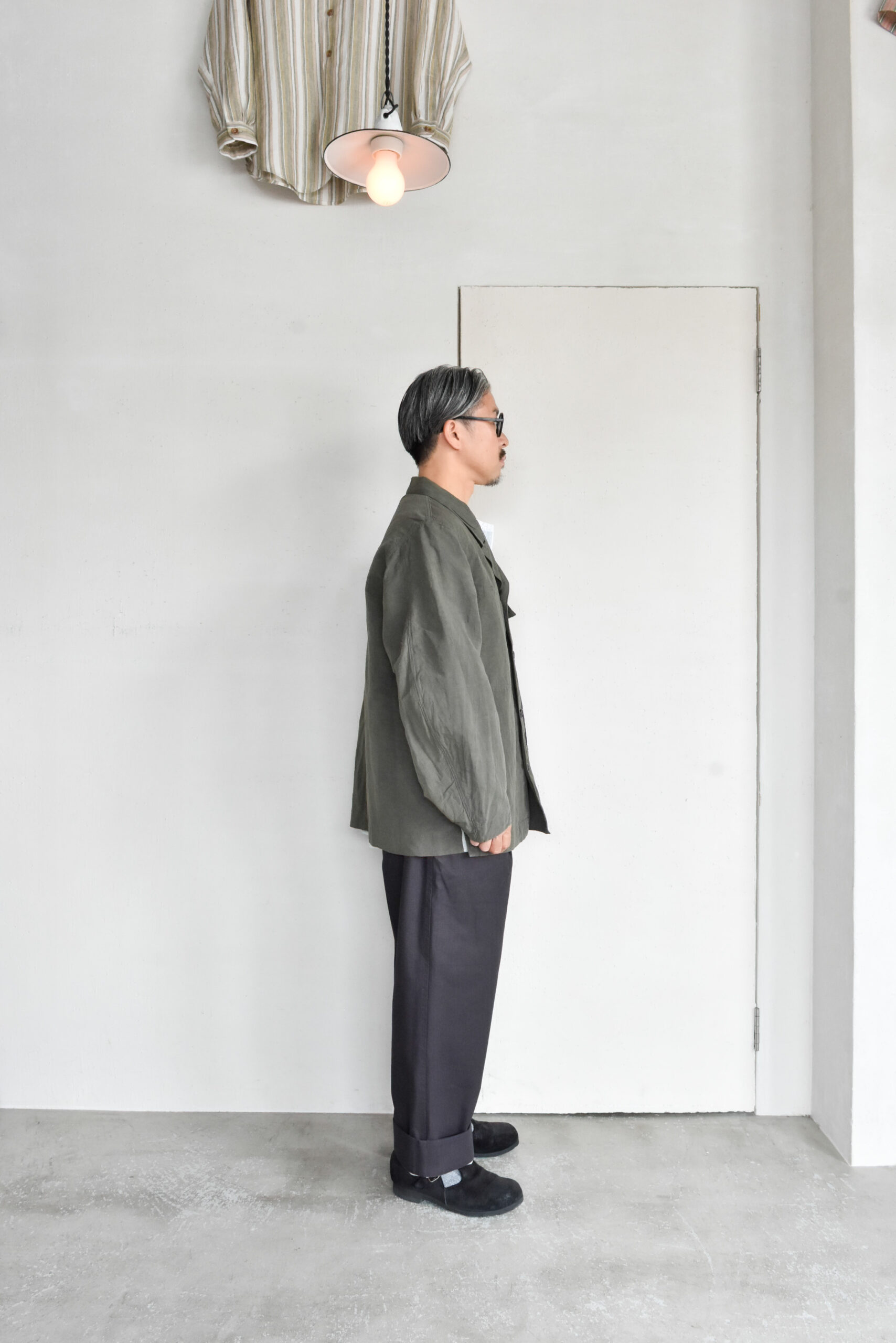 生地は、ドライタッチで奥行きのある色味が魅力のコットンリネンのオリーブと、ほのかな光沢とシャリ感を持つコットンナイロンのネイビーの2種類。