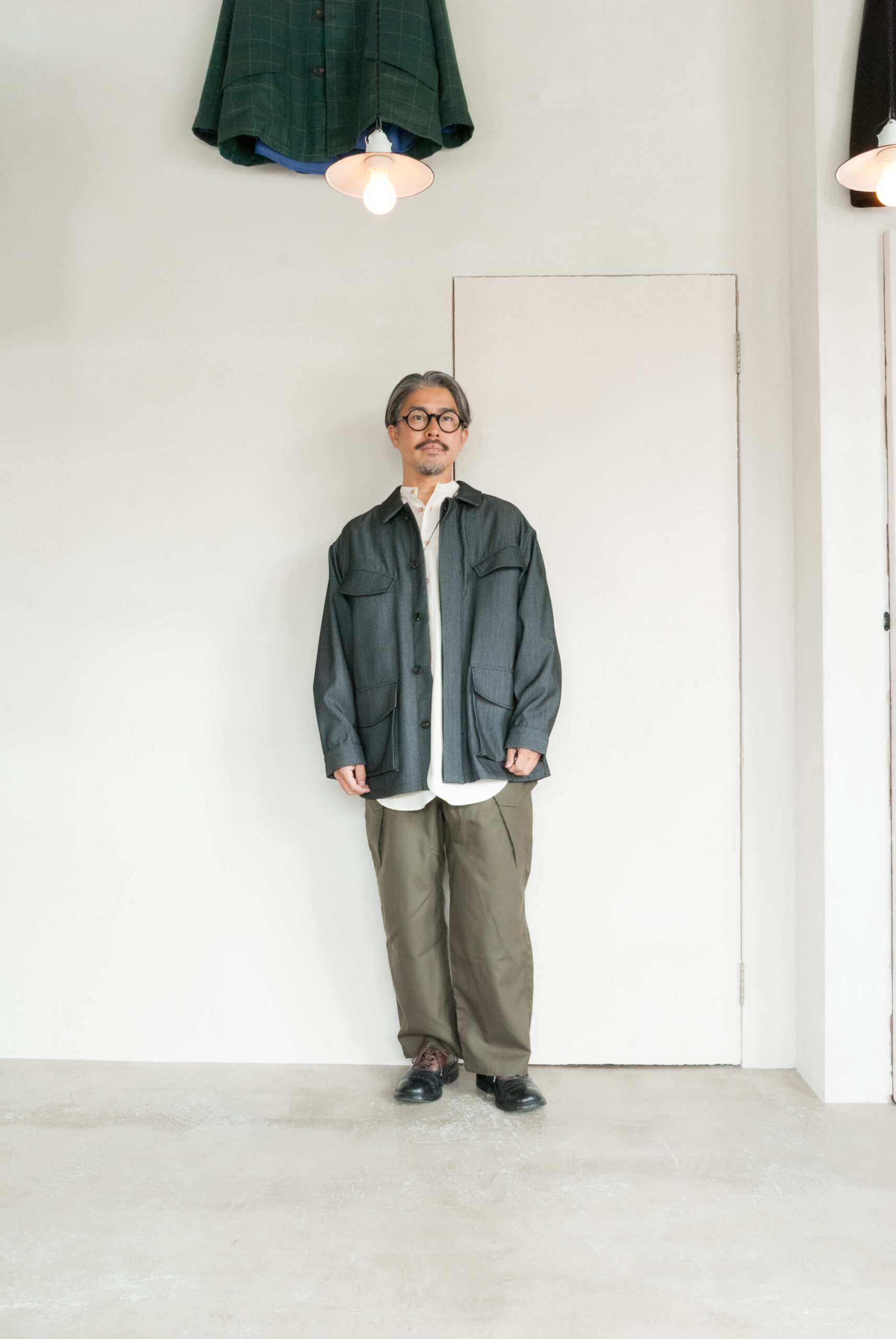 アメリカ軍のB.D.U Jacketやフランス軍のM47 Field Jacketをミックスした、ややオーバーサイズ気味のシルエットだが、艶っぽい生地の表情とこの素材ならではの落ち感で、リラックスして着れるのにラフにならないムードがQUILPらしいところ。