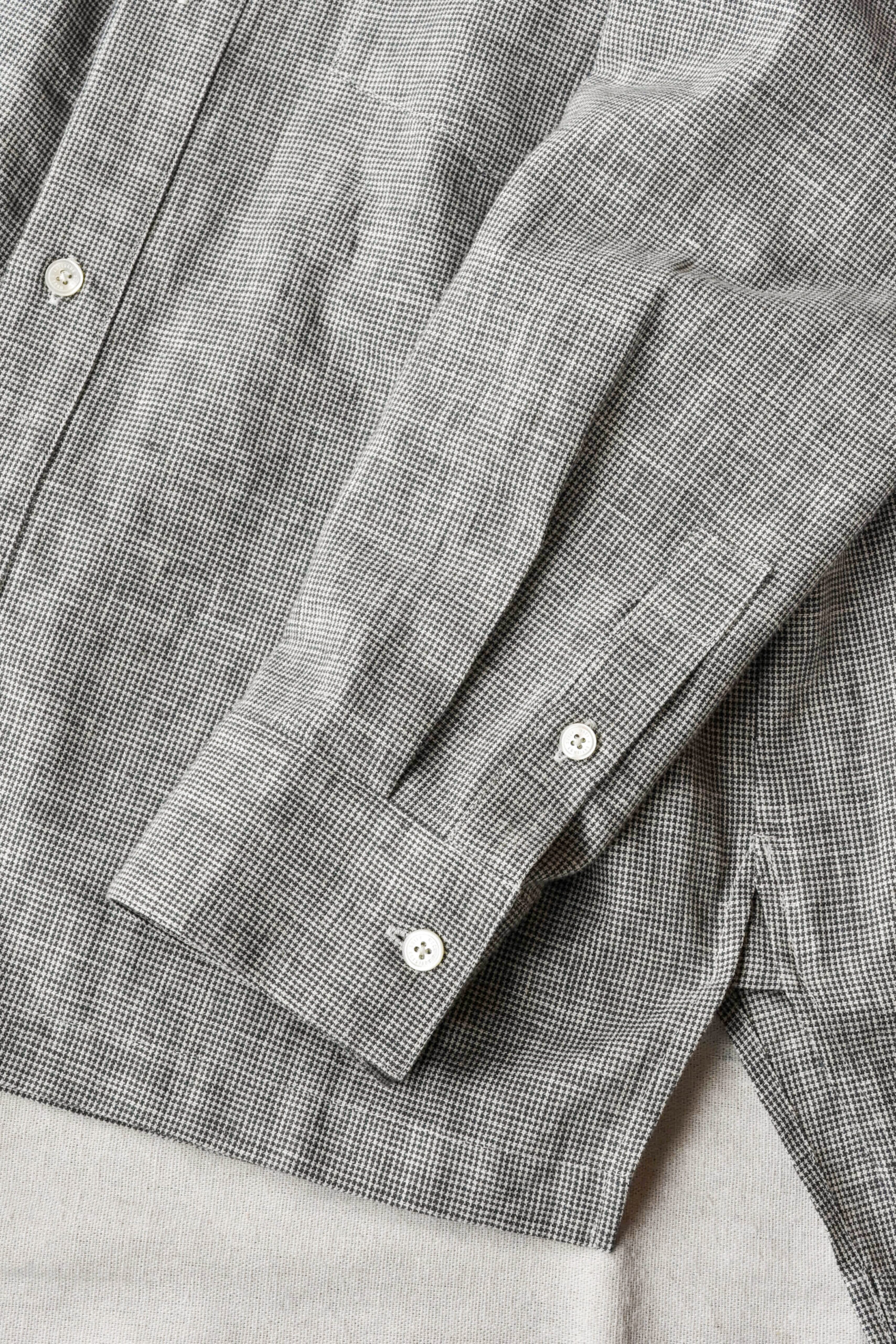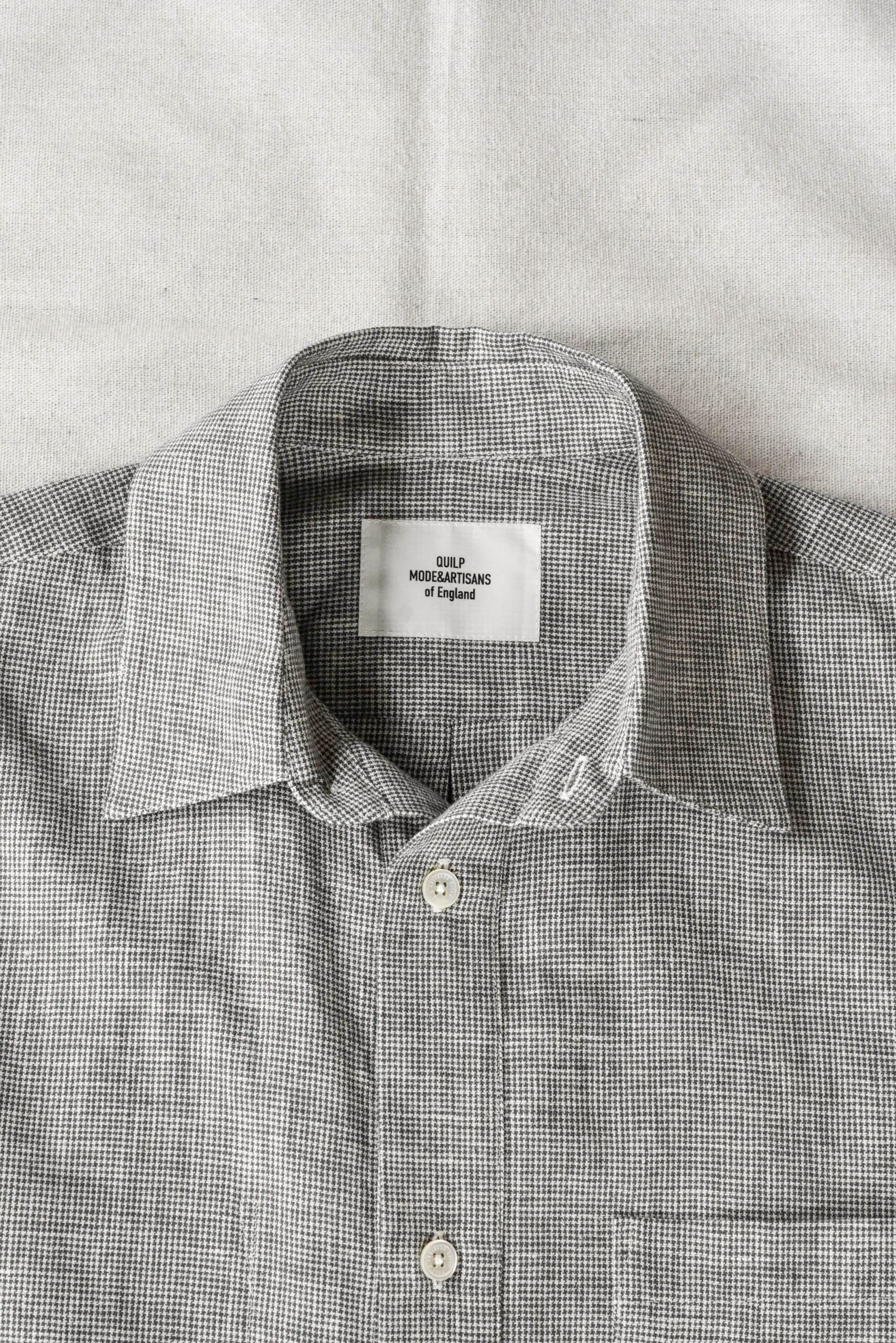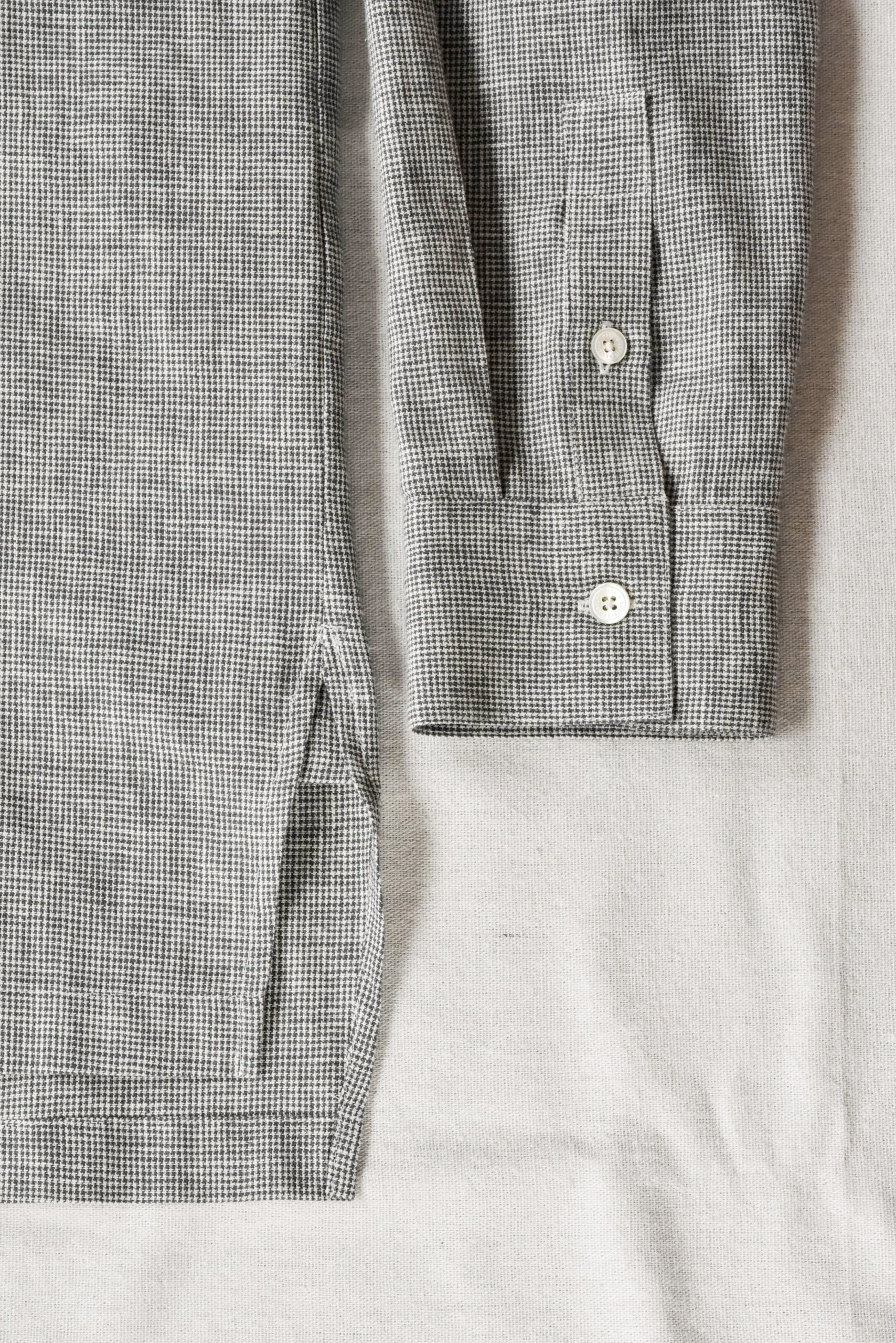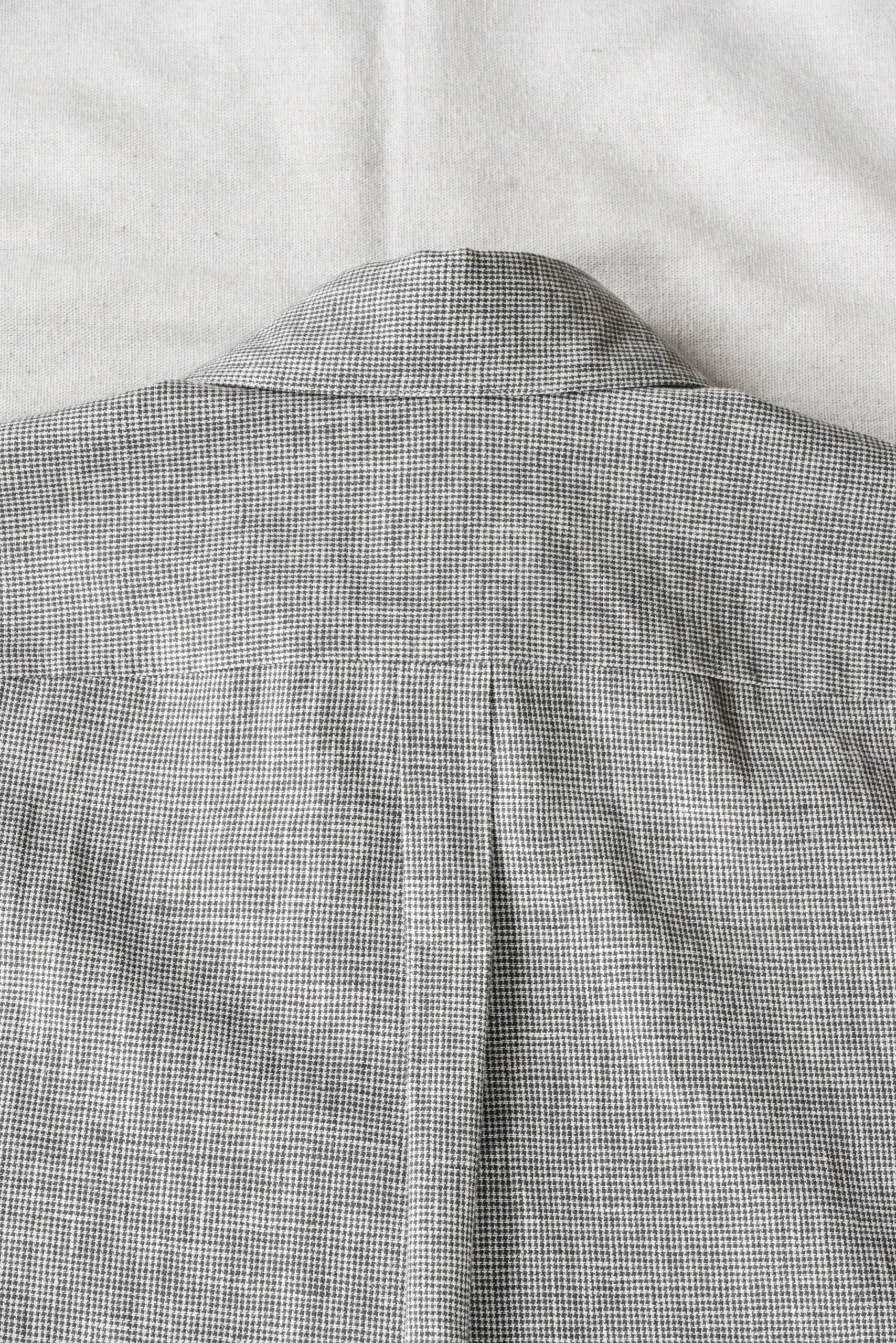 細かなハウンドトゥースが、近くでは柄として、離れると淡いグレーの無地のようにも見える。