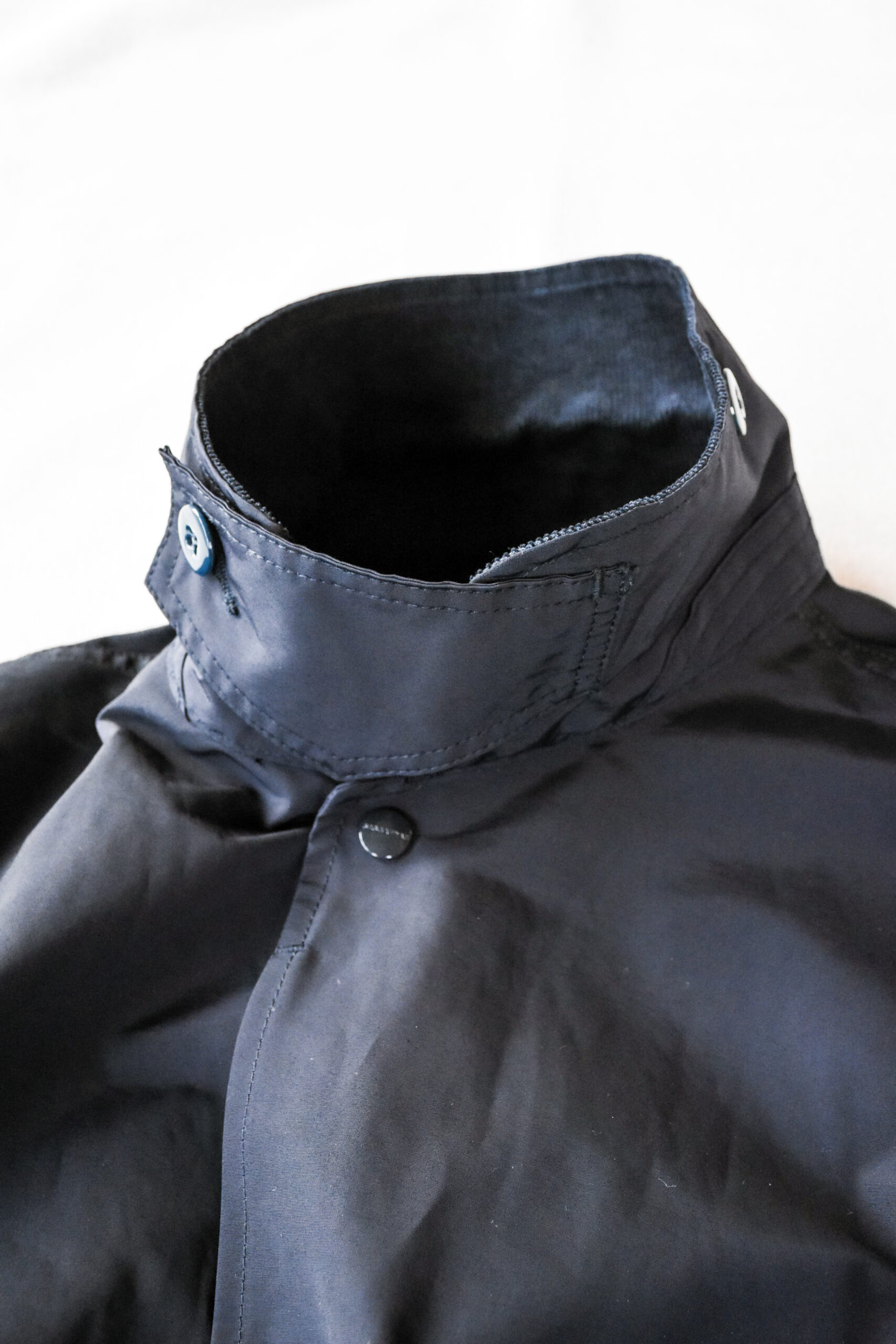 立てても寝かせても機能する襟とスロートタブは、寒さを防ぐためというより、自然な所作として首元に収まり、どちらにしても無理なく様になります。