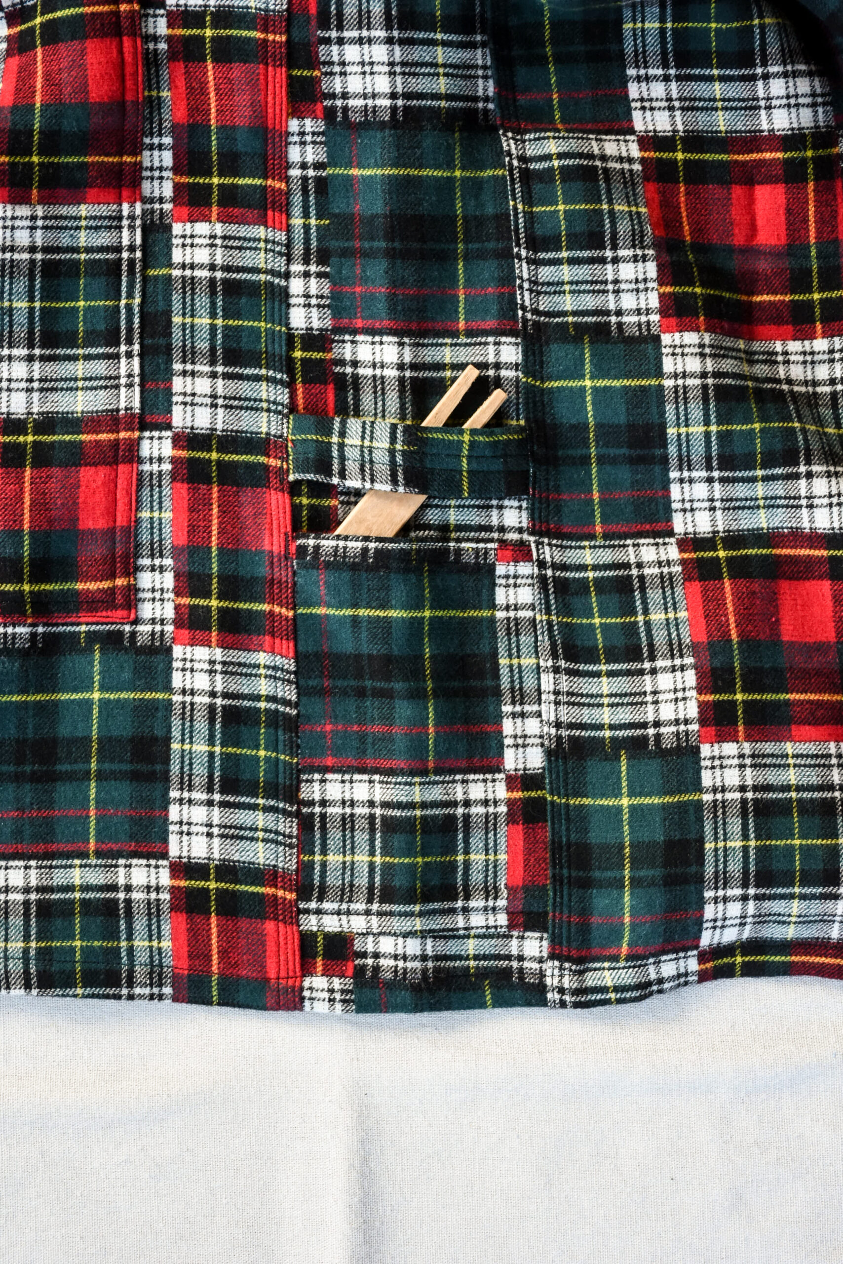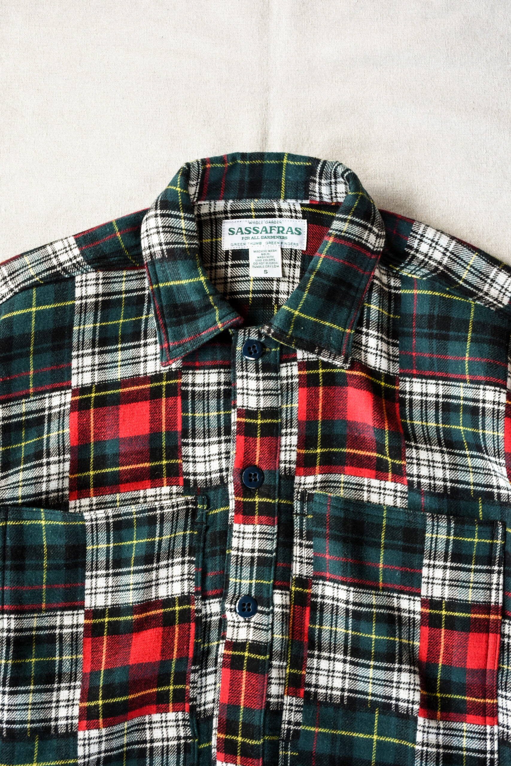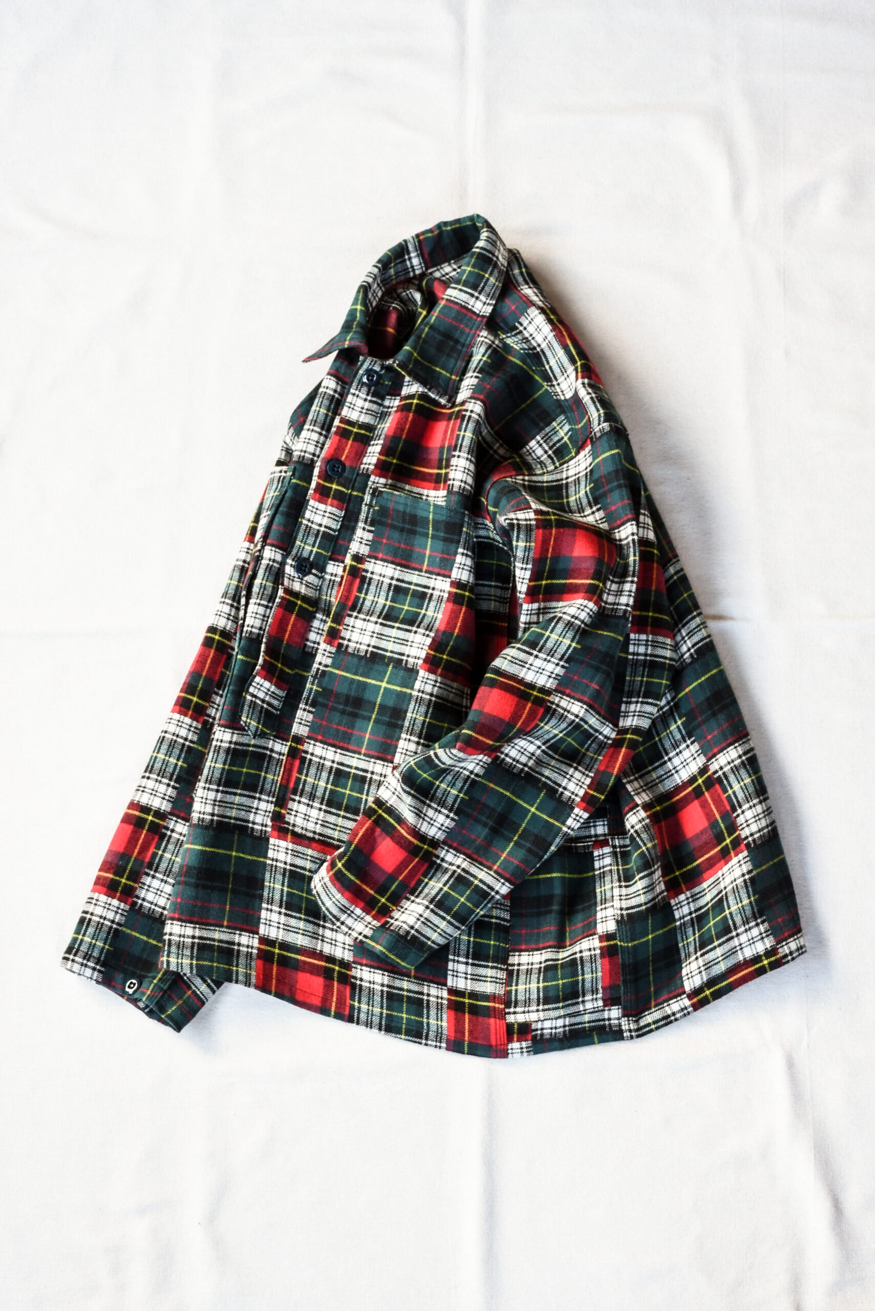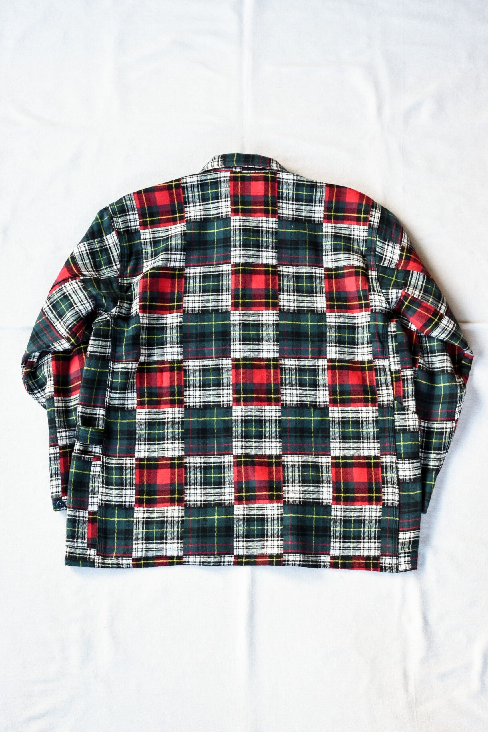 クラシックな柄とゆとりあるボックスシルエットの対比が新鮮で、接結コットンフランネルの軽さと厚みがちょうど良く、シャツとジャケットの中間のように扱える一枚です。
