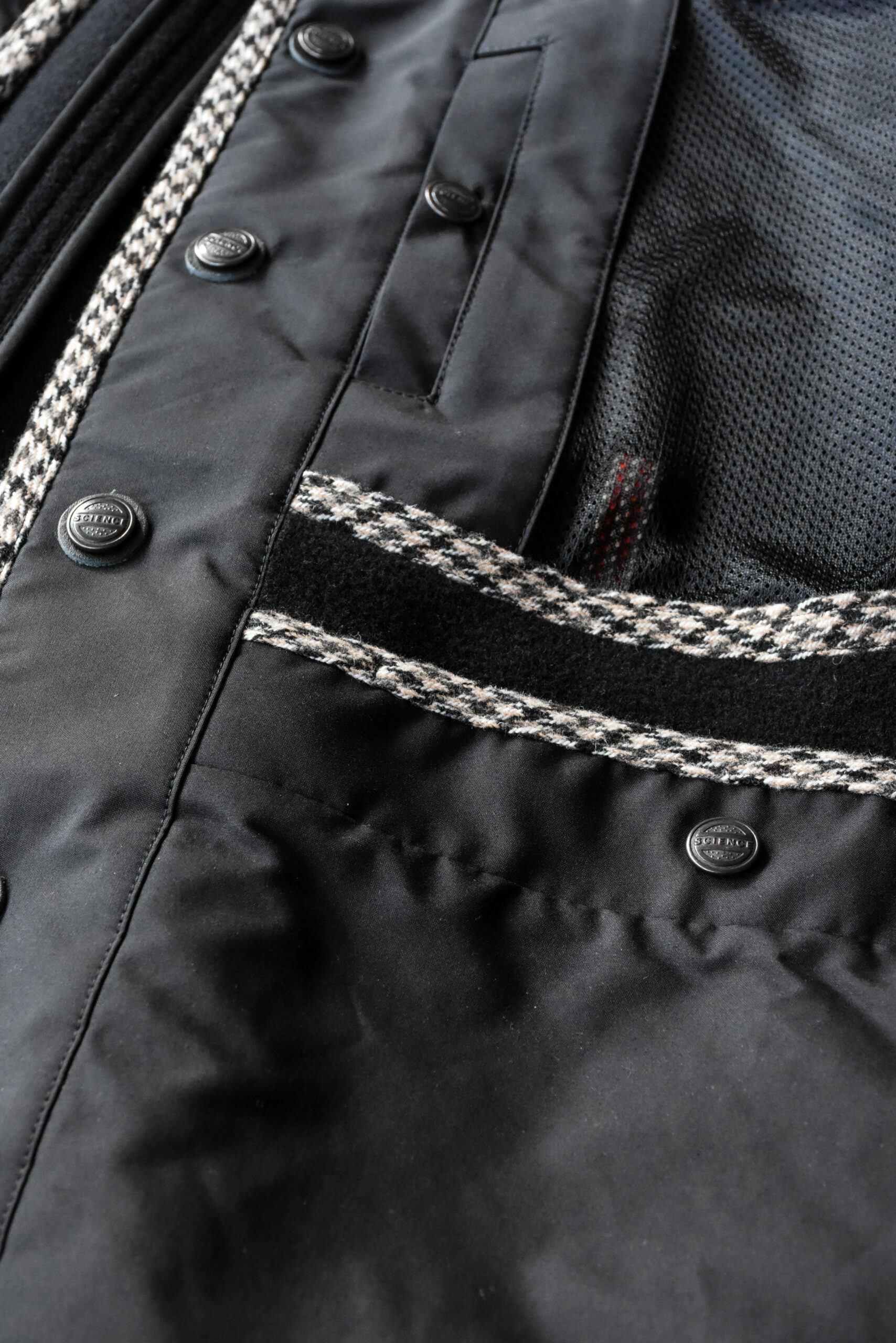 例えば、ライニングの縁を彩る伝統的なハウンドトゥース(千鳥格子)のパイピング。